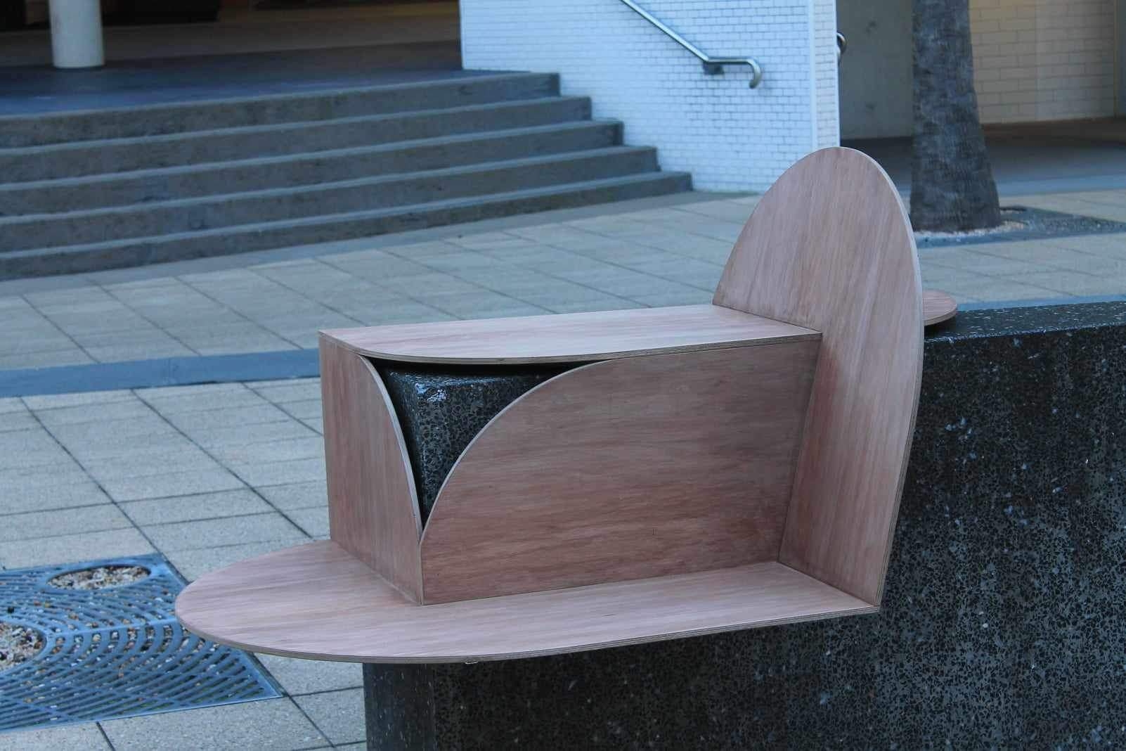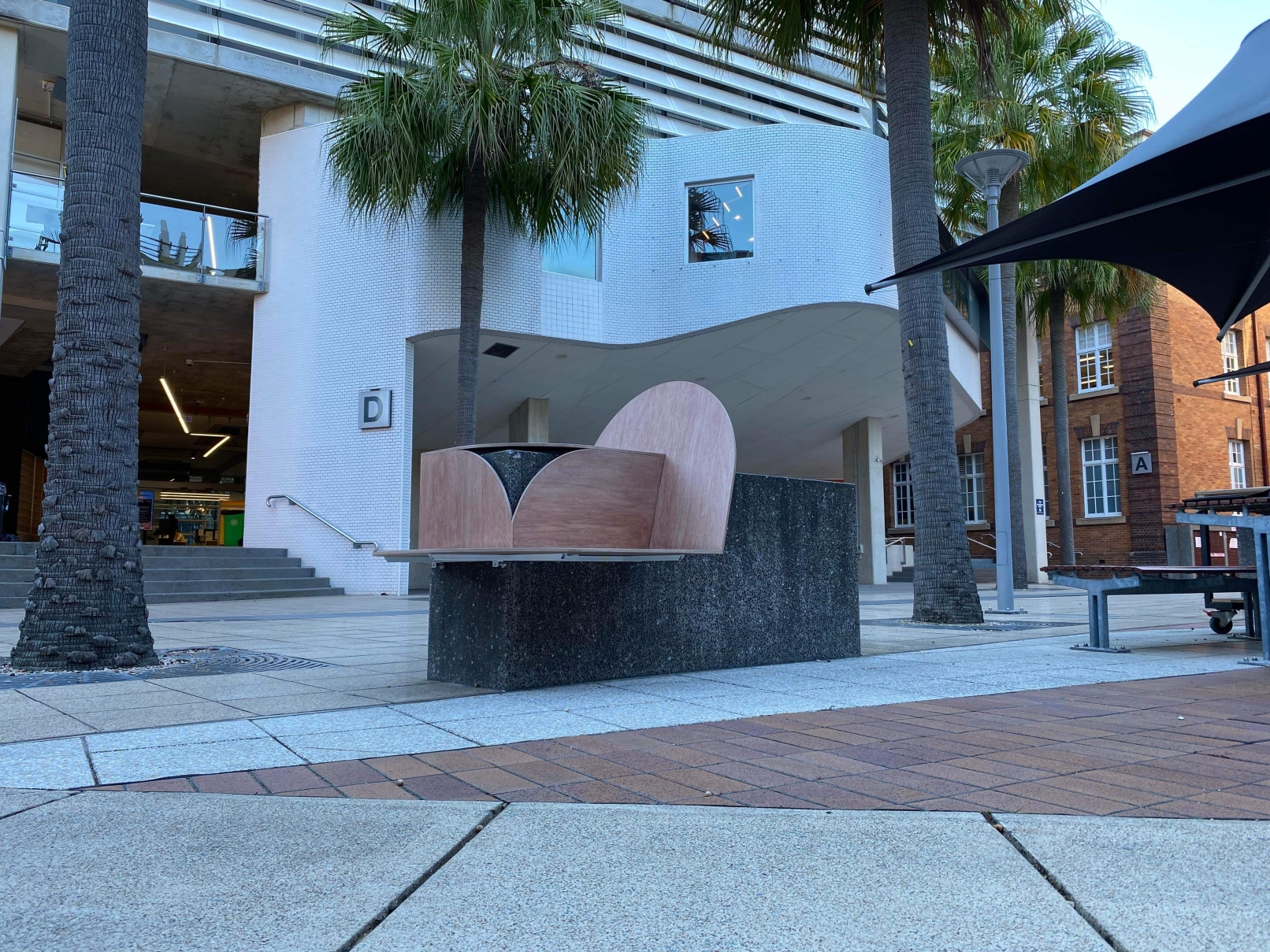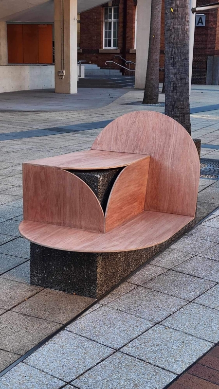Gravity Bench is an urban intervention entwined into its surroundings and adapts to the movements of “The Yard” - a space located within QUT Garden’s Point Campus. The furniture piece takes form over the robust granite safety bollards and in contrast, creates softness with arcs cut from Meranti Verneer Plywood.