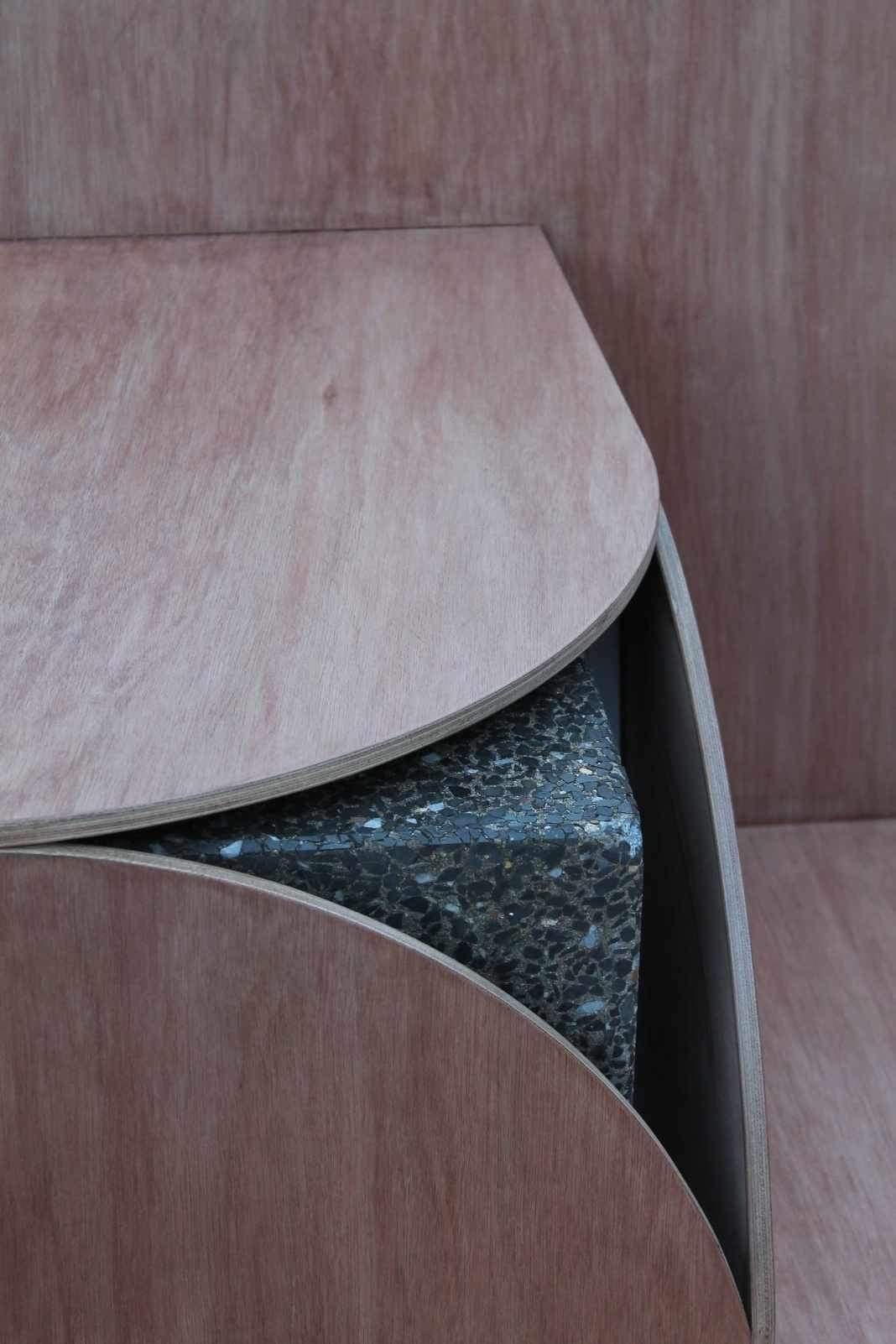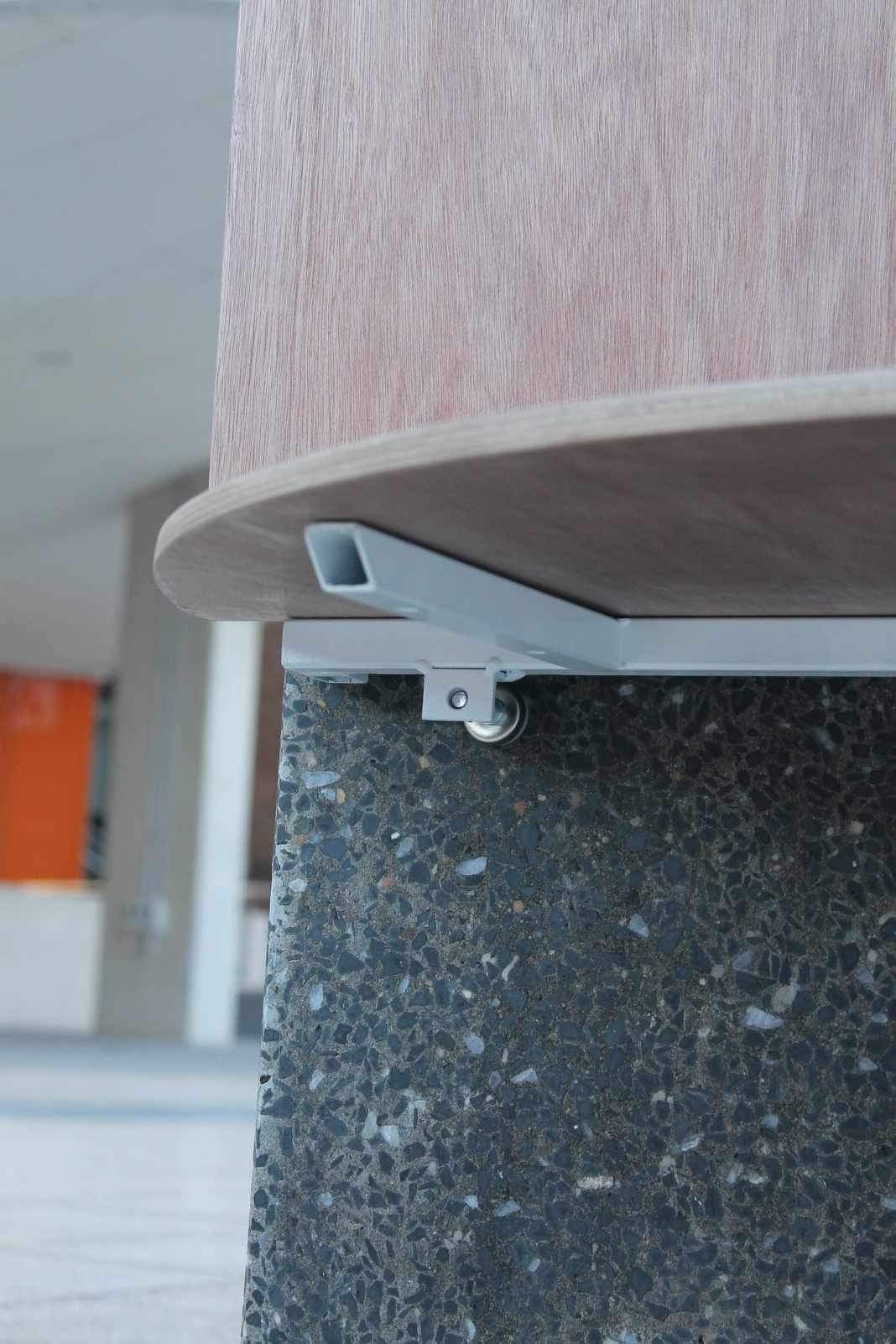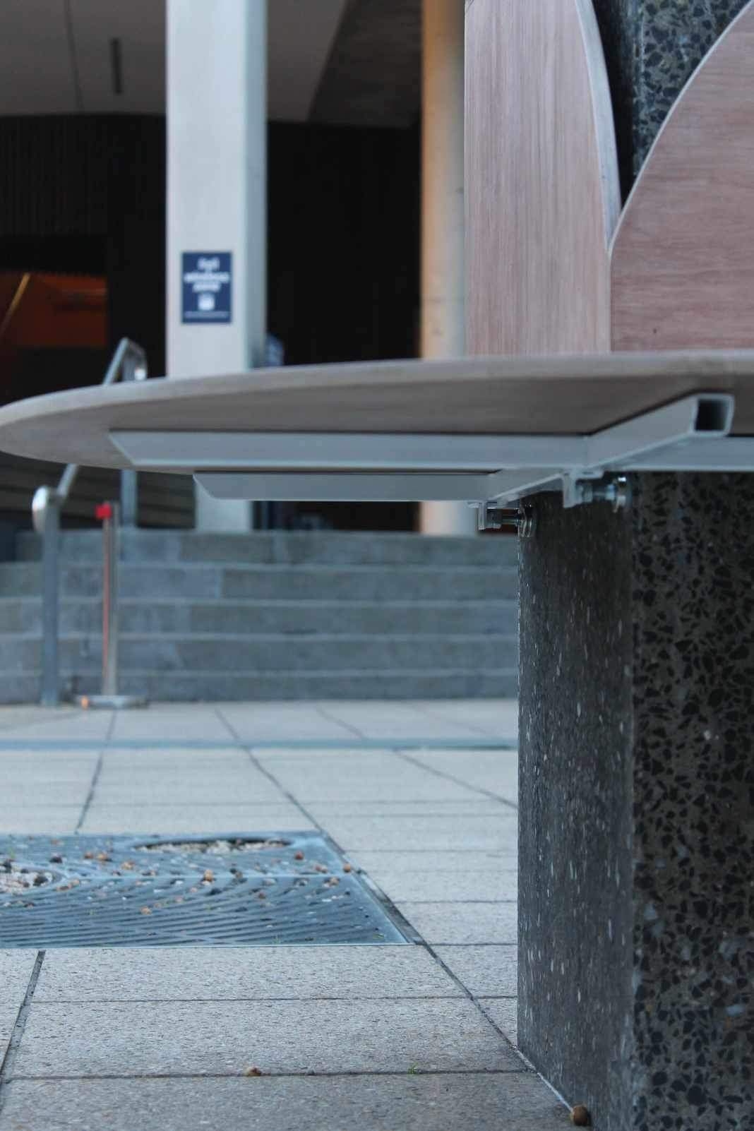 Gravity Bench is an urban intervention entwined into its surroundings and adapts to the movements of “The Yard” - a space located within QUT Garden’s Point Campus. The furniture piece takes form over the robust granite safety bollards and in contrast, creates softness with arcs cut from Meranti Verneer Plywood.