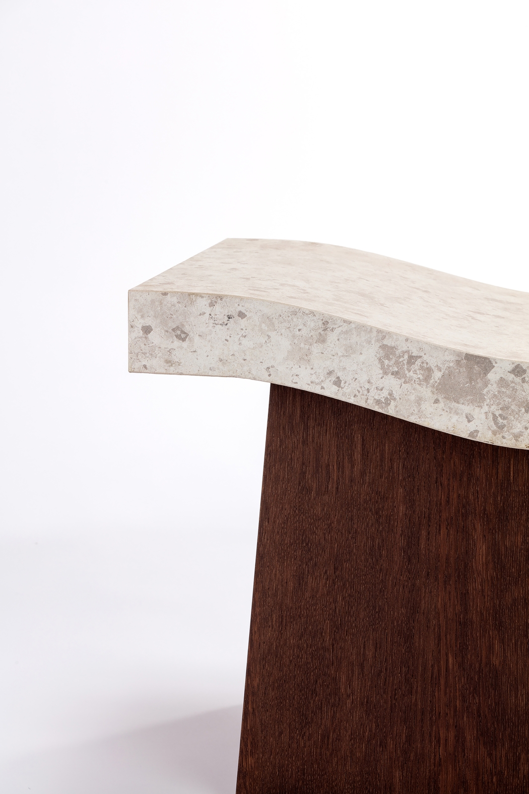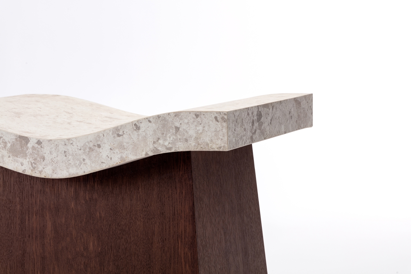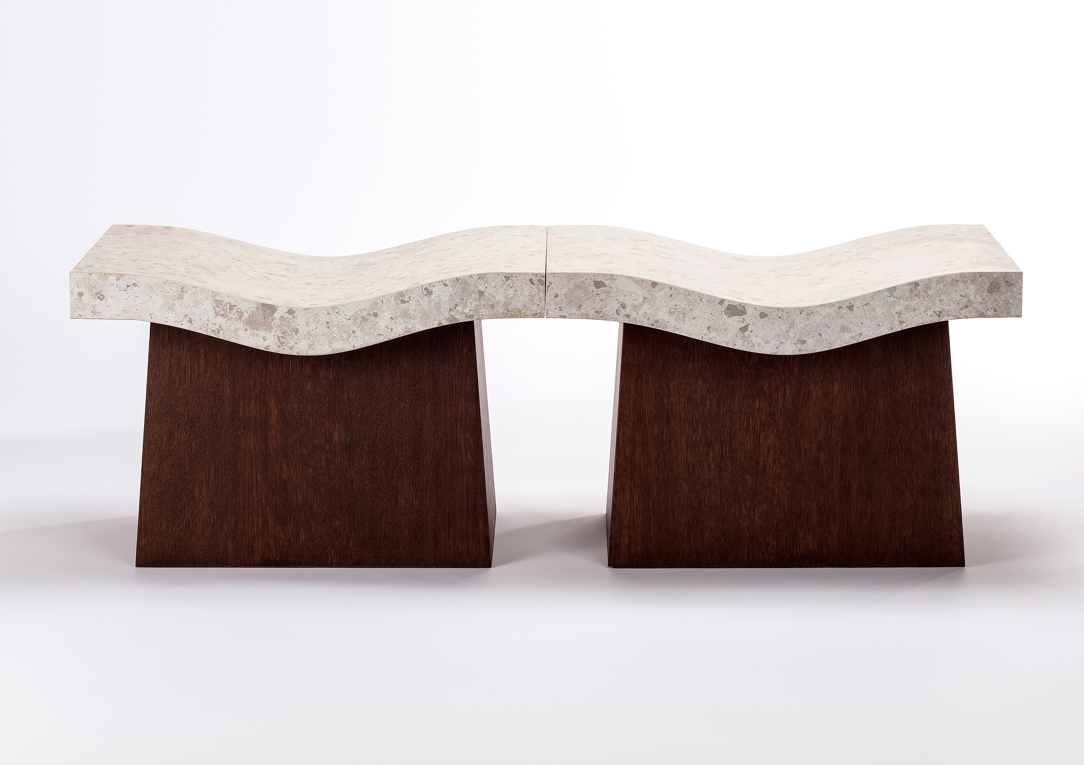 An harmonious curved line, supported by a solid wooden trapezoidal base, describes Più Uno, a seat characterized by a surface in curved porcelain stoneware, thermoformed from large-format flat slabs (6 mm thickness).