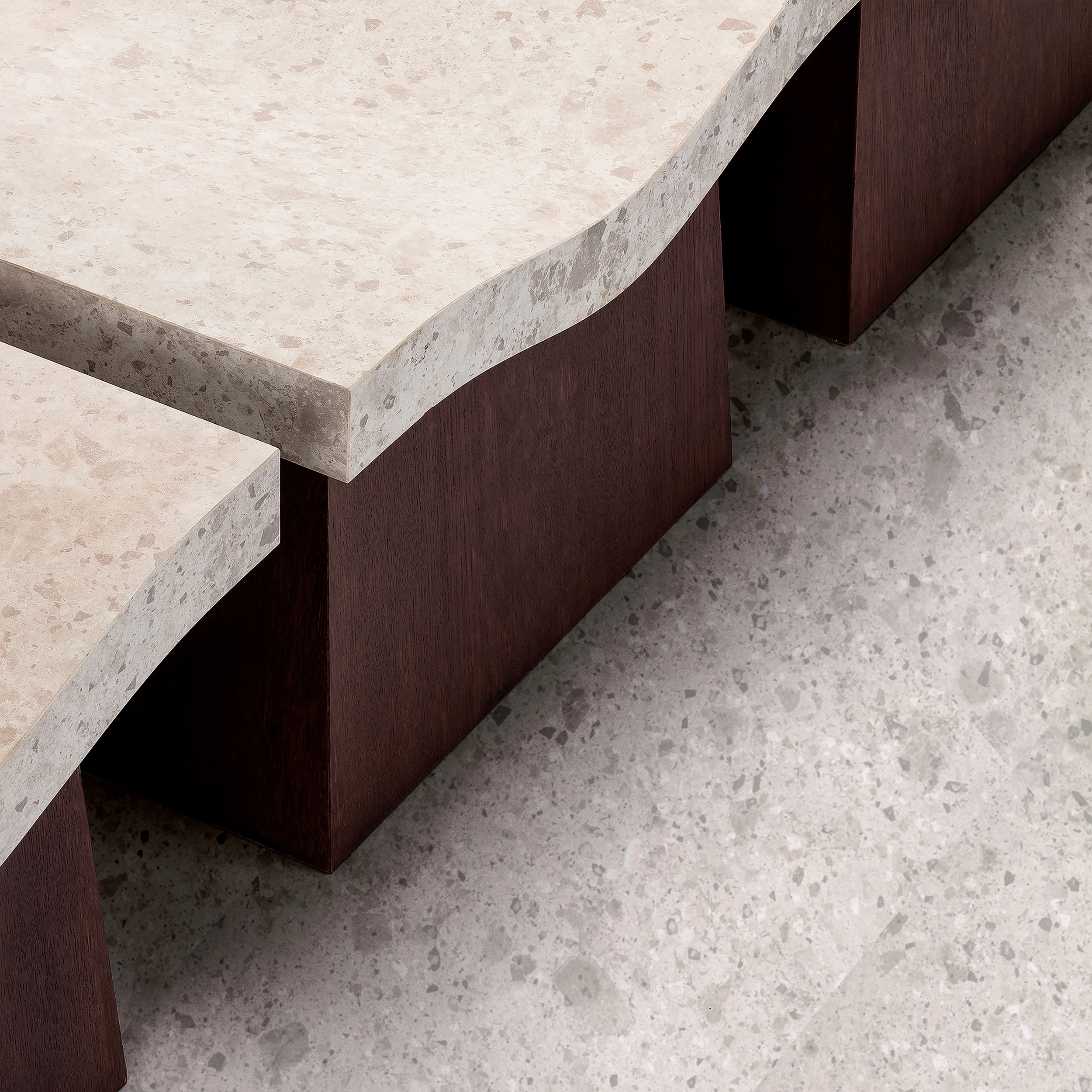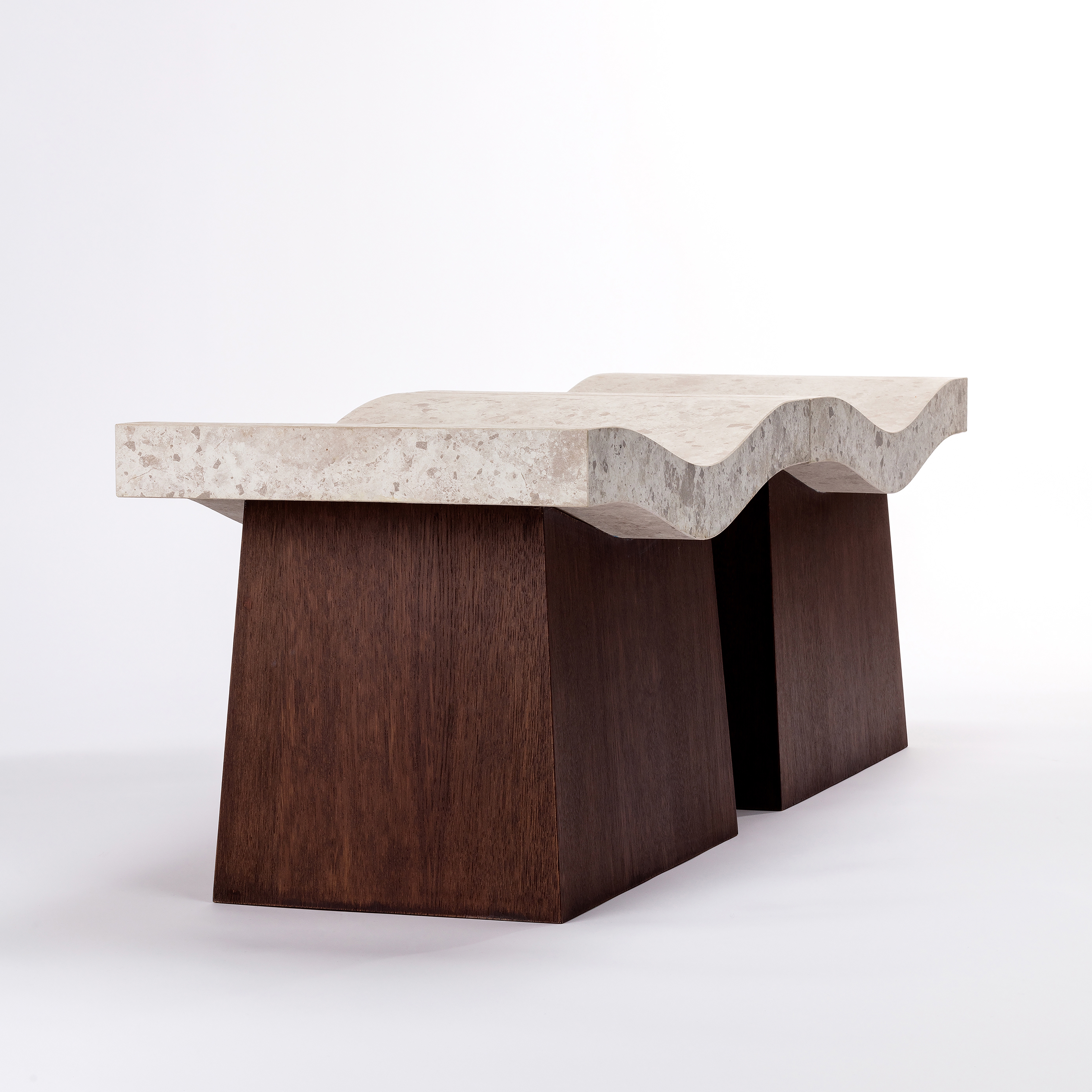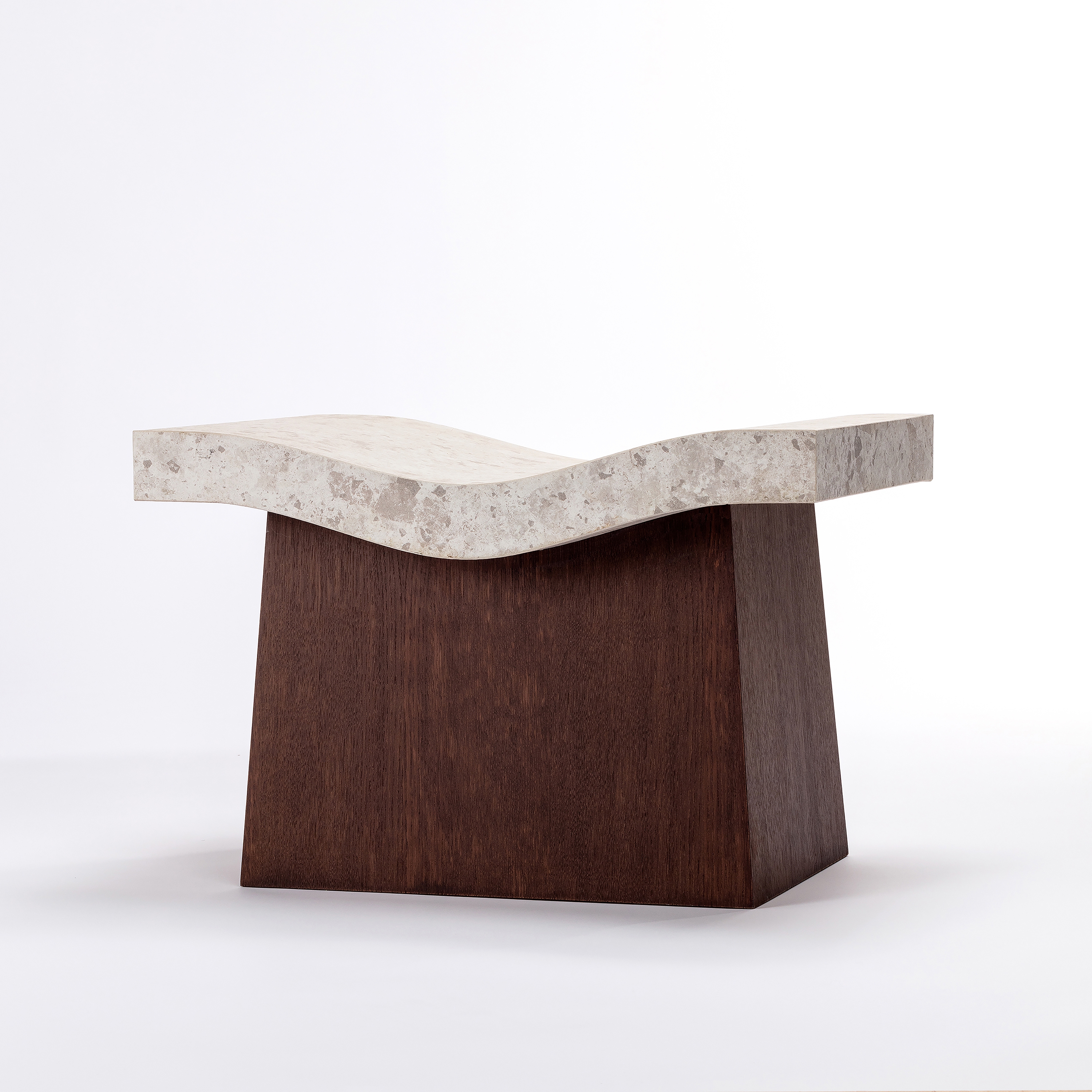 An harmonious curved line, supported by a solid wooden trapezoidal base, describes Più Uno, a seat characterized by a surface in curved porcelain stoneware, thermoformed from large-format flat slabs (6 mm thickness).