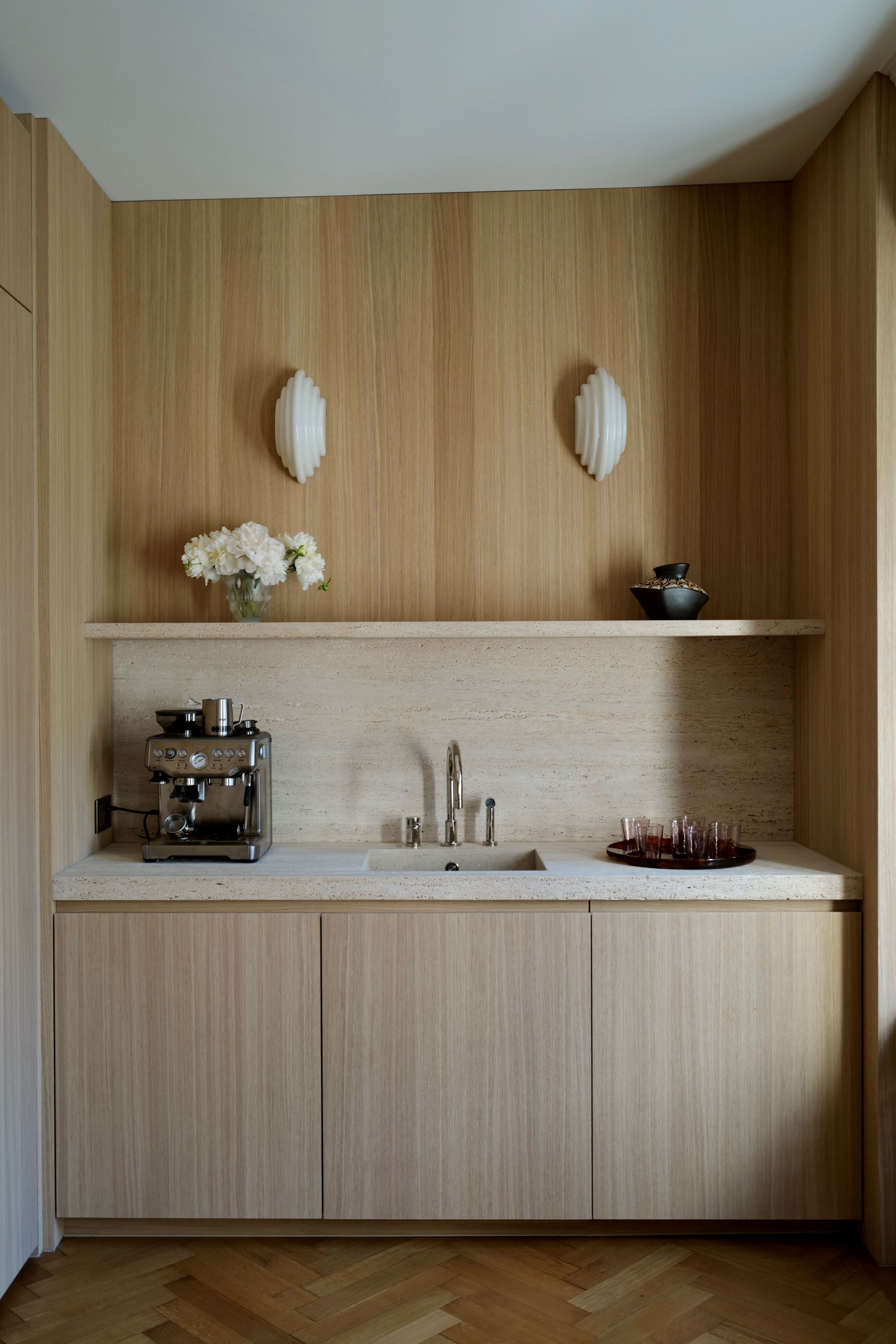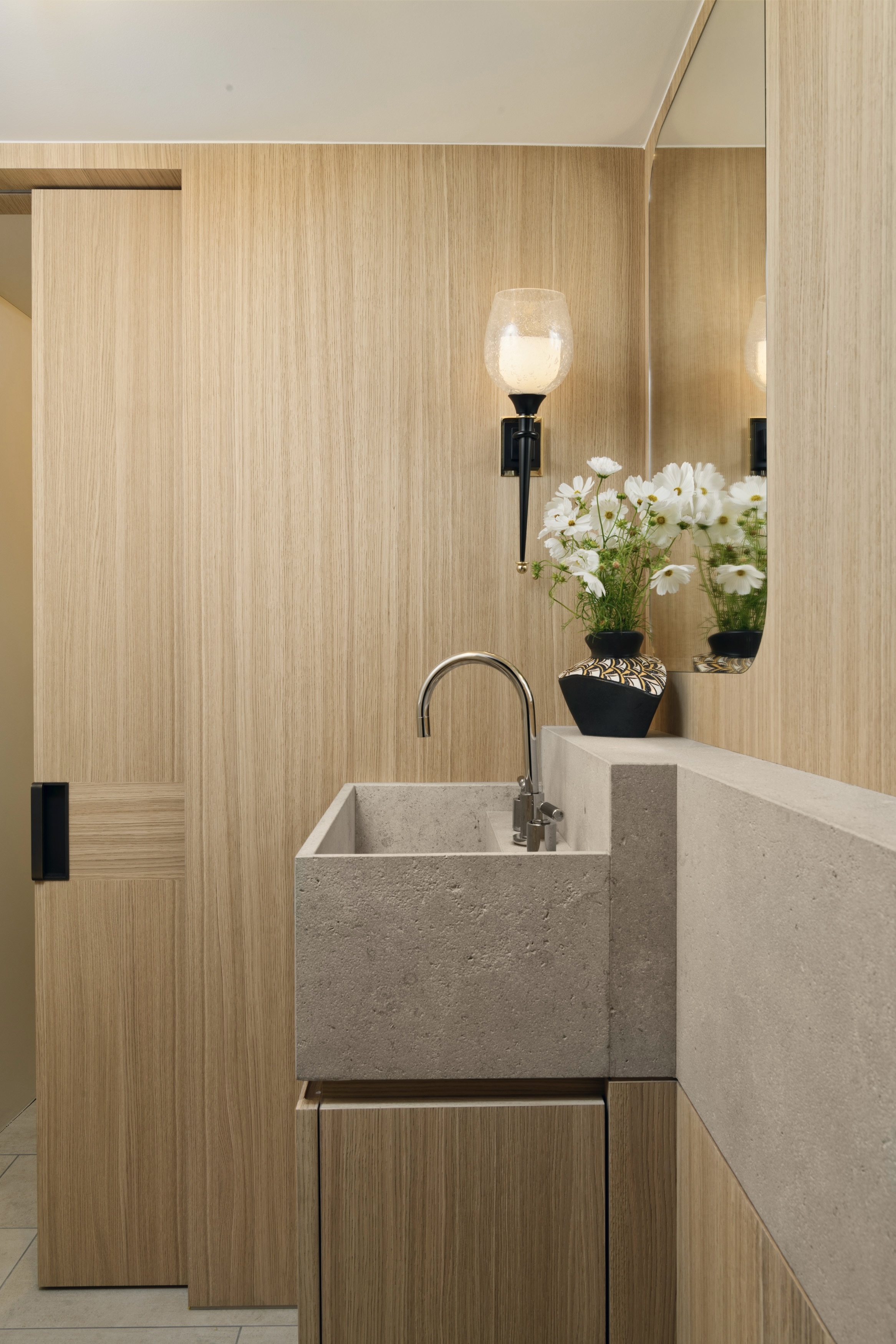 Both the kitchen and restroom are fully functional yet seamlessly integrated. Kitchen appliances are concealed, ensuring that the beauty of finishes remains the focal point.