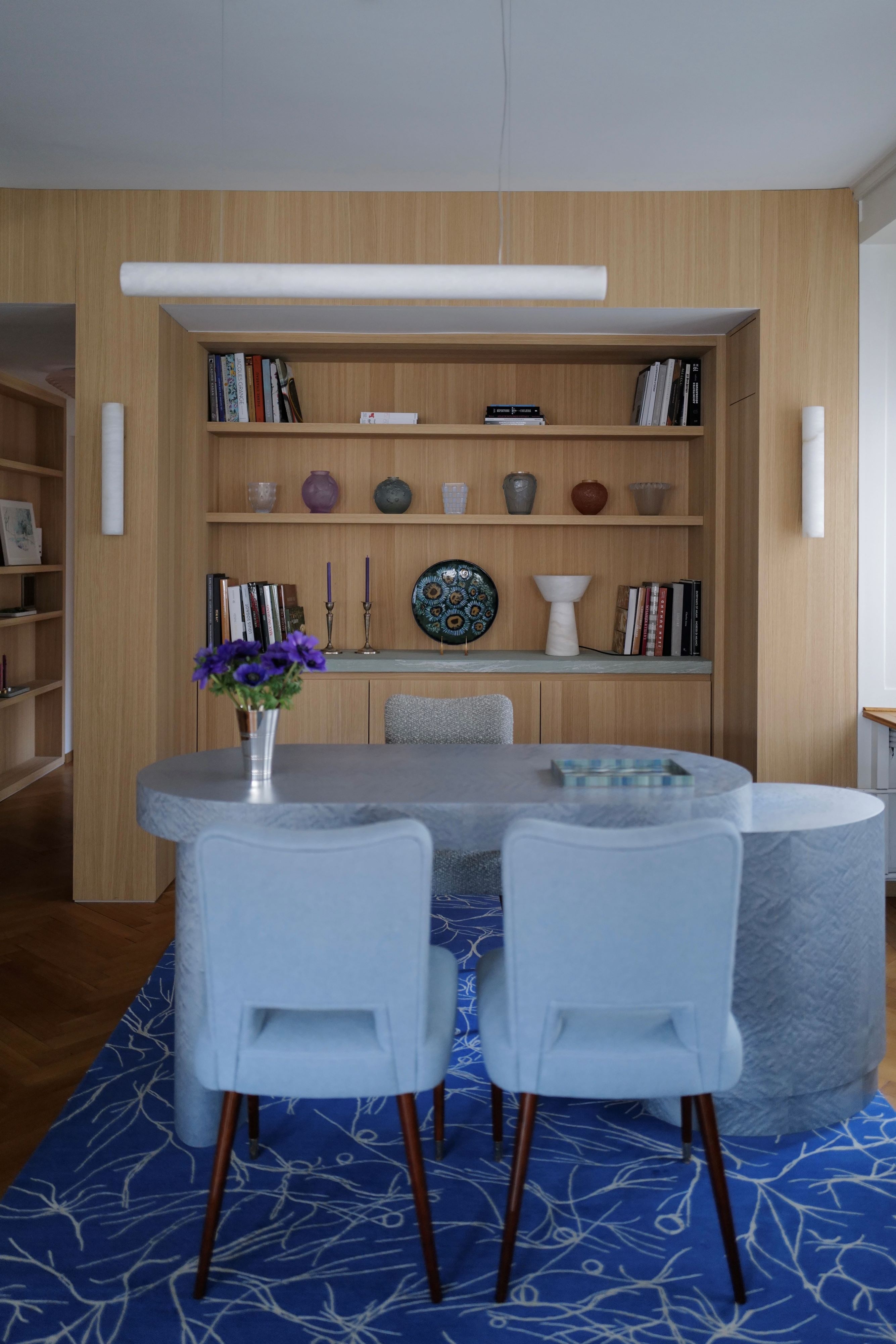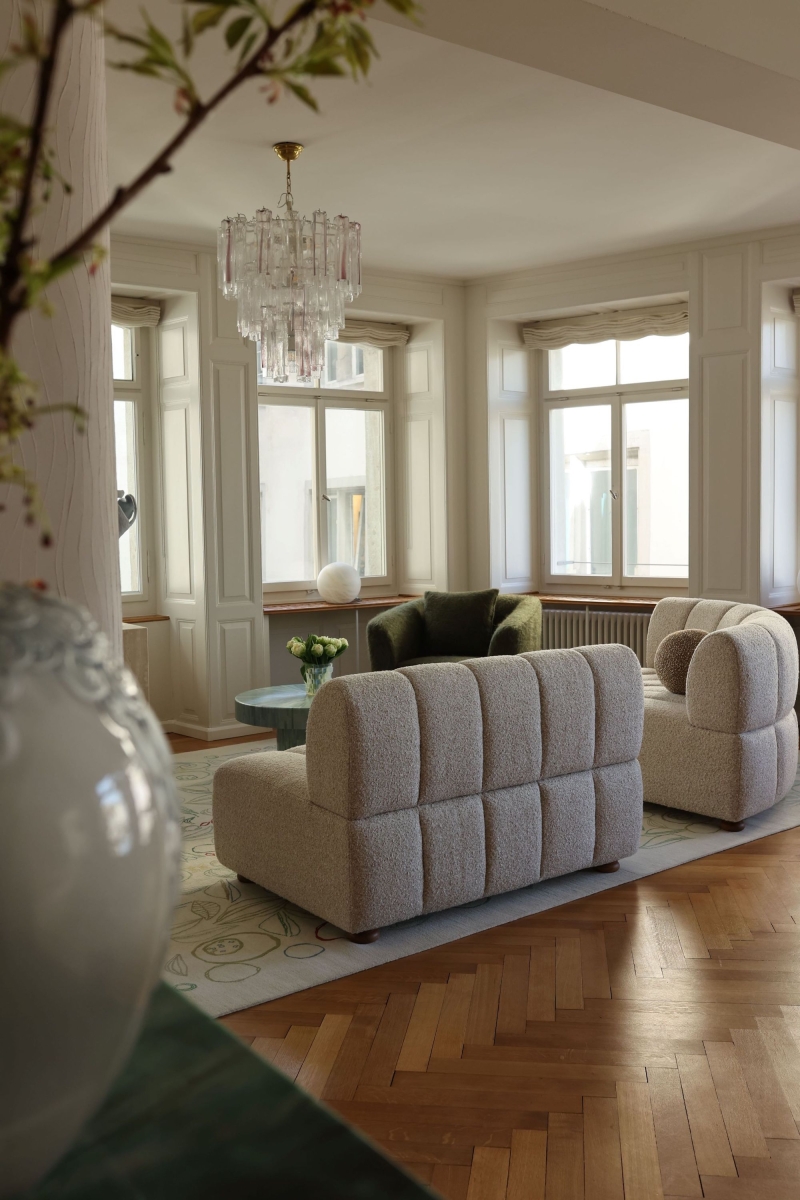 Located in the heart of Zurich, the studio overlooks Weinplatz, the historic Storchen Hotel, and Lake Zurich. Honoring its heritage, we preserved original wooden panels and oak flooring, applying a soft off-white finish to the walls. These elements bring warmth and history, grounding the contemporary design in respect for the past.
