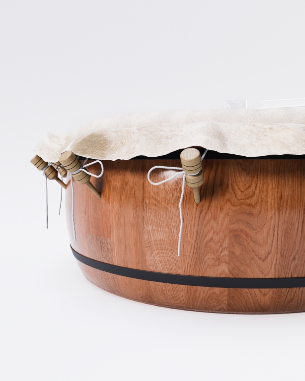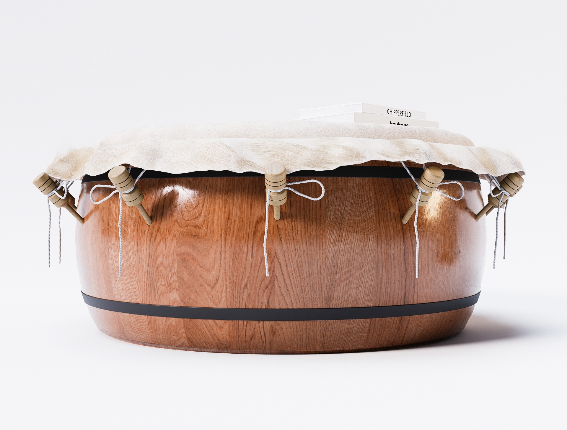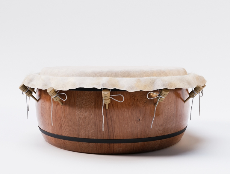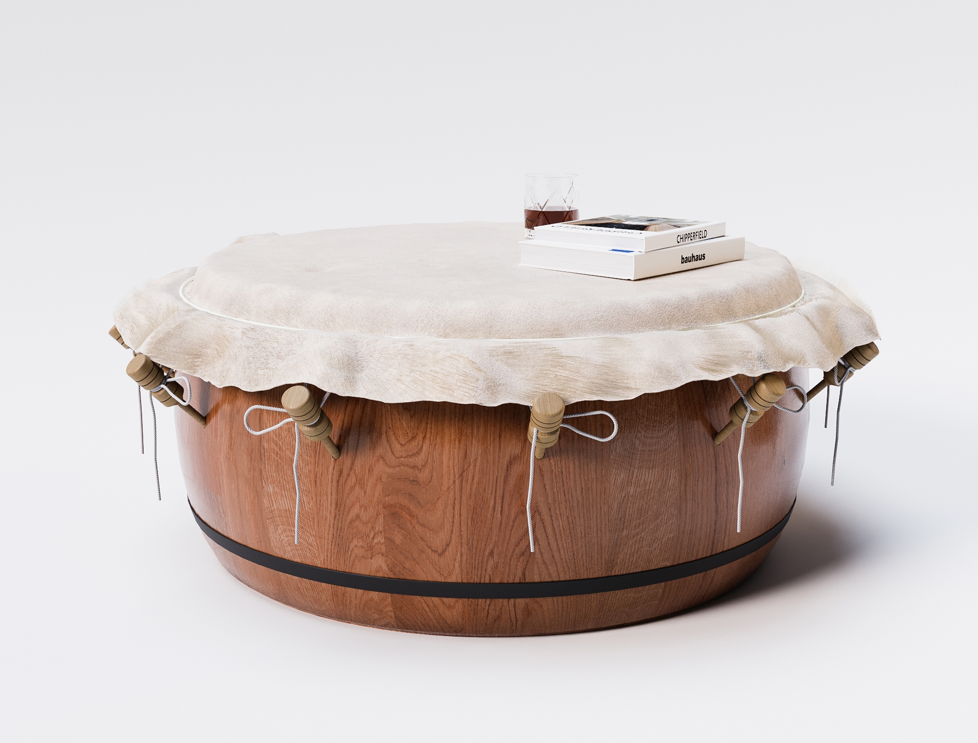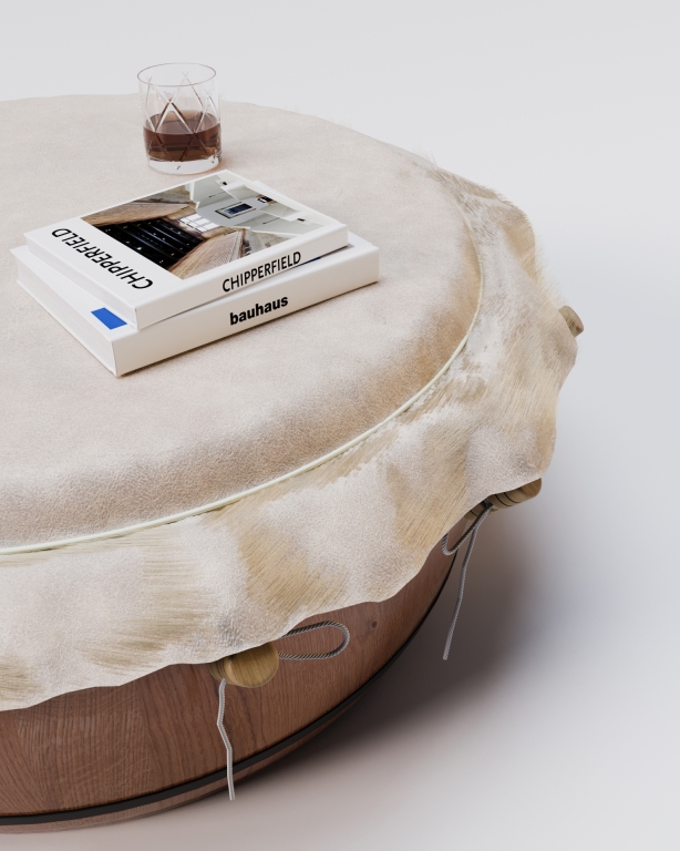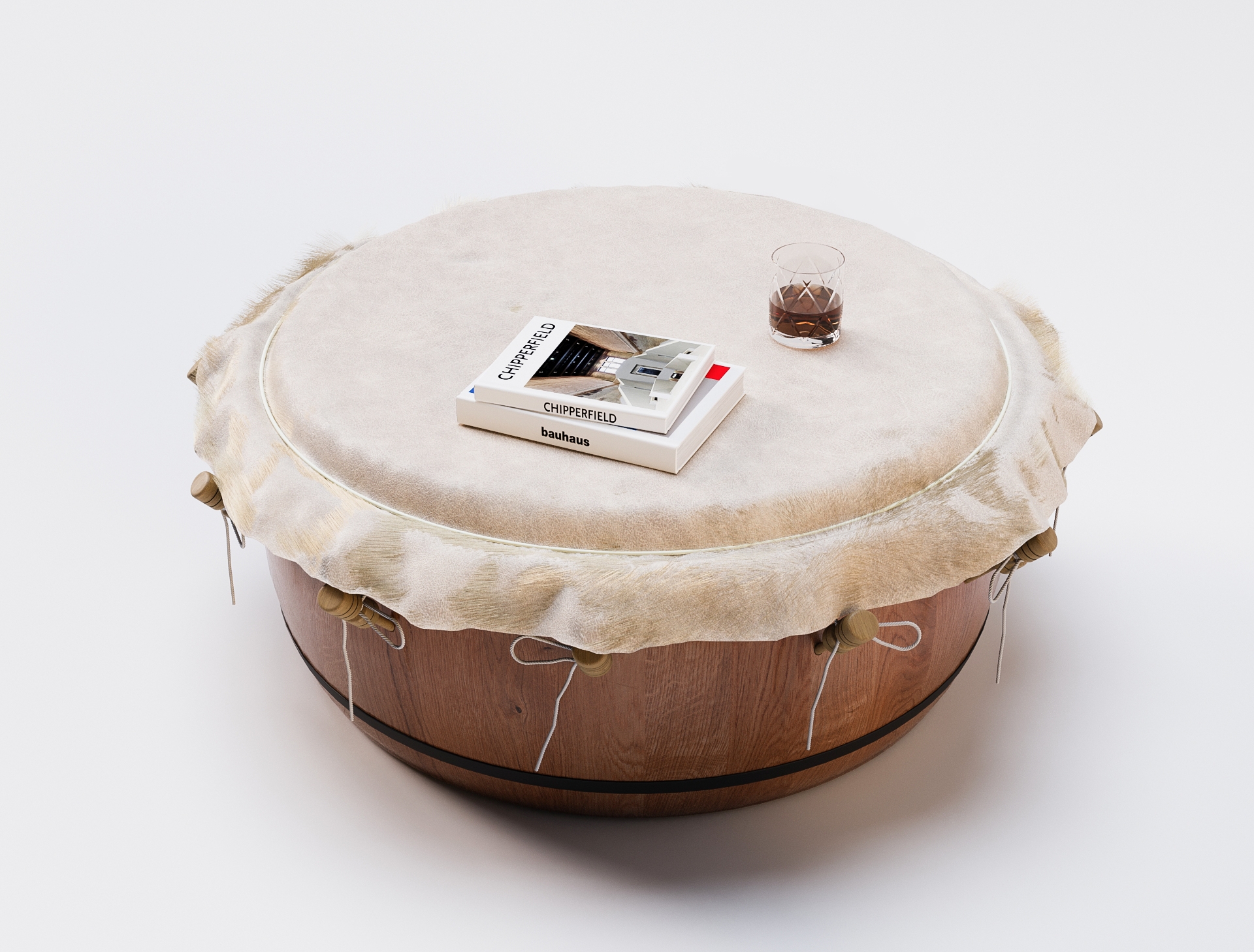 The surface of the table is made of stretched and tensioned leather, just like the traditional musical instrument, which is surprising given the unusual material used as the tabletop.