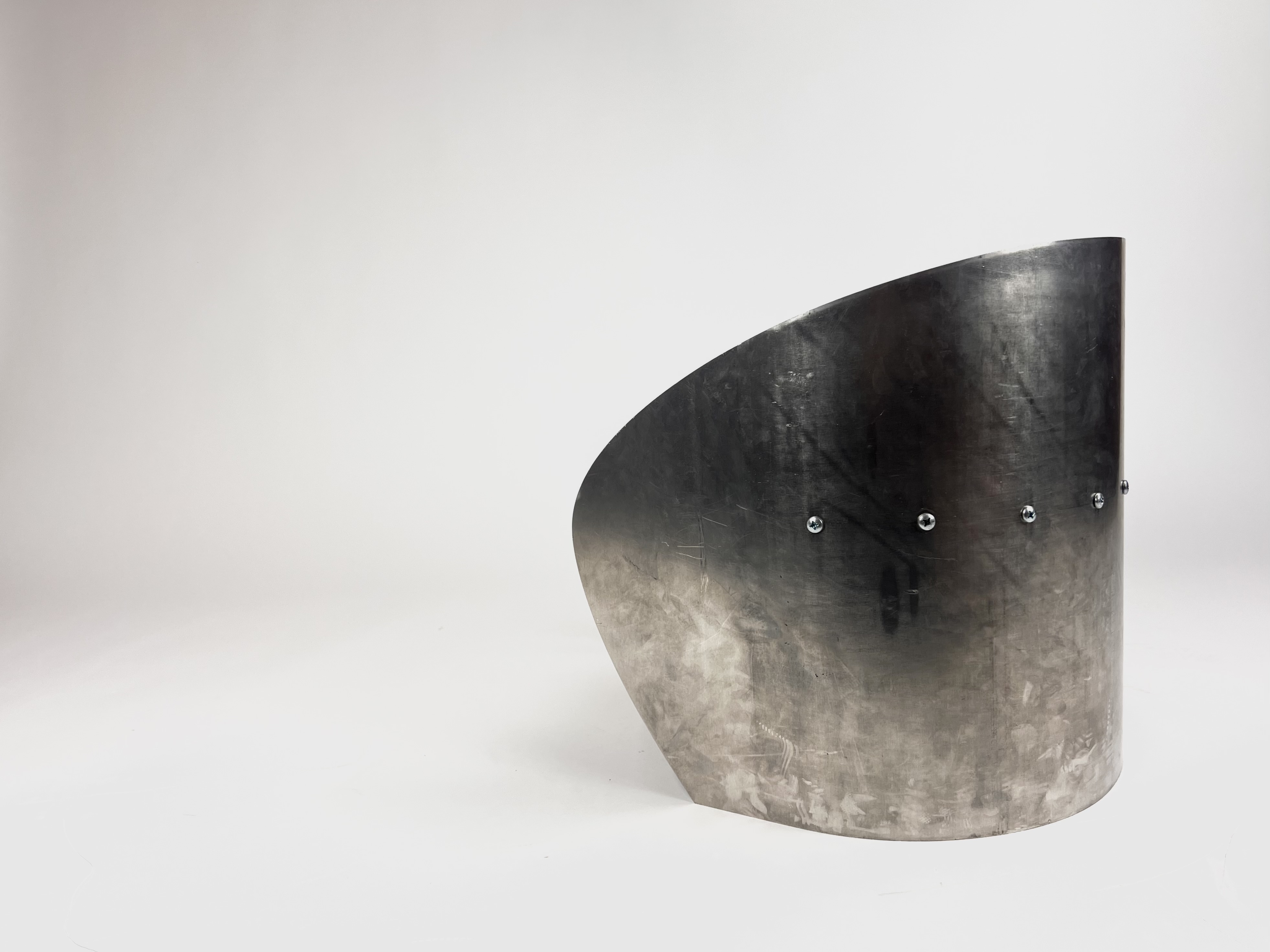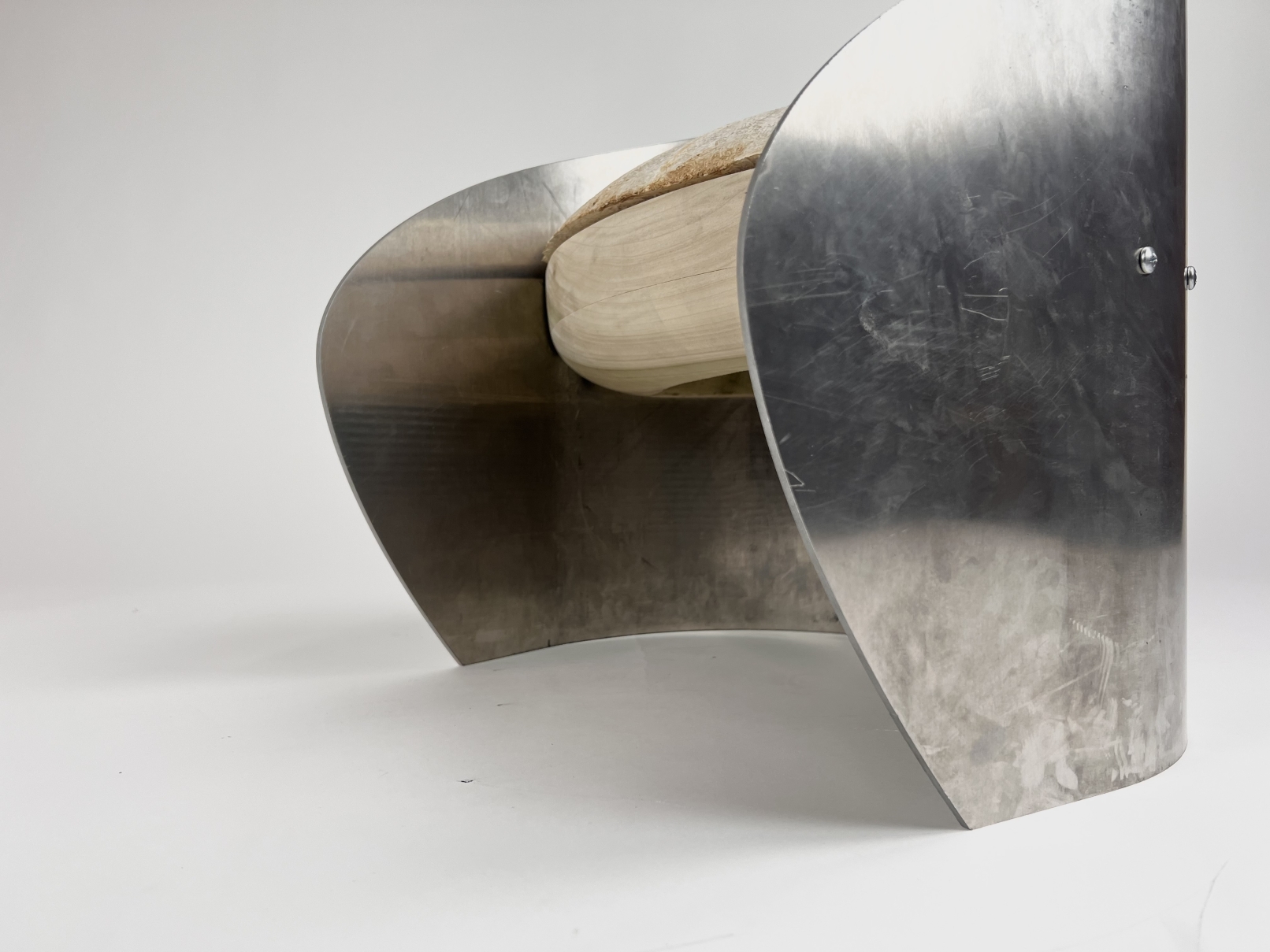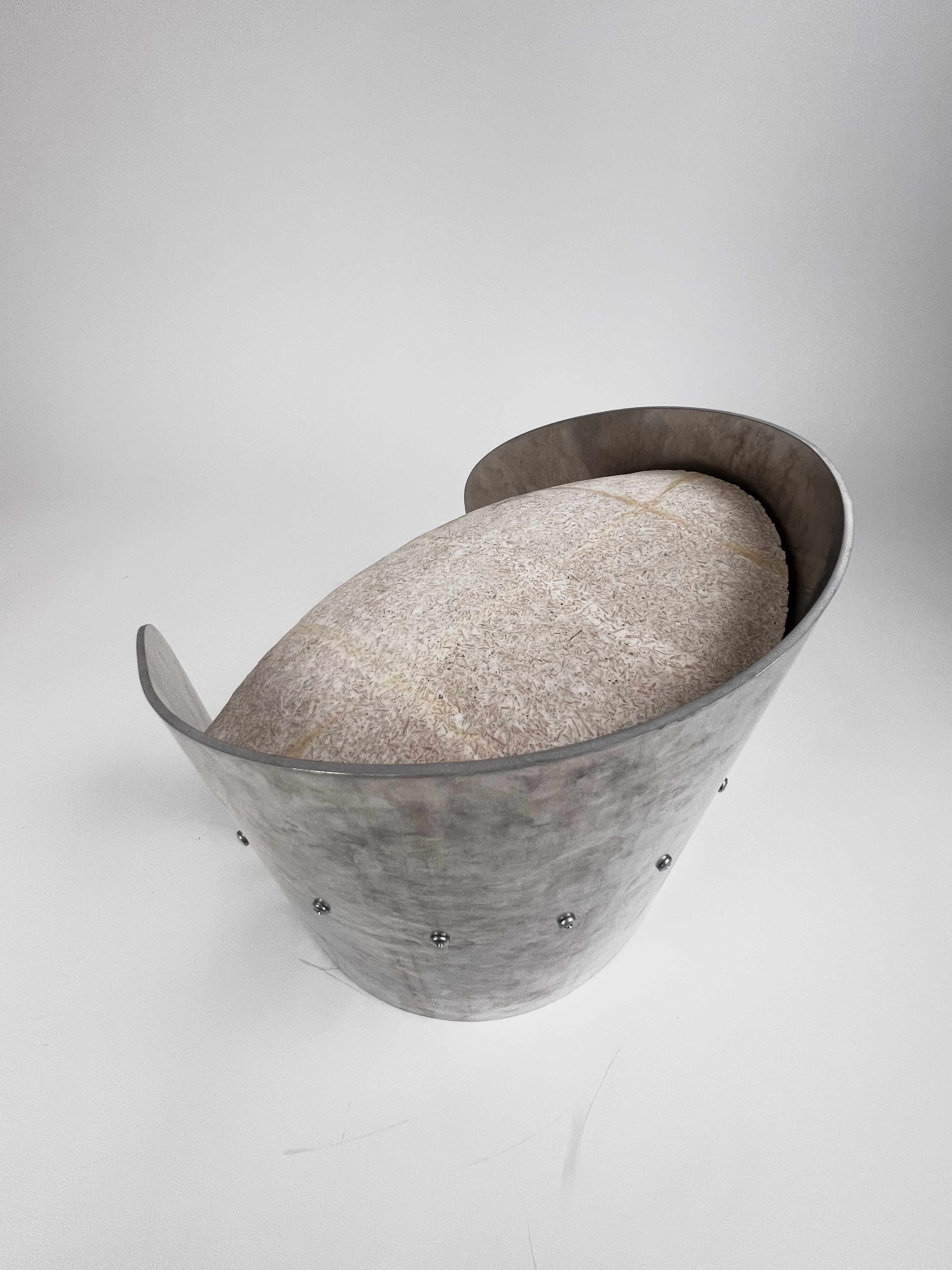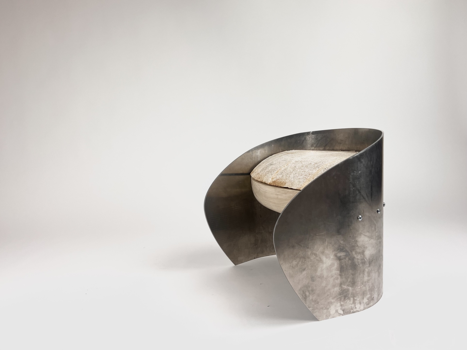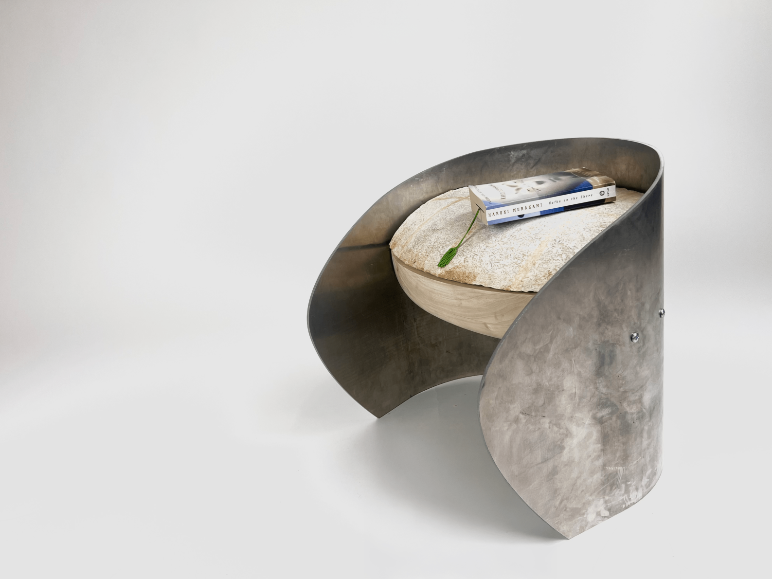 Pistachio is a reading stool designed to foster the joy of unwinding with a book in hand. Inspired by the organic form of its namesake, it balances strength and softness, protection and comfort. The backrest, crafted from a single aluminum steel sheet, forms a gentle yet supportive curve, resembling a pistachio shell. Its cool, industrial presence contrasts with the warmth of the seat, which is divided into two layers.