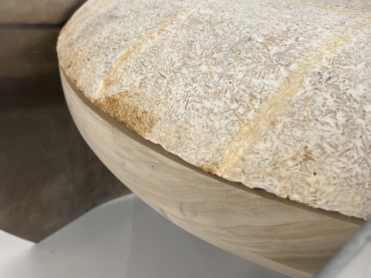 The upper seat is made from mycelium, a lightweight, biodegradable material known for its resilience and natural cushioning. This innovative choice reduces weight while offering a softer, more inviting surface. Beneath it, a poplar wood base provides stability and durability.