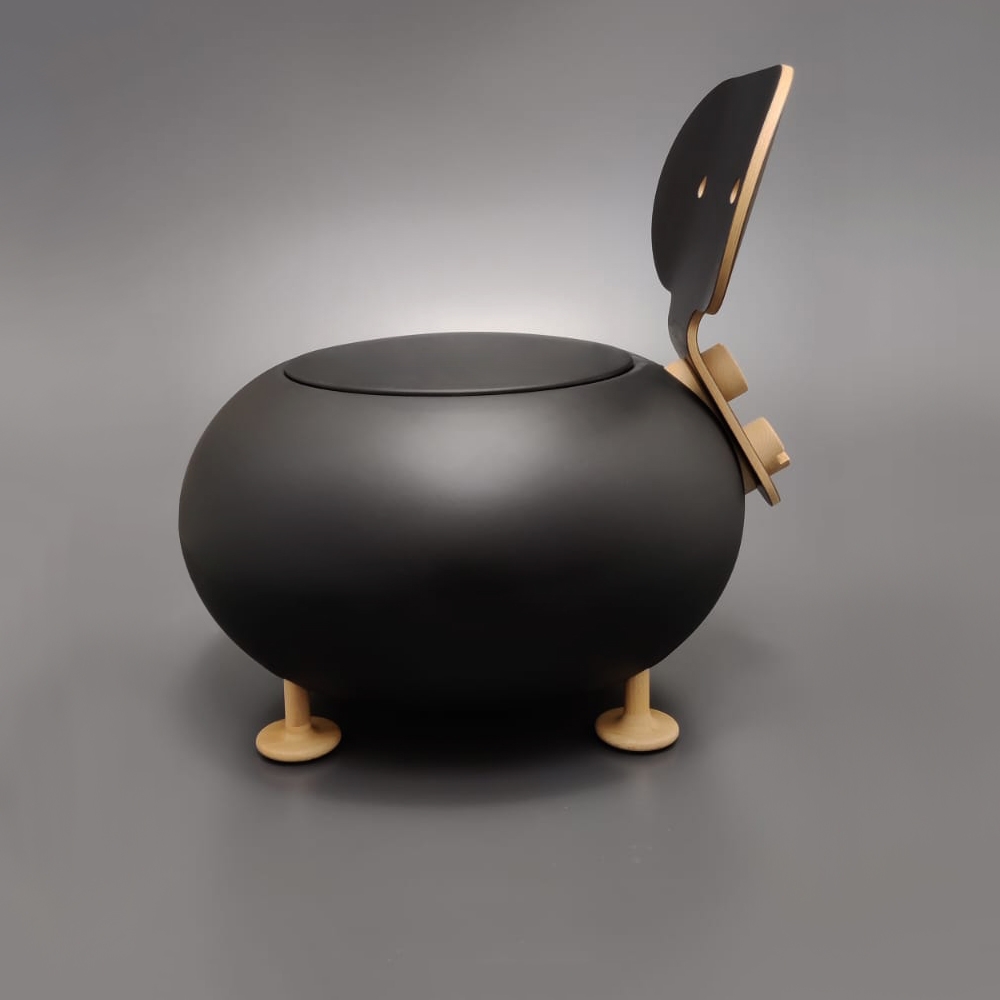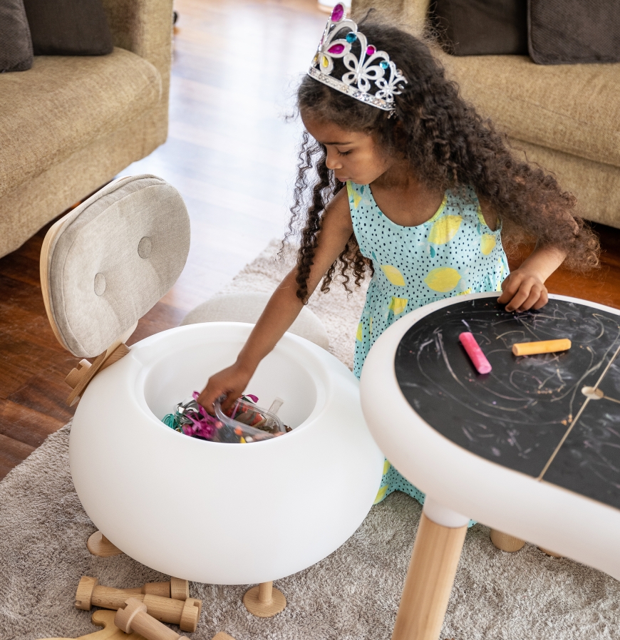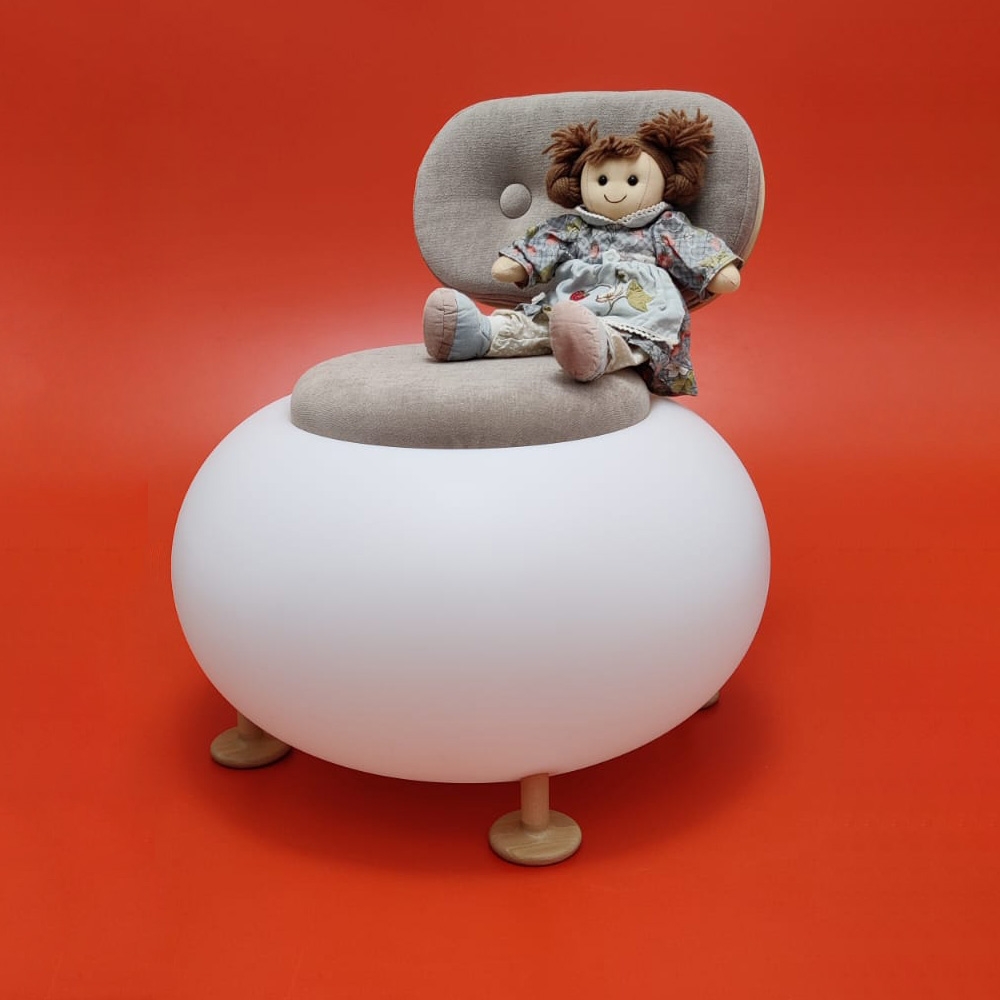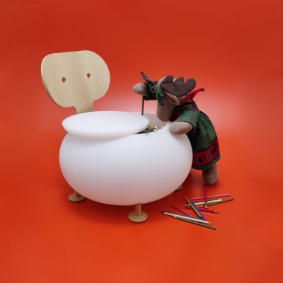 Under the removable cover the chair is suitable as a container for small objects or toys in a perspective of extreme versatility and freedom of use