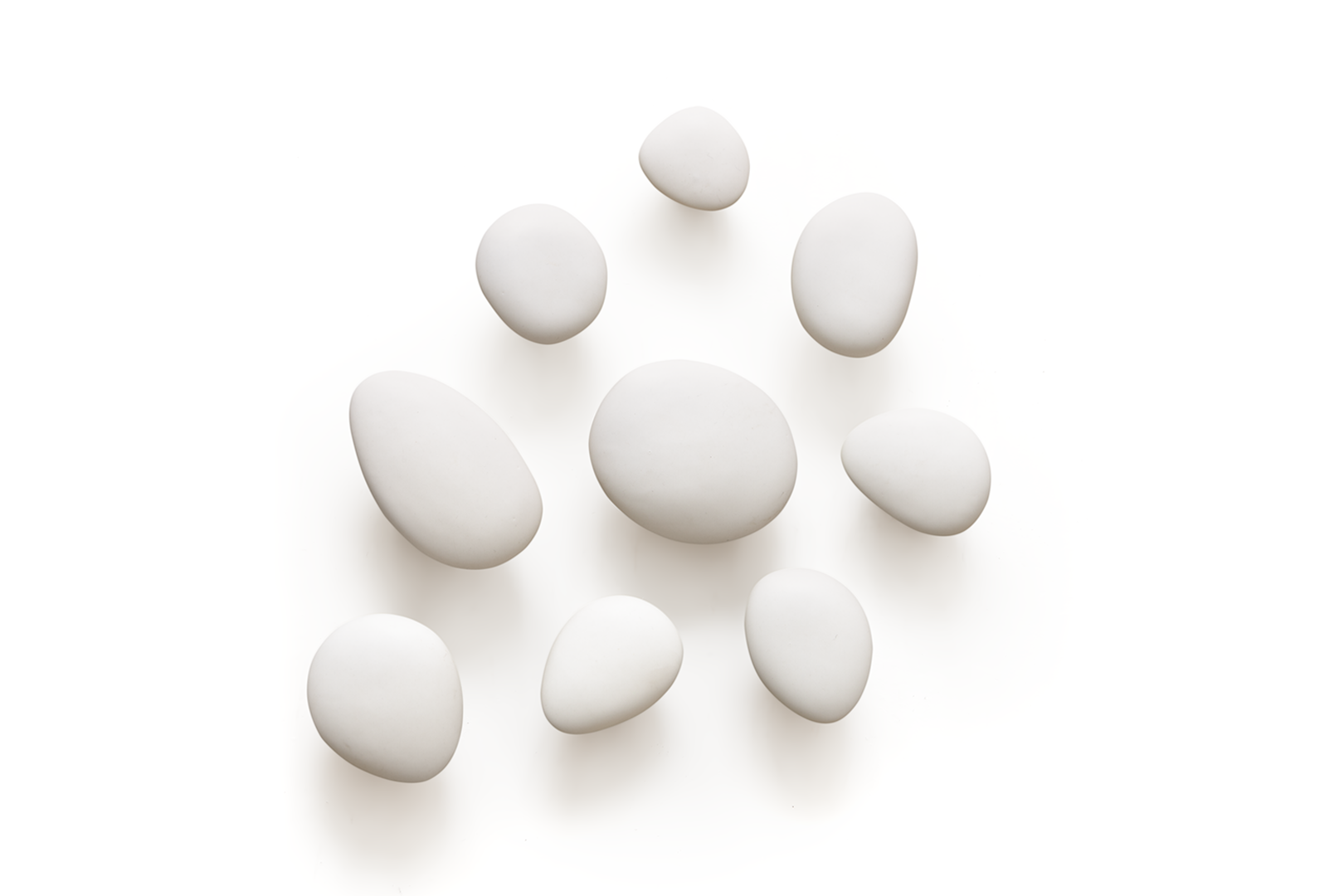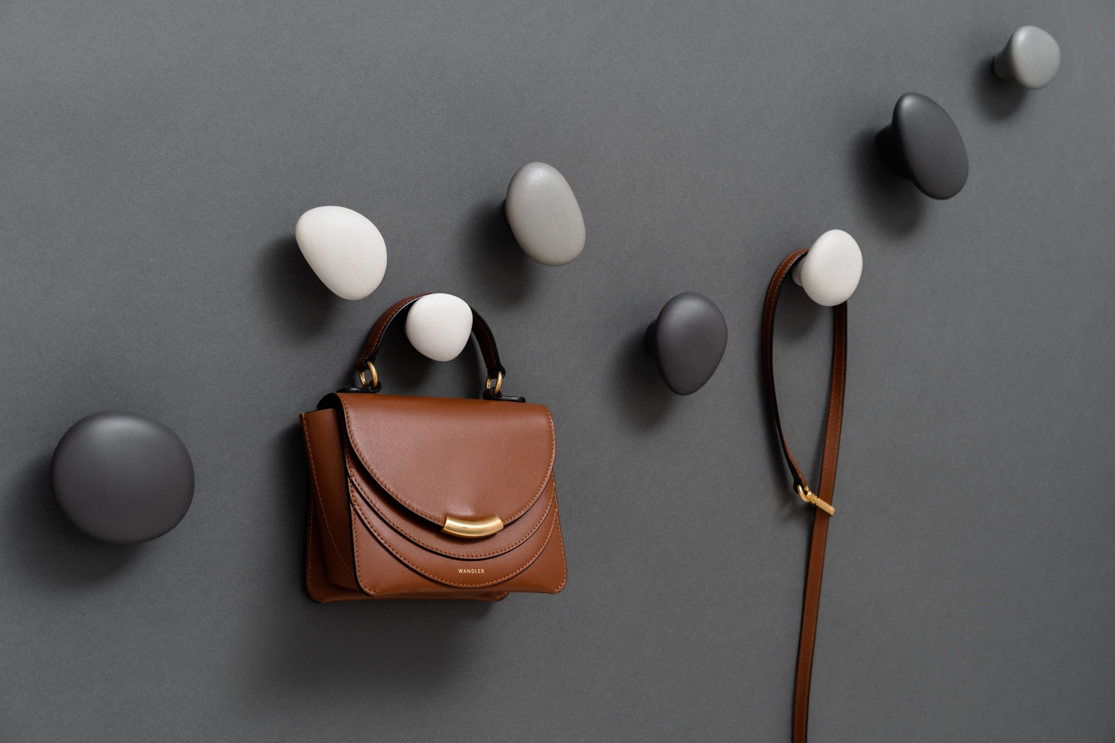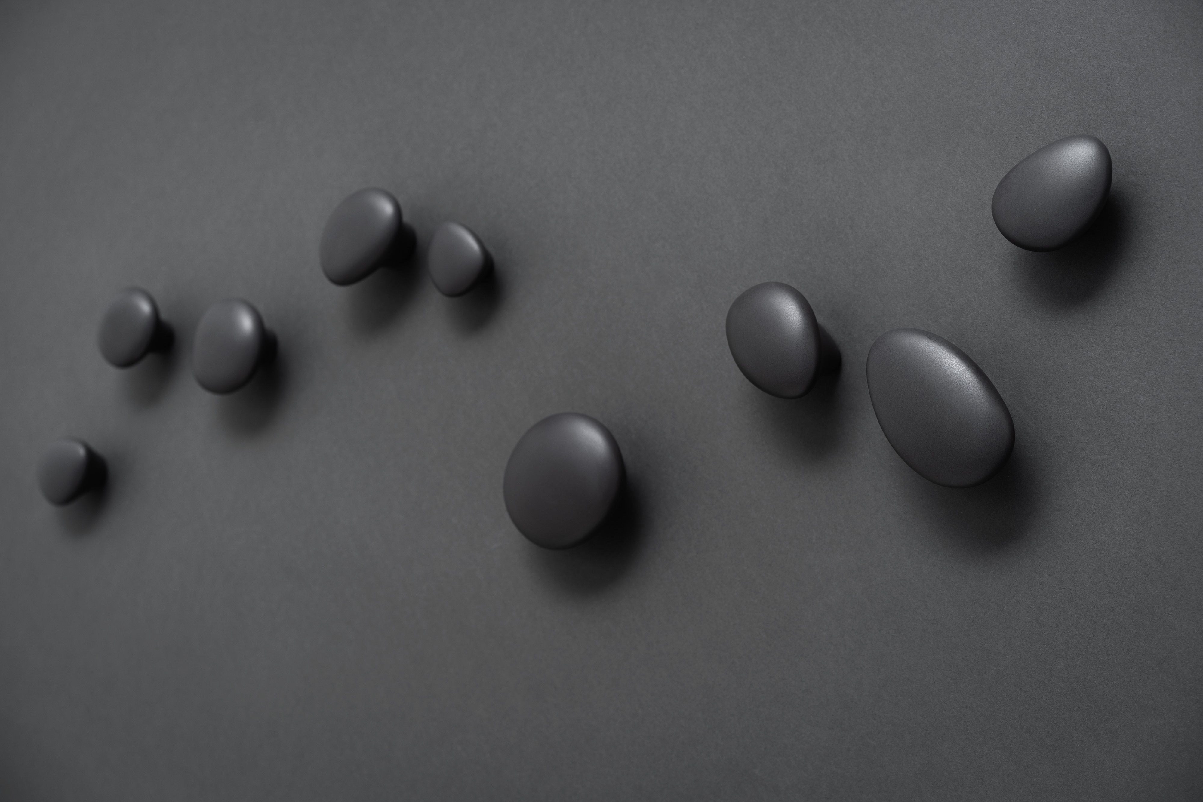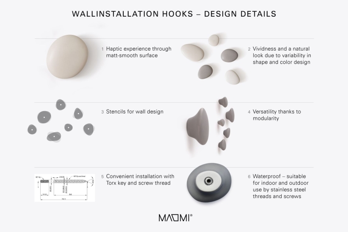 In colour and shape, HOOKS are reminiscent of pebbles that have been finely polished by water. Their feel conveys a pleasant warmth due to their natural origin and combines aesthetic pleasure with minimalist functionality.