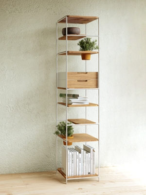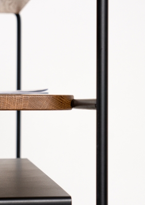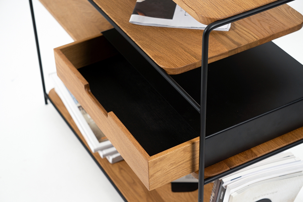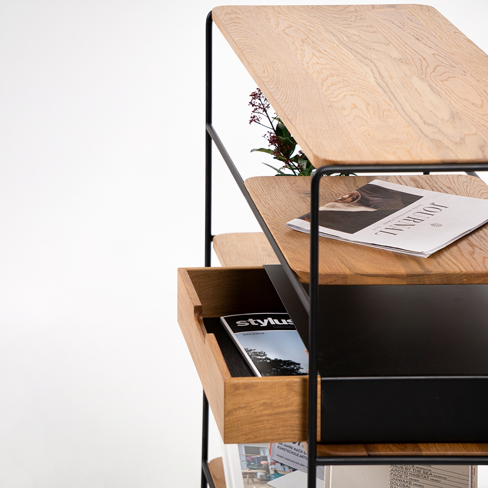 The collection is rounded off with a bookend that echoes the shape of the frame and drawers. With two different leg lengths, they adapt to the height of the book and provide a secure and stable hold.