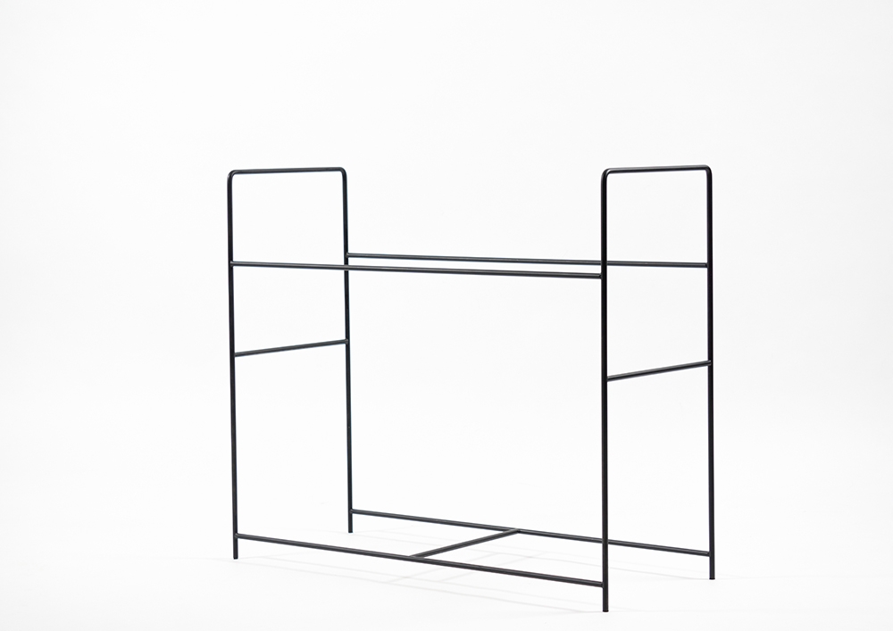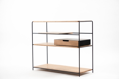MA E is a shelf whose frame is made of welded round steel. The reduced frames are braced by wooden boards and form-giving shelves, lowboards and highboards. They divide room situations transparently and flexibly.