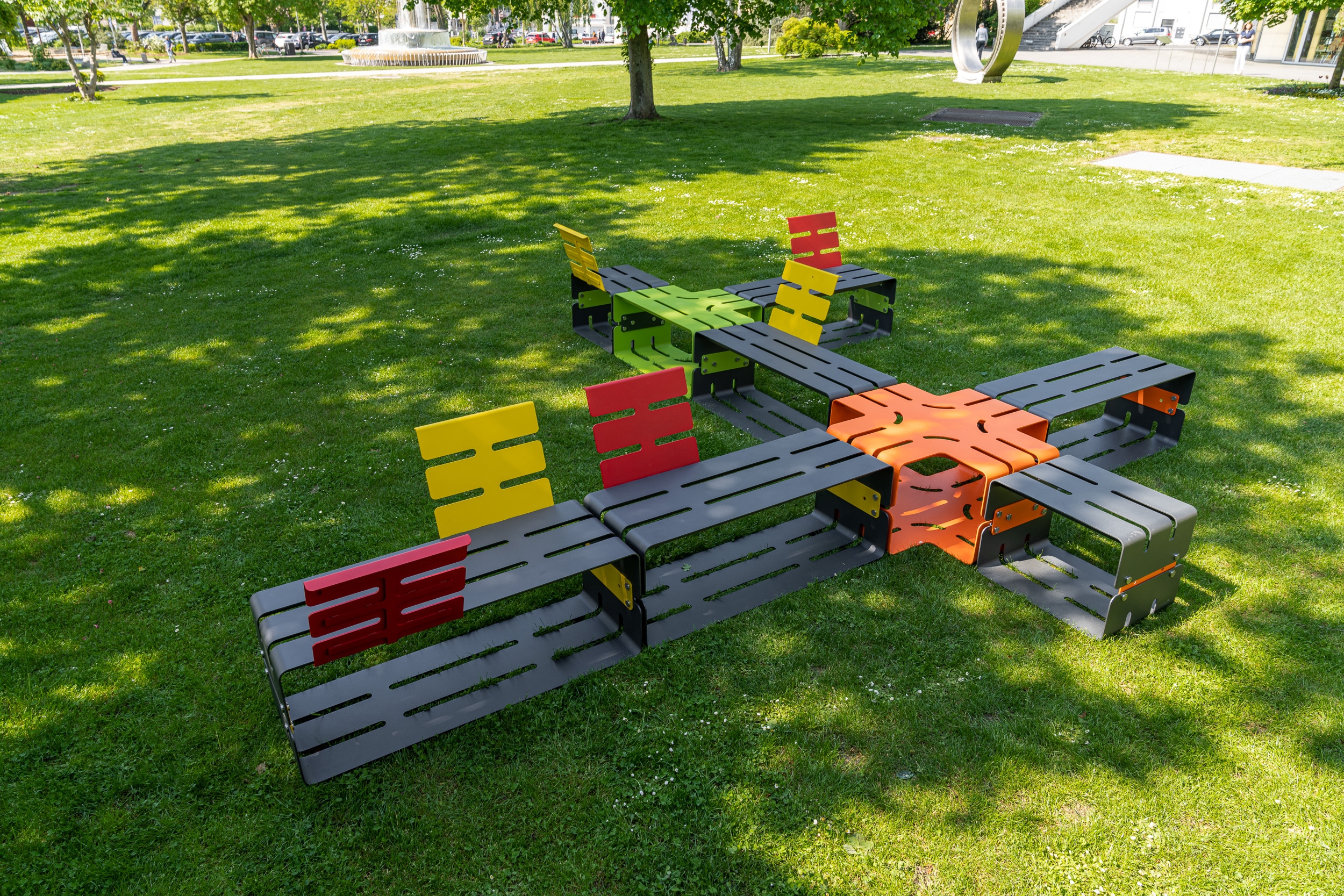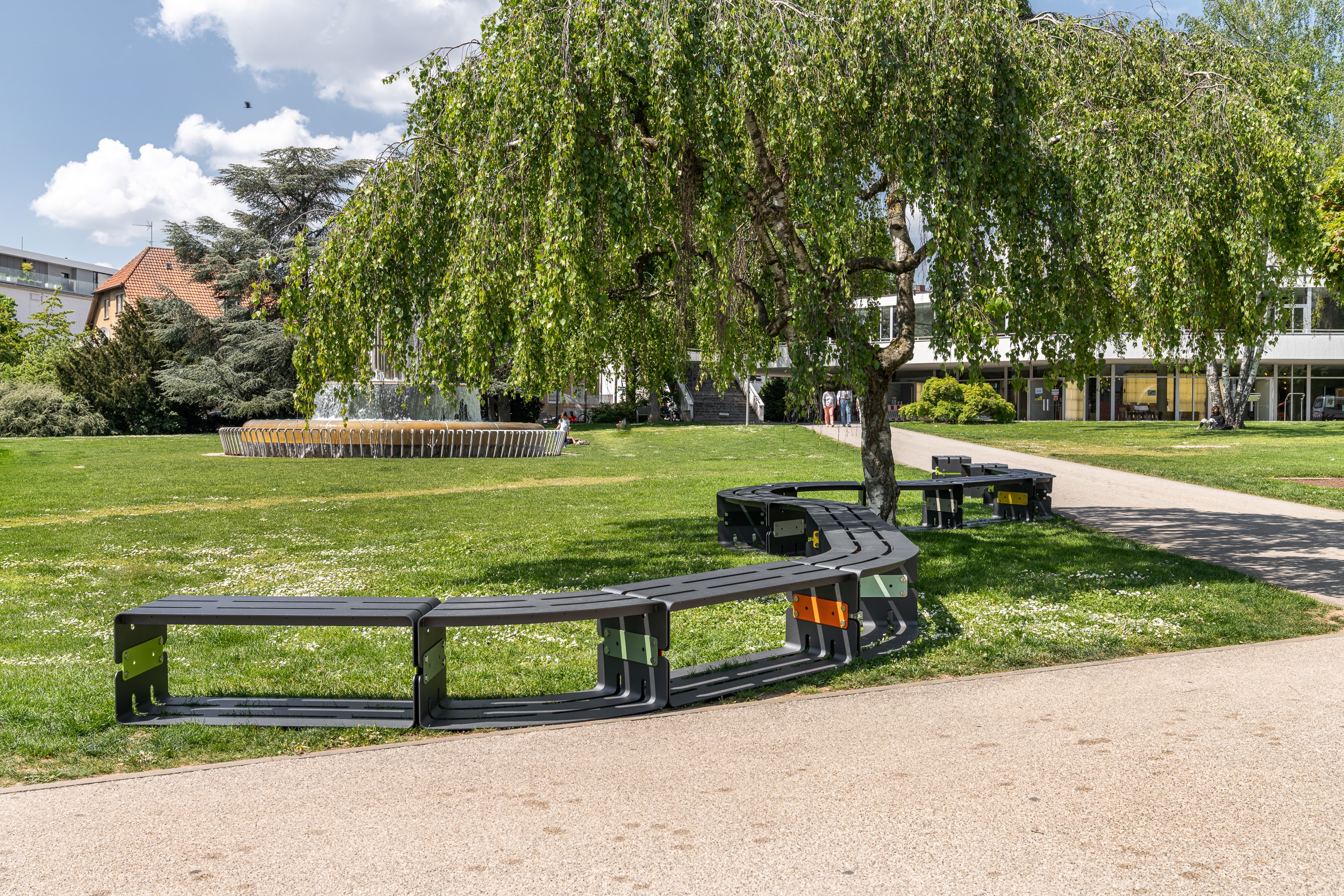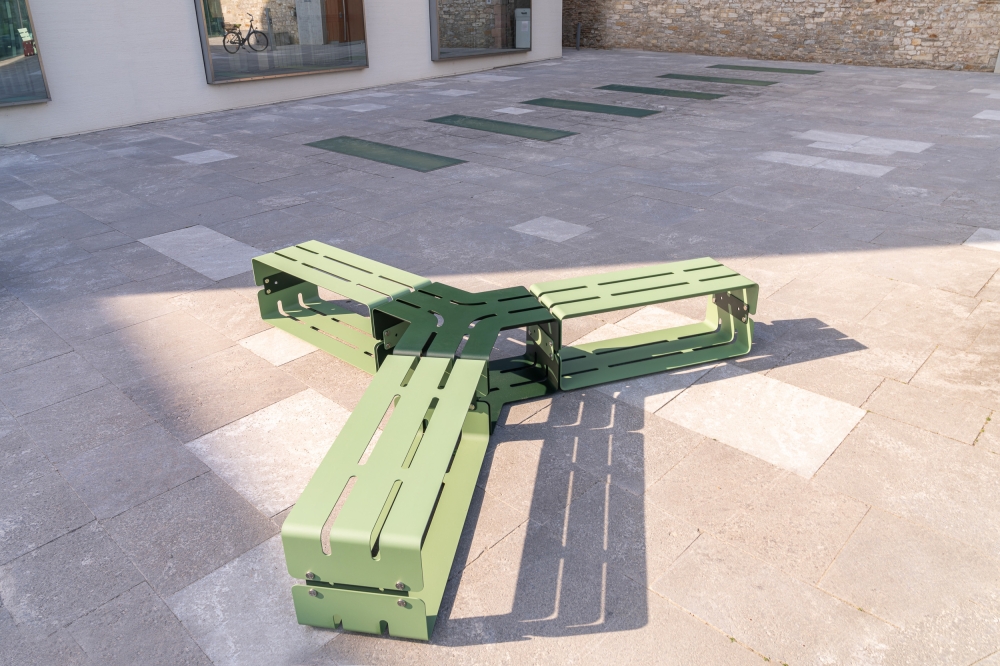 The individual stainless steel elements and connectors make it possible to realize almost any shape as modern seating. Straight-lined bodies, arches and two-, three- or four-armed connecting pieces in combination with backrests make every bench a visual experience. Subsequent extensions are also no problem thanks to the connectors for joining the elements. Not only the color selection of more than 8500 shades, but also the versatile application possibilities of the color accents allow free design down to the last detail. Whether single or multicolored: There are no limits to creativity. Almost all shapes can be reproduced as seating. All elements are handmade in Germany entirely of stainless steel: sustainable and climate-positive. All products are 100% recyclable at the end of their decades of use.