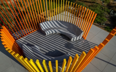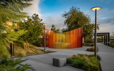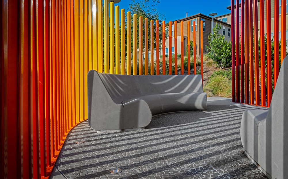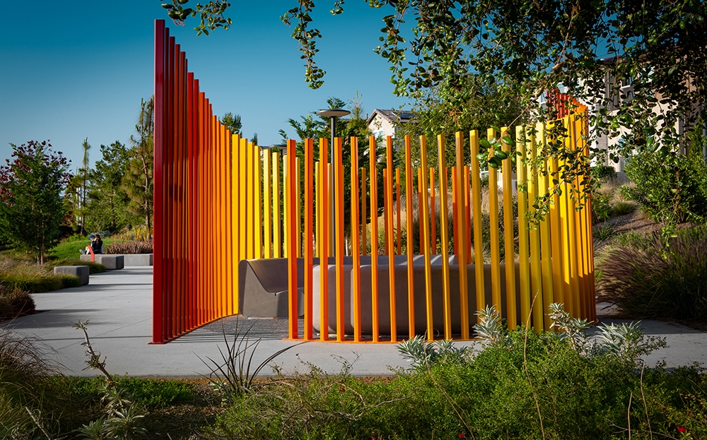 The Creative Sourcing and Procurement team created a custom experiential sculpture, “Sky Garden,” an extension of The Profound Sanctuary Garden within the Orange County Great Park (OCGP). The Sky Garden is designed to create a sense of balance for the mind and body by incorporating empty (yin) and occupied (yang) space. Paired with formed polished concrete benches reminiscent of the classic Parisian kissing bench, the ombre colored steel louvers reach for the sky in hopes of using form and space to sow conversation. This is a place for quiet contemplation and reflecting on the sky above, on big ideas. The vertical enclosure and the angle of the seating is meant to direct your focus beyond yourself and your immediate surroundings whilst providing a physical space for discussion with friends. The color palette was chosen as an homage to the desert sunset.