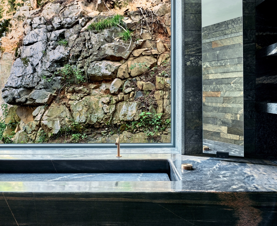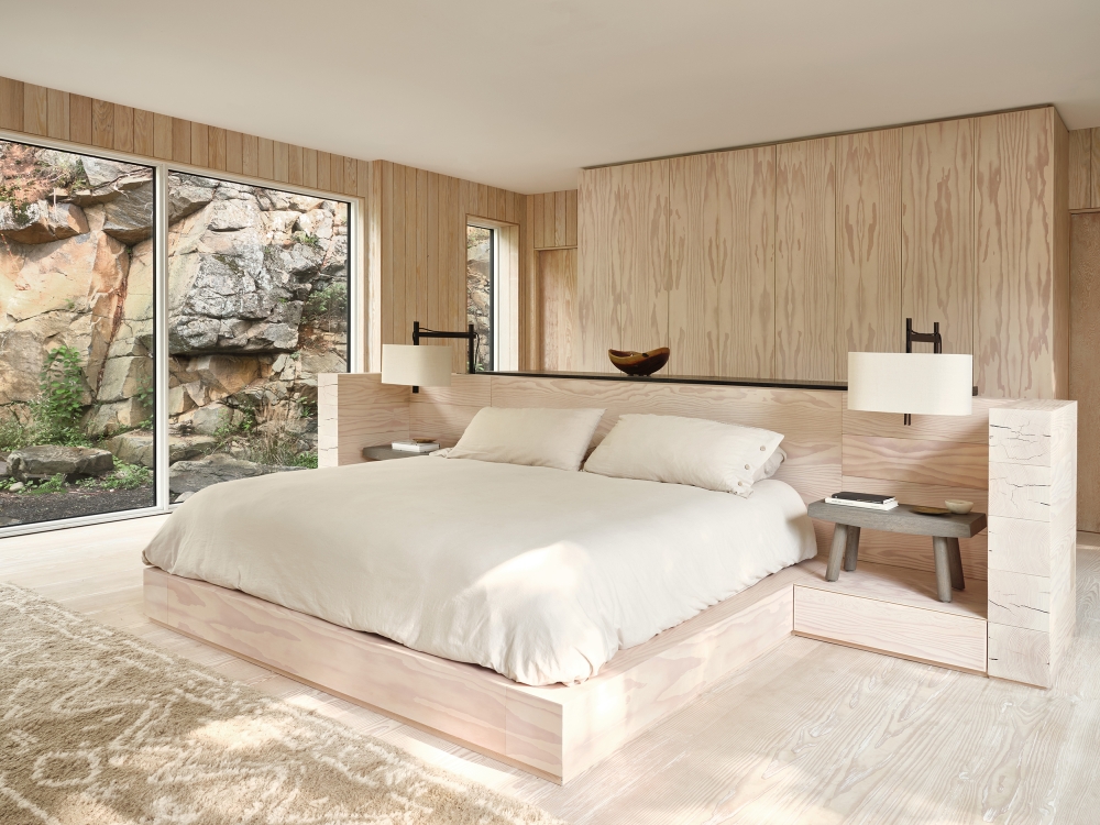 The Muskoka Cottage is a place of respite from city life. It overlooks Lake Rosseau, near Georgian Bay, Ontario, and it complements, but never overwhelms, its environment. The design ethos is warm minimalism and a sense of balance. Light juxtaposes darkness and refined details coexist alongside unfinished surfaces. Rugged blocks of granite, which serve as bathroom sinks or a kitchen island, evoke the boulders and outcroppings of the Canadian Shield. They offset the refined Douglas-fir millwork that surrounds them. The site is immersed in nature. Windows frame views in all directions, not only outward to the lake but also inward to the rocky escarpment. When walking through the house—passing from the entranceway to the great room, or from the dimly lit downstairs hallway to the sundrenched bedrooms—one feels that one is journeying through an inlet in a rockface and emerging, dramatically, into sunlight. Stillness, space, connection to nature—these are the best and most rarified luxuries imaginable.