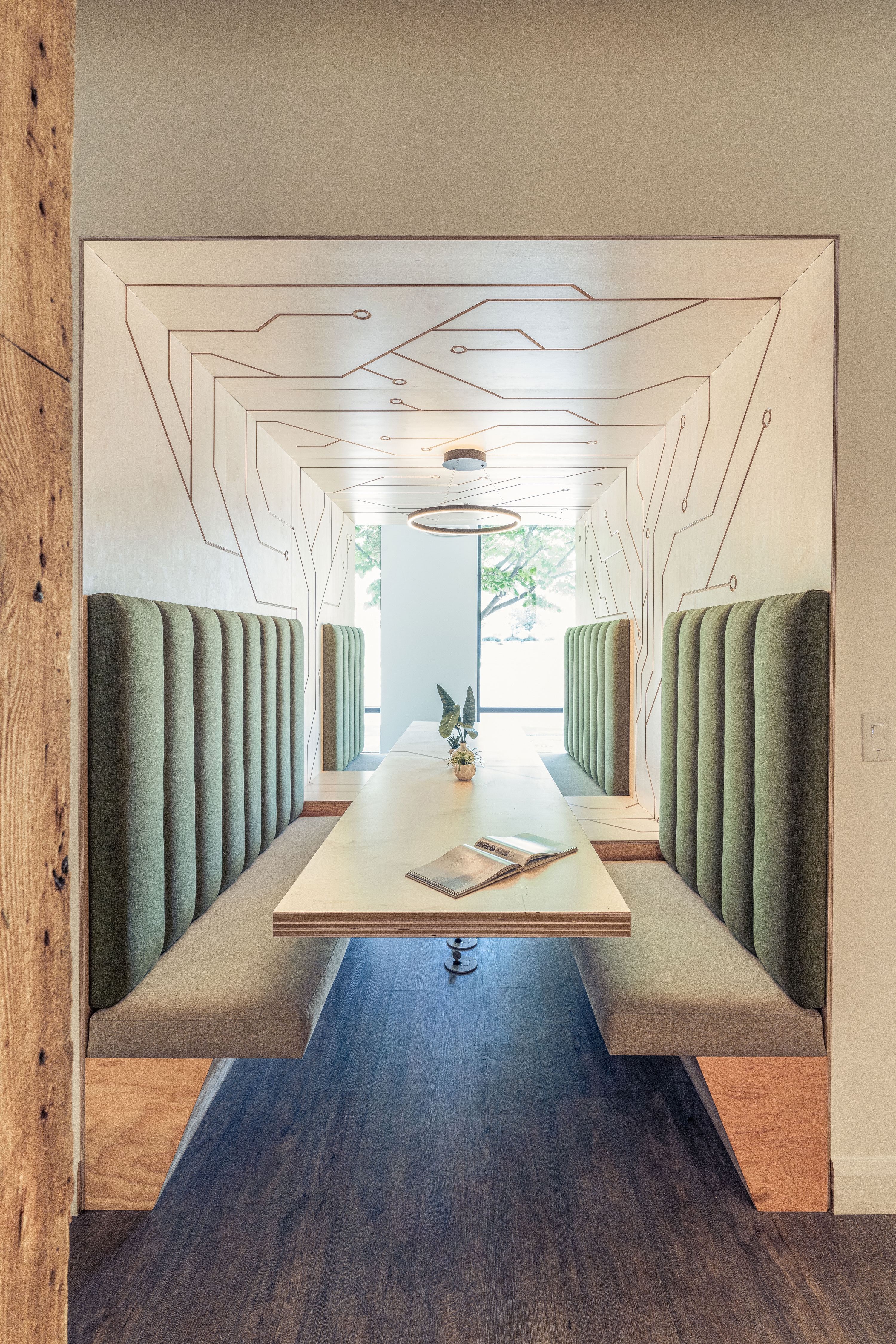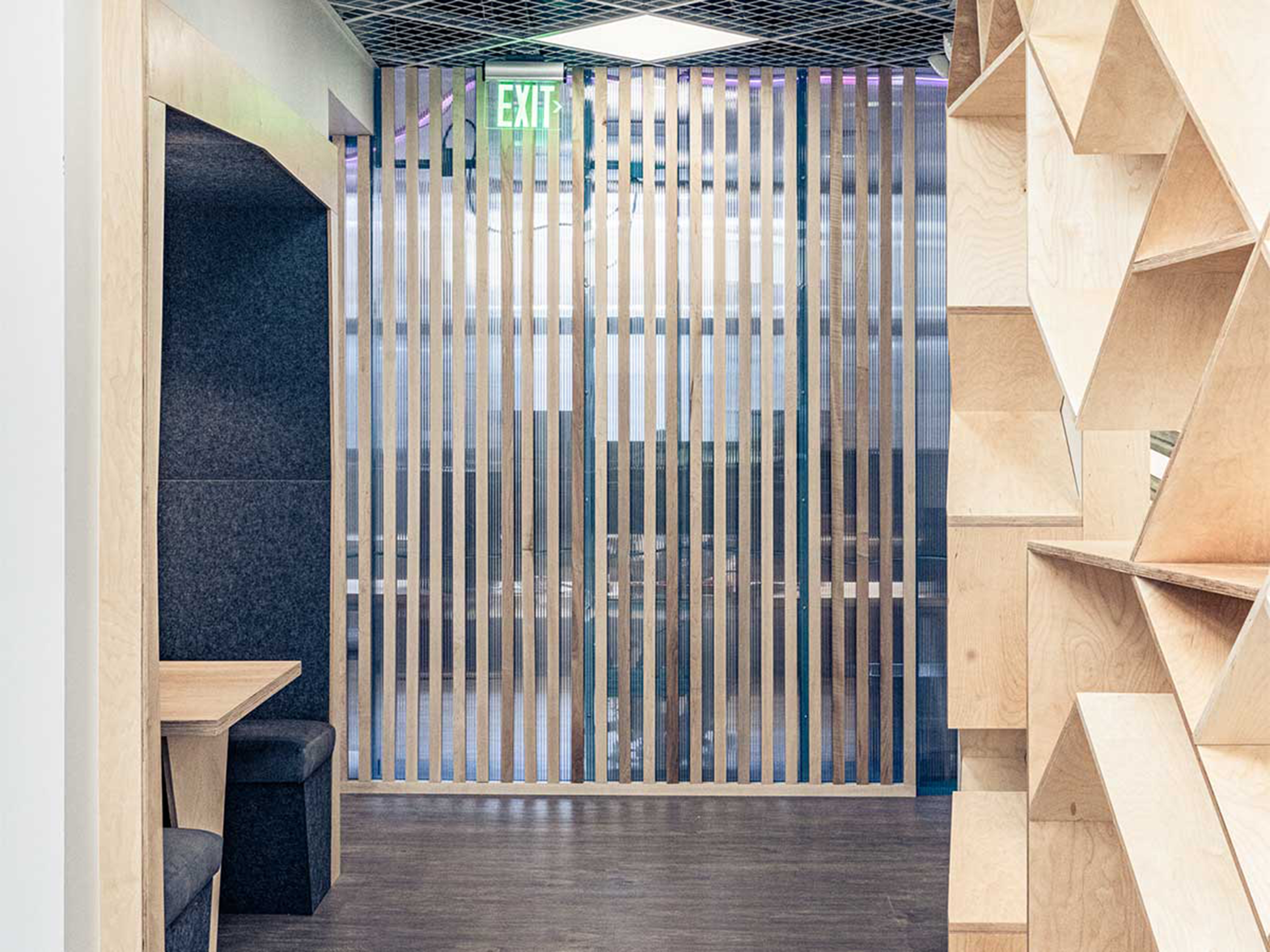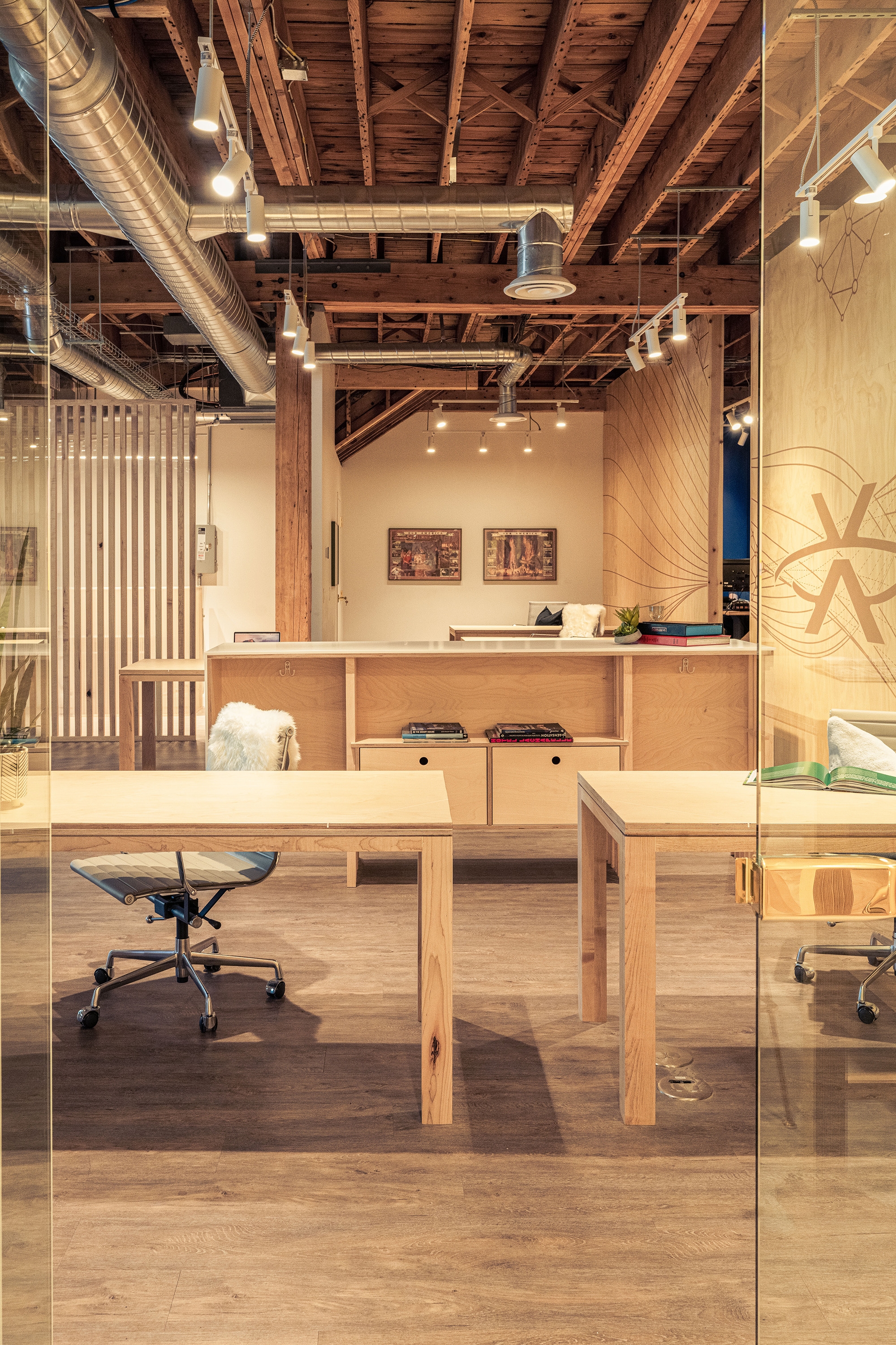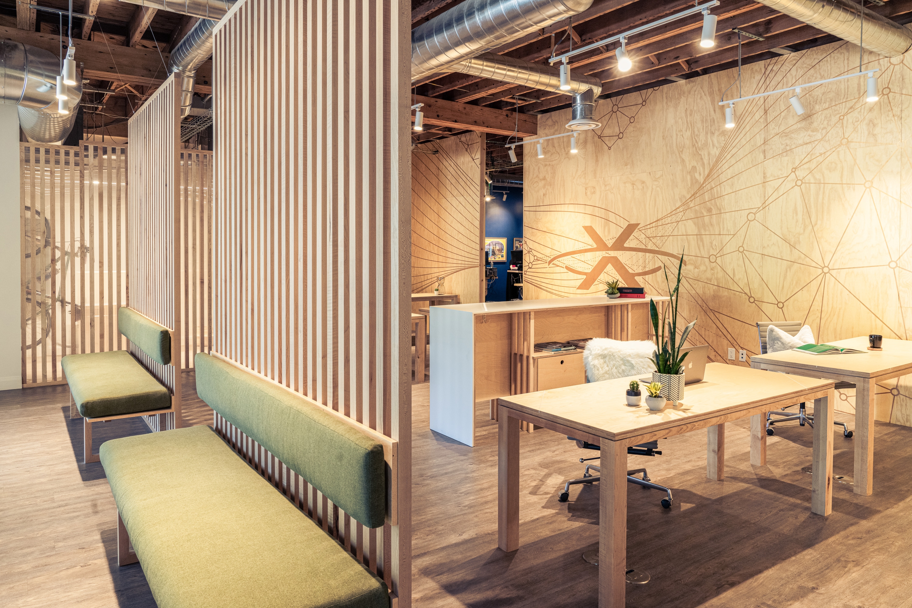 XMission is a derivative of the Tale of Cities concept–or, the disparate characteristics that exemplify the ethos of a place. To allow the four distinct zones to be a unique reflection of the user groups, the design team investigated the conscious and unconscious behavior to help define the optimal function. The sales (light) team demanded extrapersonal spaces full of light, flow, and collaboration; the tech (dark) team required introverted spaces with reduced daylight, pop-culture motifs, and gamer rooms; the admin (diffused) team requested diffused light and semi-private workstations; and, the exec (refined) team used custom fabrication as the vehicle to superimpose personalities on private offices. The in-house fabrication team crafted: plywood walls, maple slat partitions, mural paintings, polycarbonate walls over painted studs, booths, tables, desks, workstations, offices, and more. The tenant improvement adapts, preserves, and restores a historically protected building by sandblasting decades of interventions to restore the old-world charm of brick walls, wood joists, and steel beams. The existing building was transformed into a classical base with contemporary interventions.