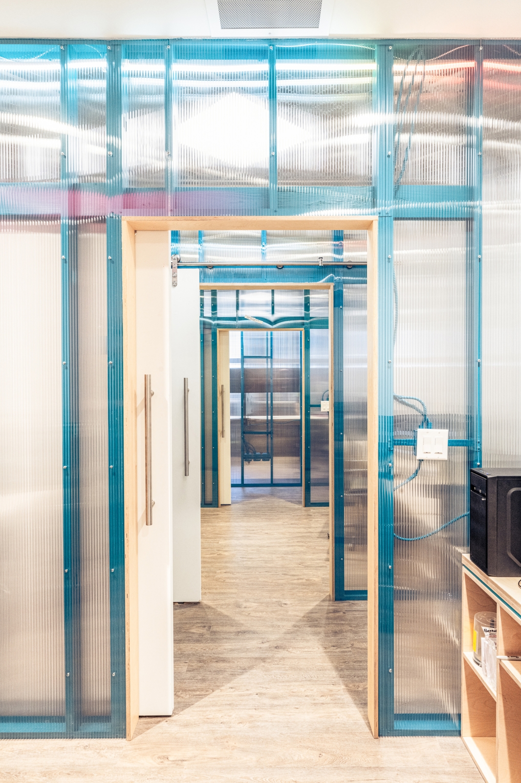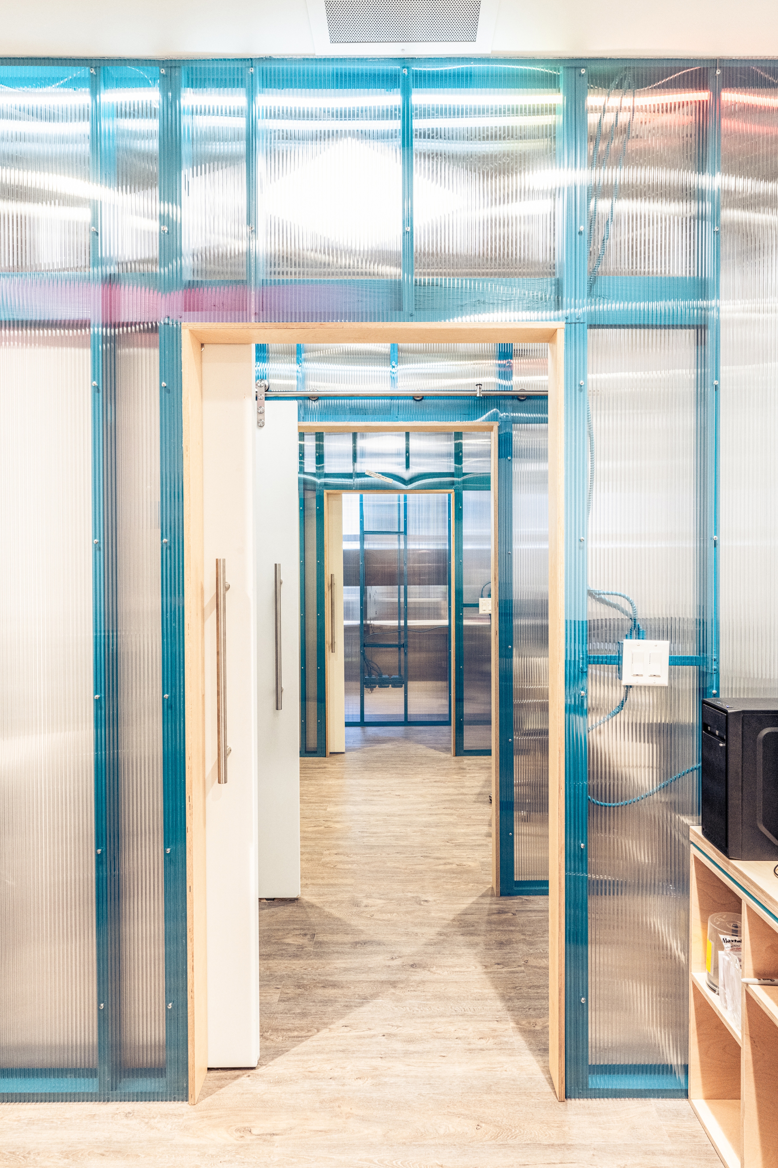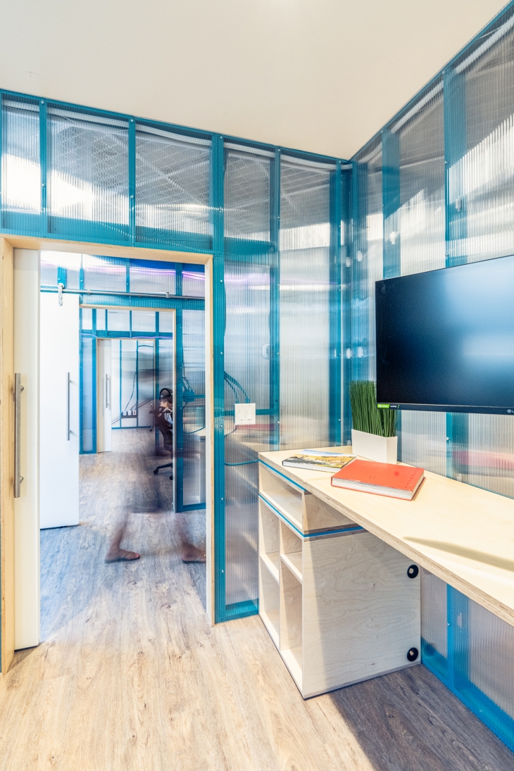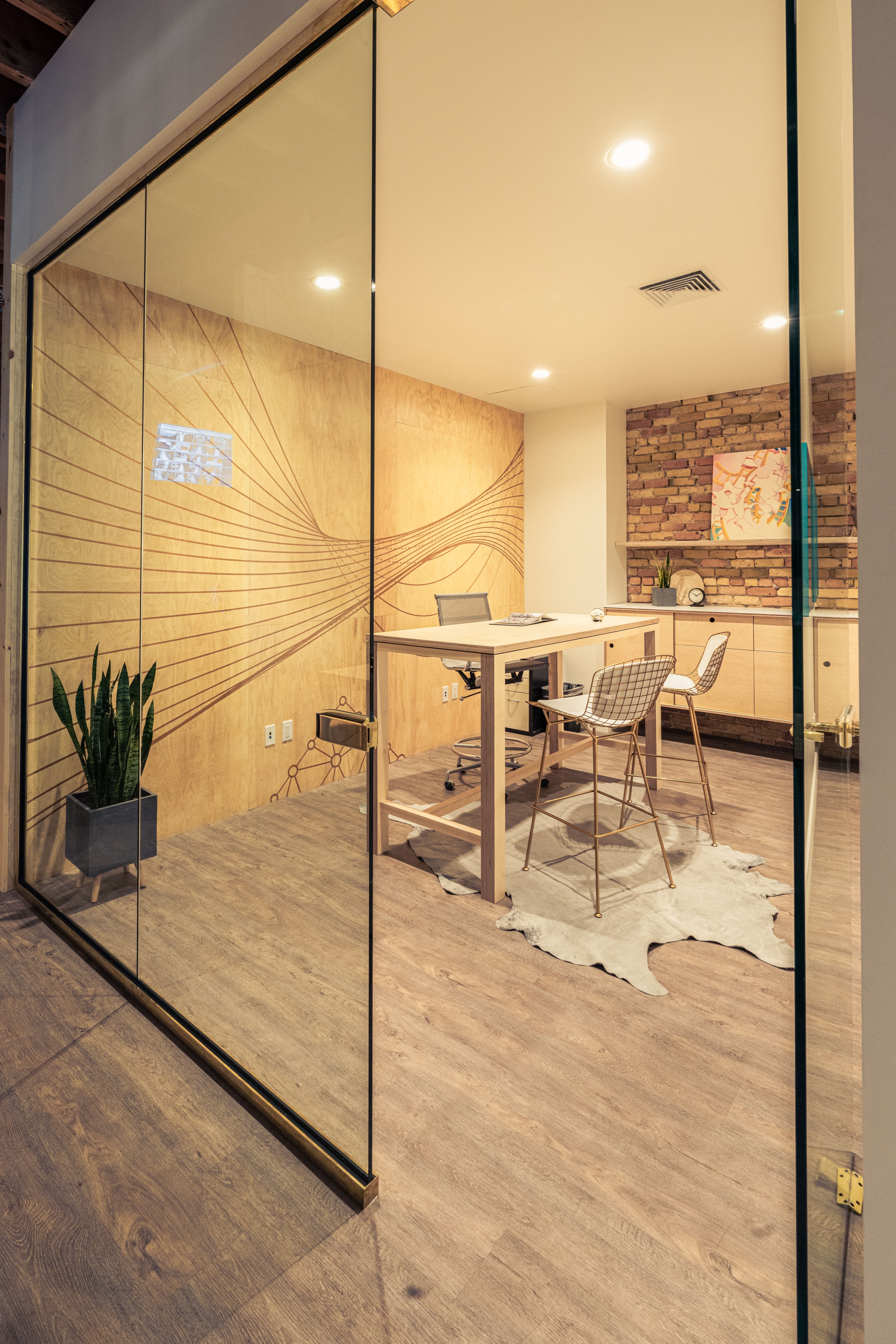 XMission is a derivative of the Tale of Cities concept–or, the disparate characteristics that exemplify the ethos of a place. To allow the four distinct zones to be a unique reflection of the user groups, the design team investigated the conscious and unconscious behavior to help define the optimal function. The sales (light) team demanded extrapersonal spaces full of light, flow, and collaboration; the tech (dark) team required introverted spaces with reduced daylight, pop-culture motifs, and gamer rooms; the admin (diffused) team requested diffused light and semi-private workstations; and, the exec (refined) team used custom fabrication as the vehicle to superimpose personalities on private offices. The in-house fabrication team crafted: plywood walls, maple slat partitions, mural paintings, polycarbonate walls over painted studs, booths, tables, desks, workstations, offices, and more. The tenant improvement adapts, preserves, and restores a historically protected building by sandblasting decades of interventions to restore the old-world charm of brick walls, wood joists, and steel beams. The existing building was transformed into a classical base with contemporary interventions.