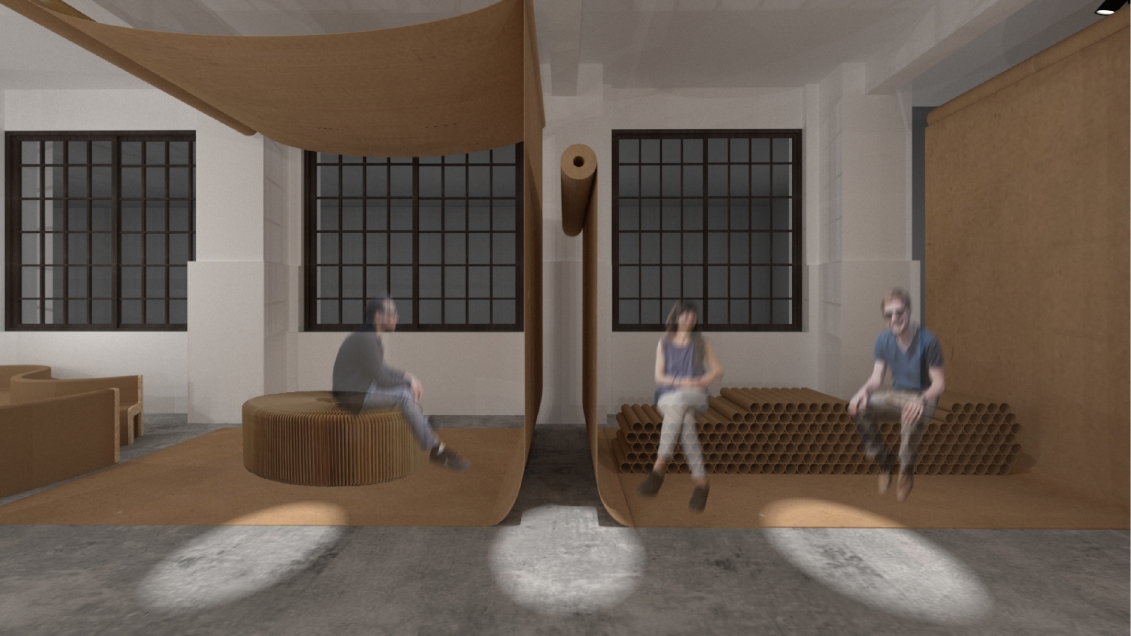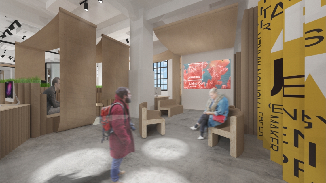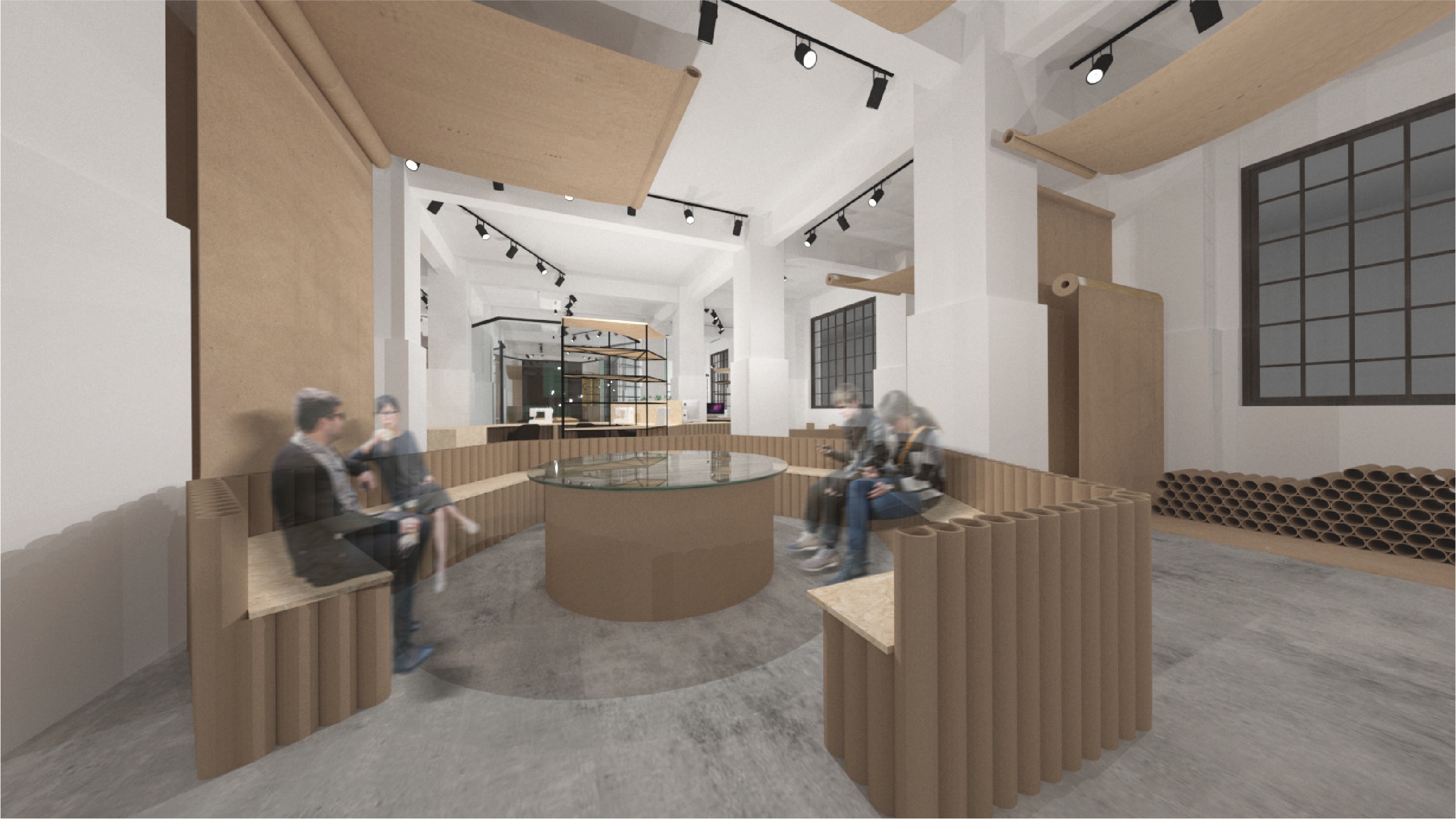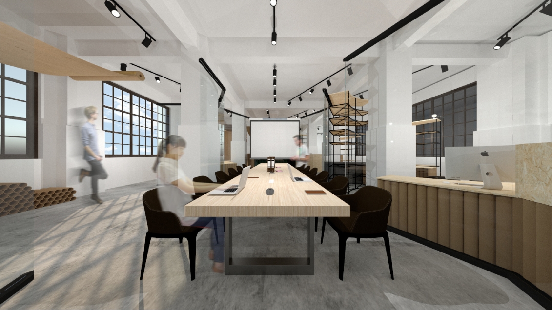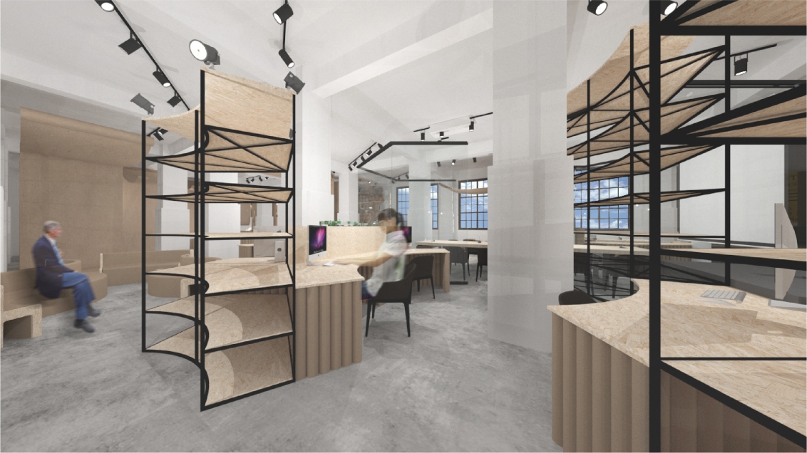 Creative Designer Co-work Space With recycled paper as the main axle, this design adopts the concept of recycled paper, using the process of recyclable materials: cleaning, precipitation and paper making as the concept. Through the four techniques of cutting, flowing, condensing and stacking, and through the reproduction of paper, it shows the new possibilities of eco-fashion to create organic space in which creators can express their creativity to the fullest.