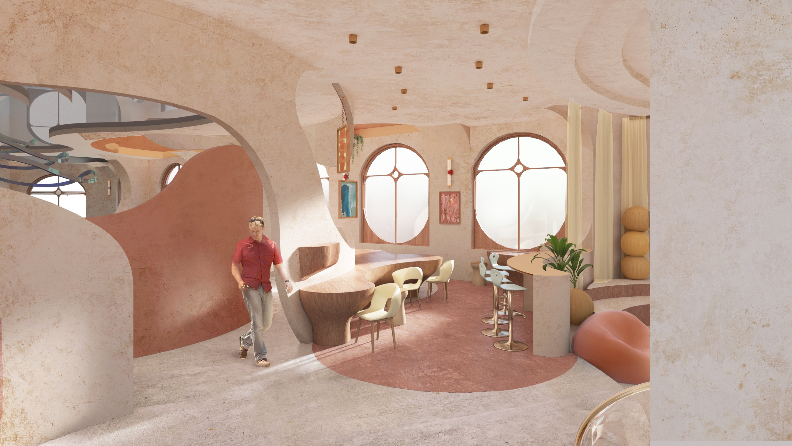 Inspired by the concept of ripples, the site is like a calm surface of water and ripples are created when people start socializing. Curved walls and wall openings design allow for more interaction with the space.