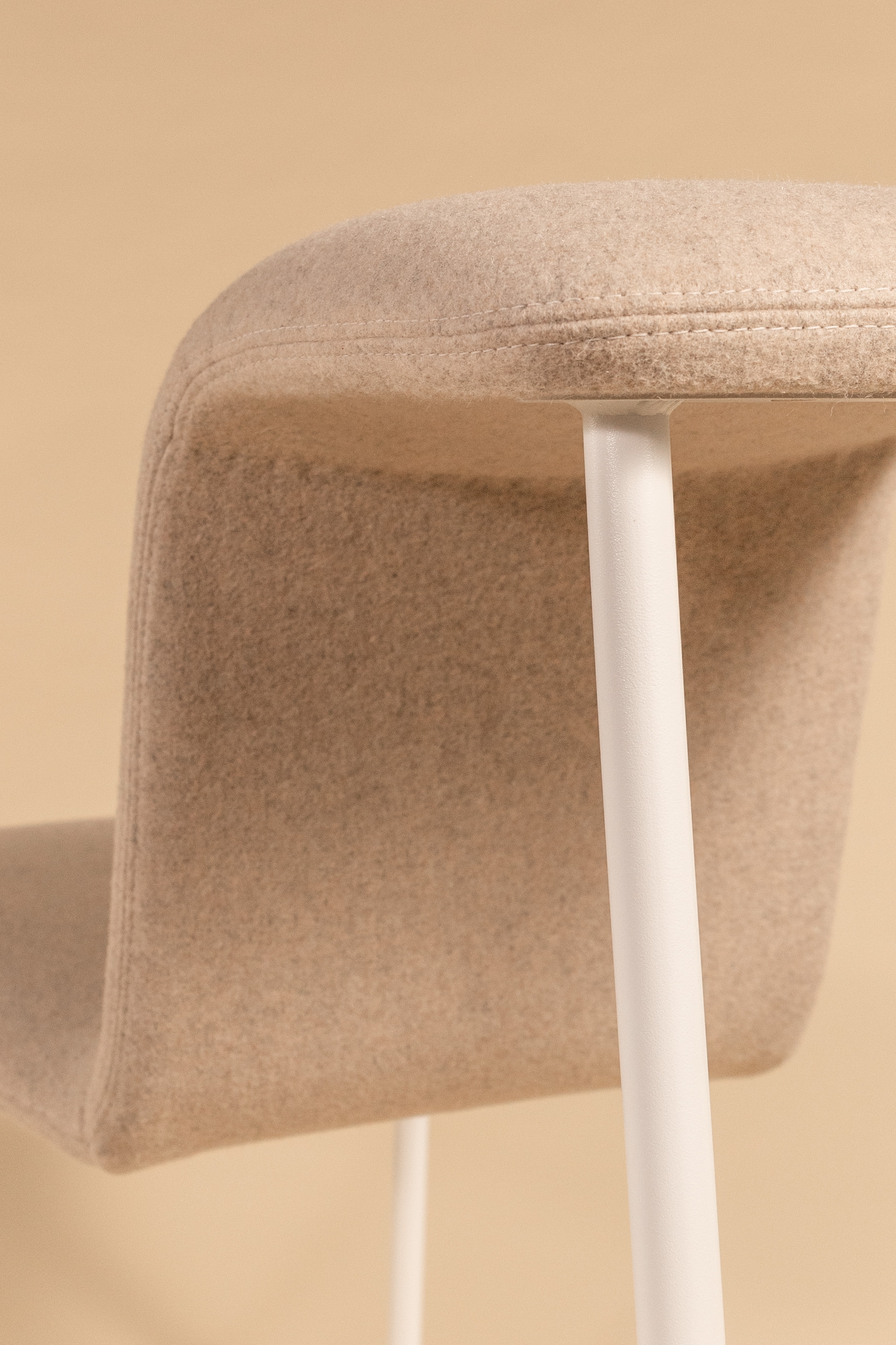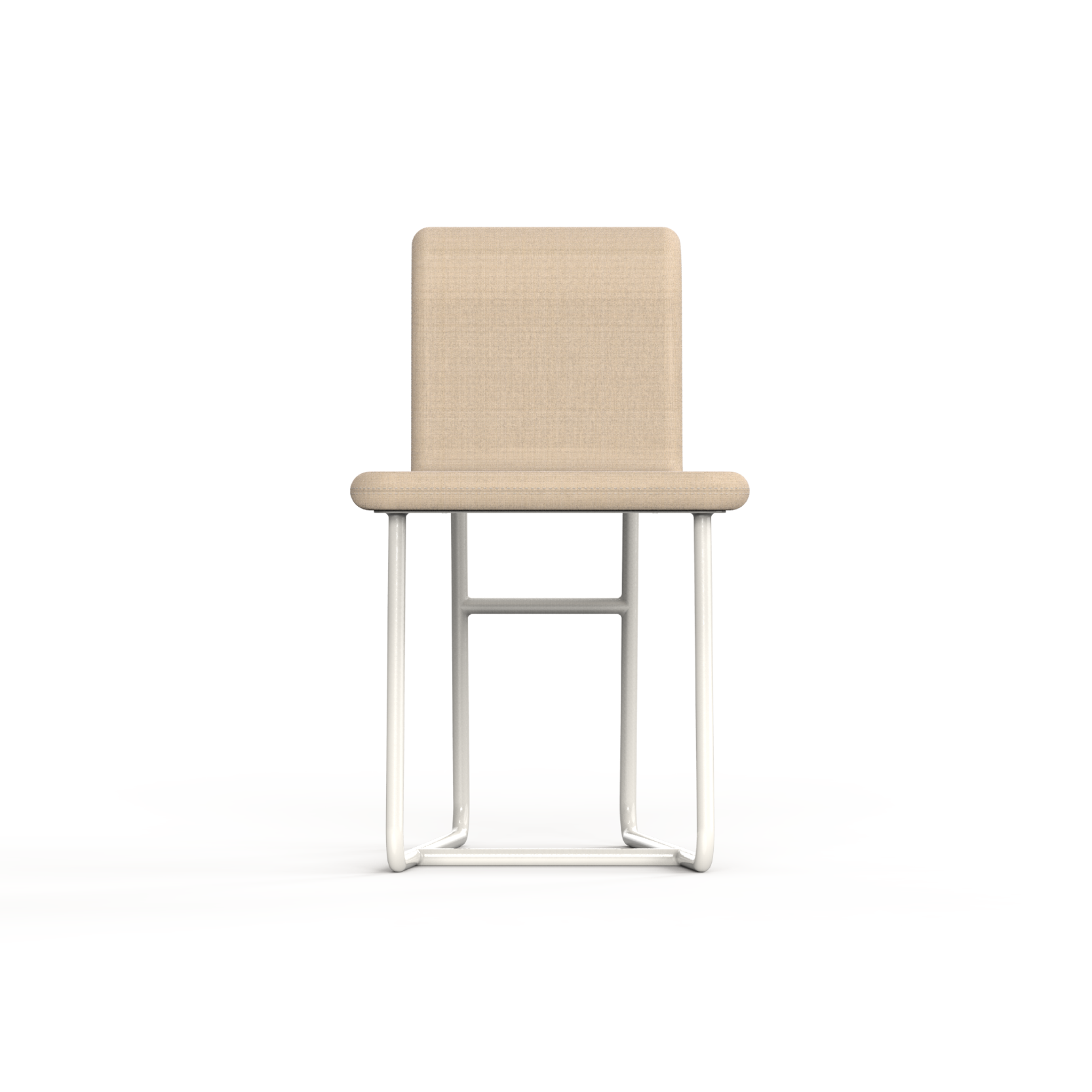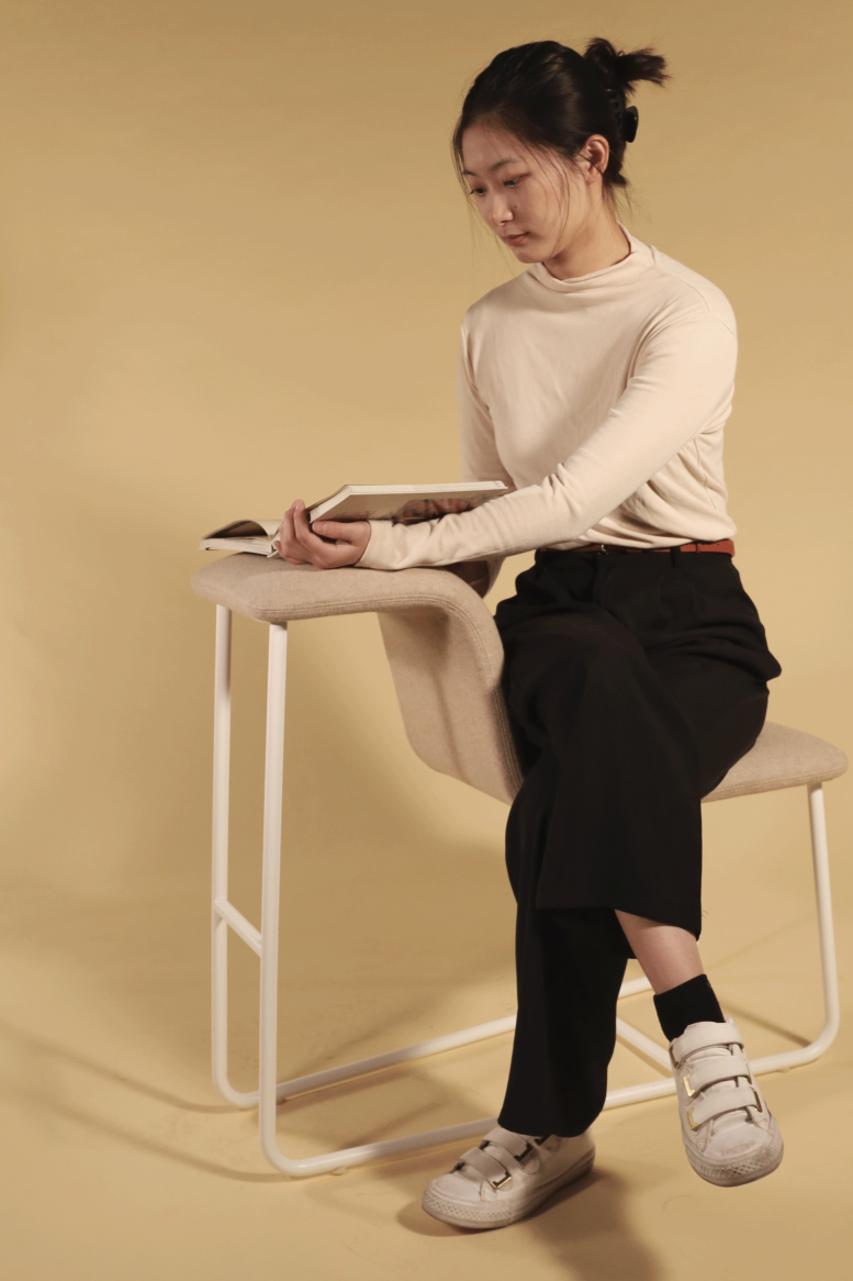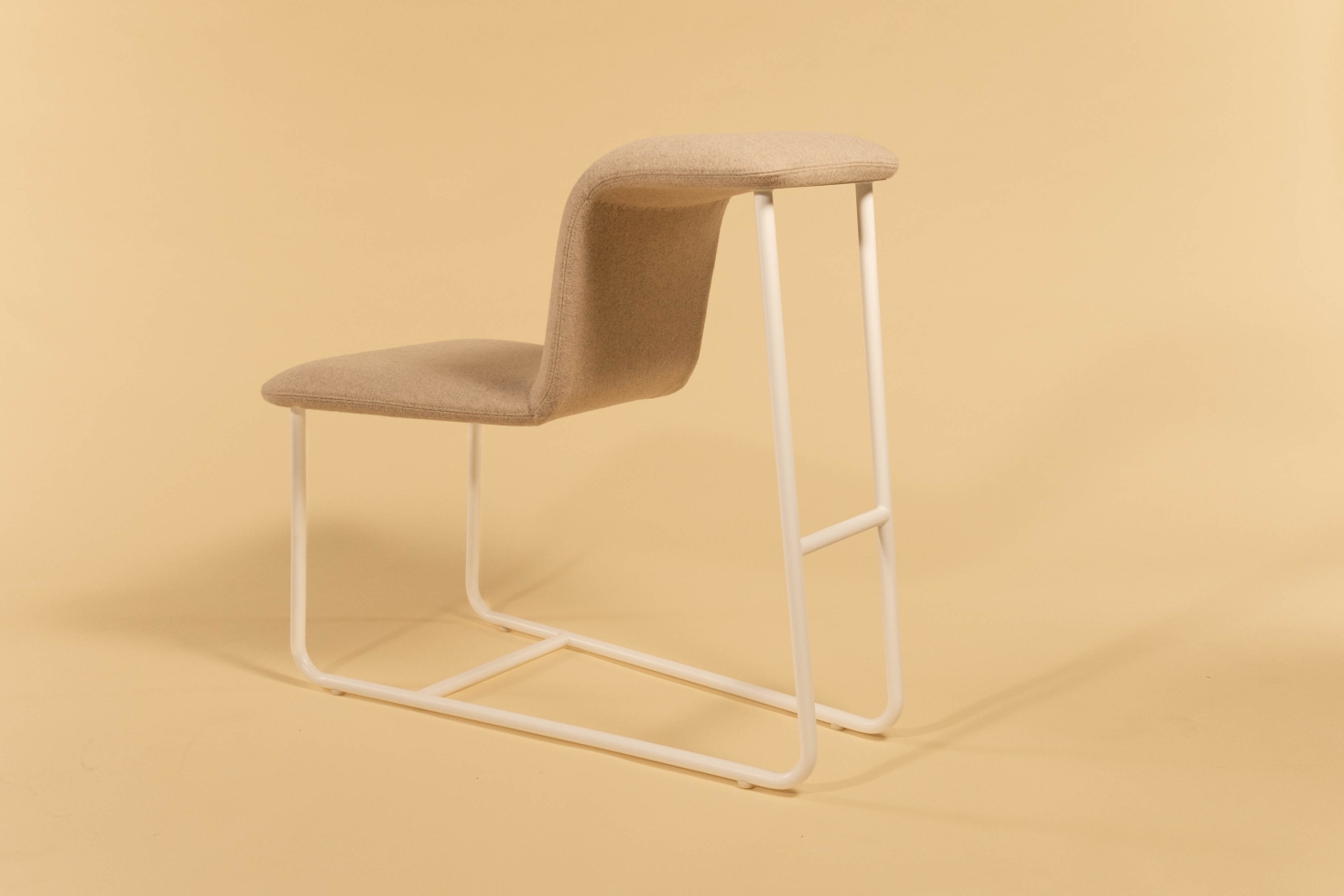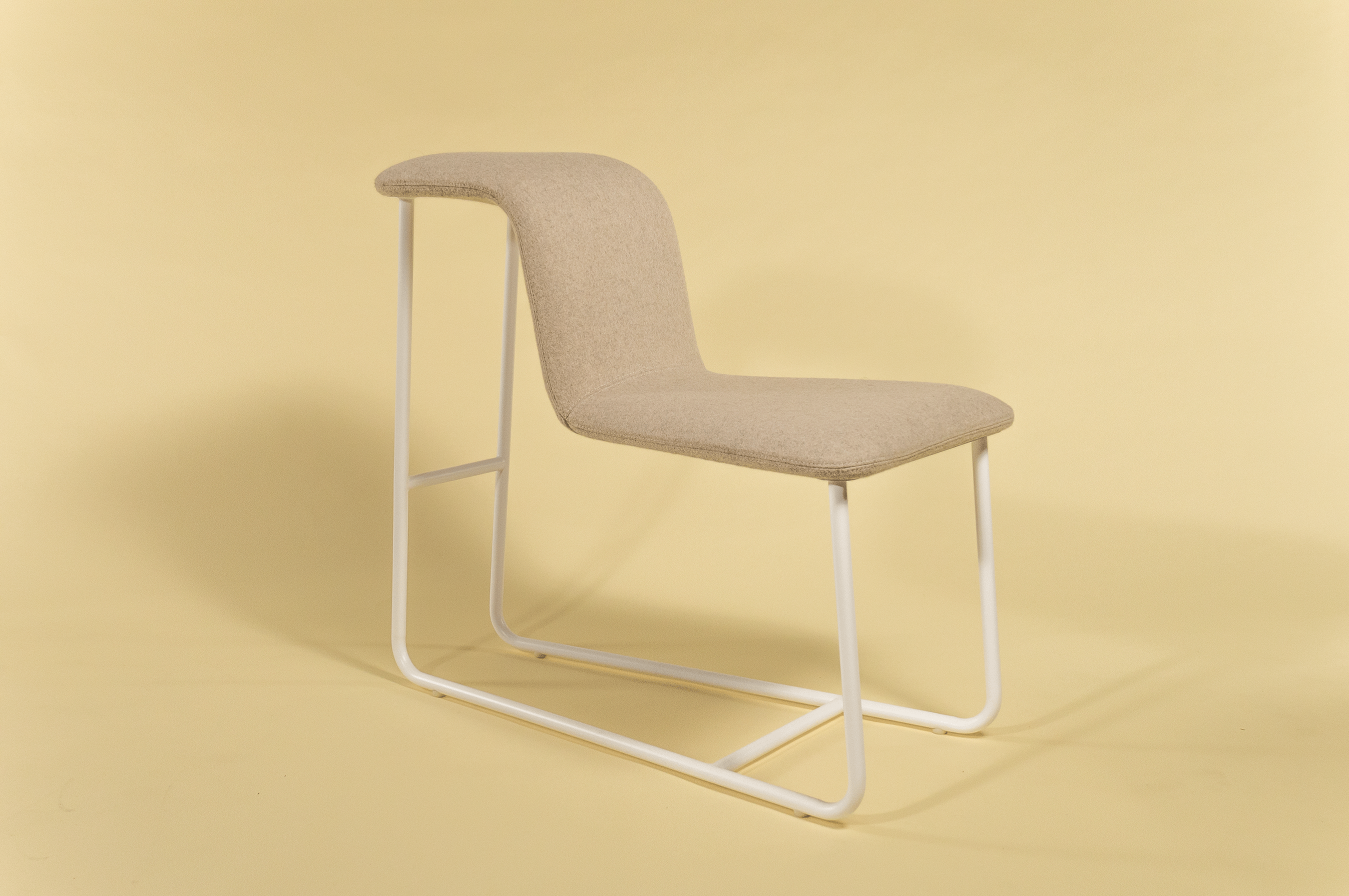 For design details, it uses light colors for a casual vibe, satin white leg for a mobile visual, and stitchings with a vibrant contrast. The dimension of the chair is 31.5in wide, 17in deep, and 28in high. The seating height is 17in, and the Fexi-surface is 28in. The multipurpose surface is made with bent plywood wrapped with upholstery, and the “skating blades” (legs) use steel tubes with powder coating.