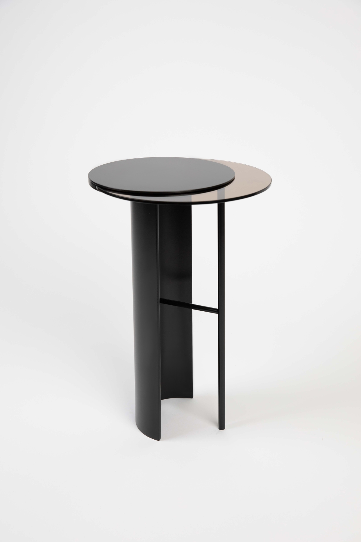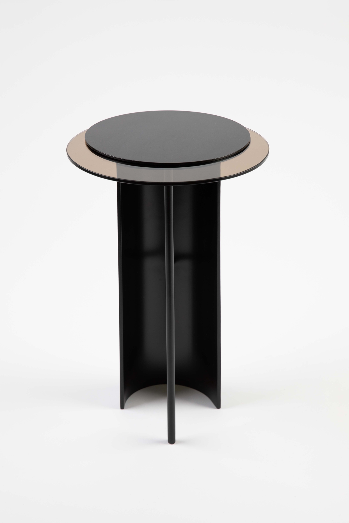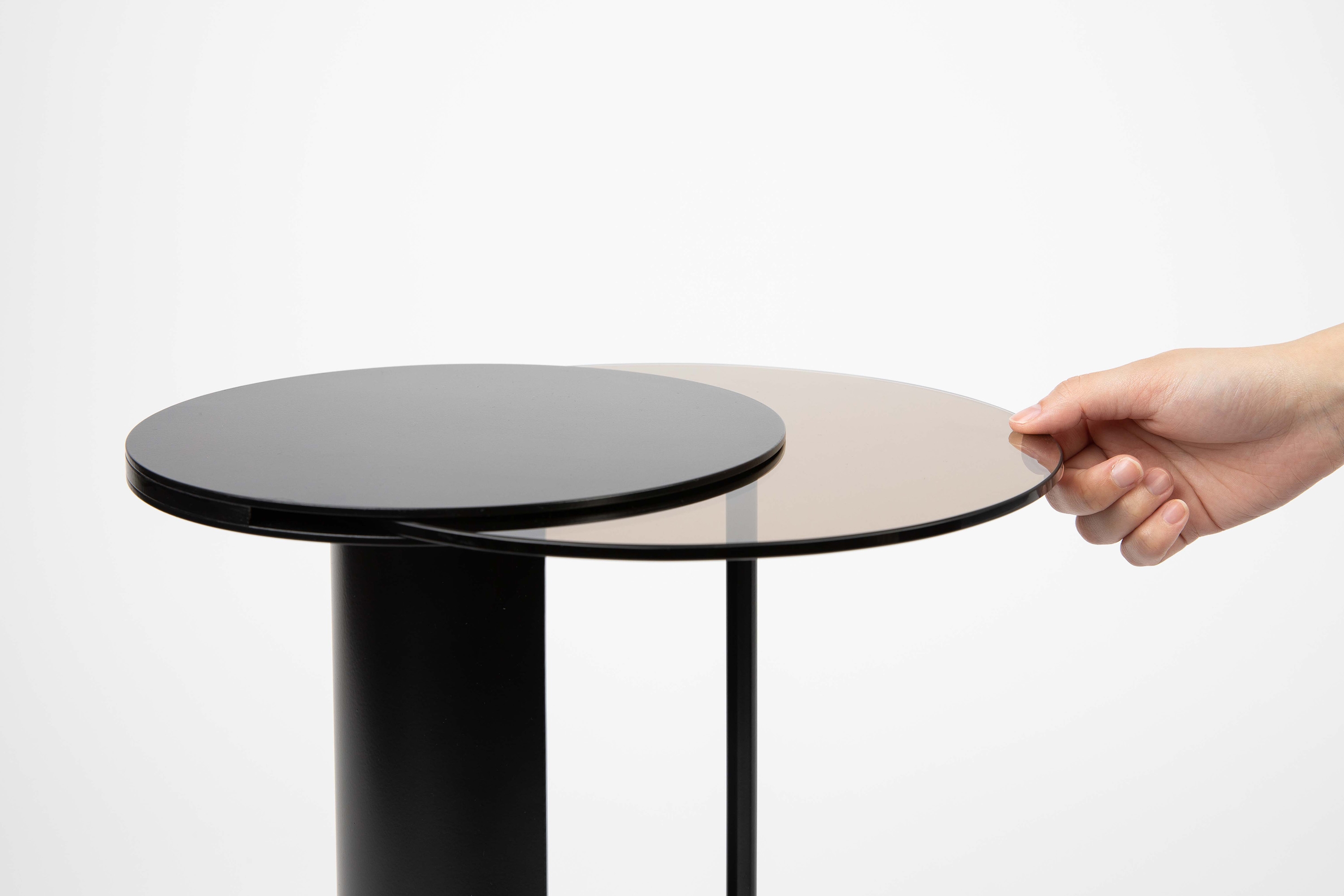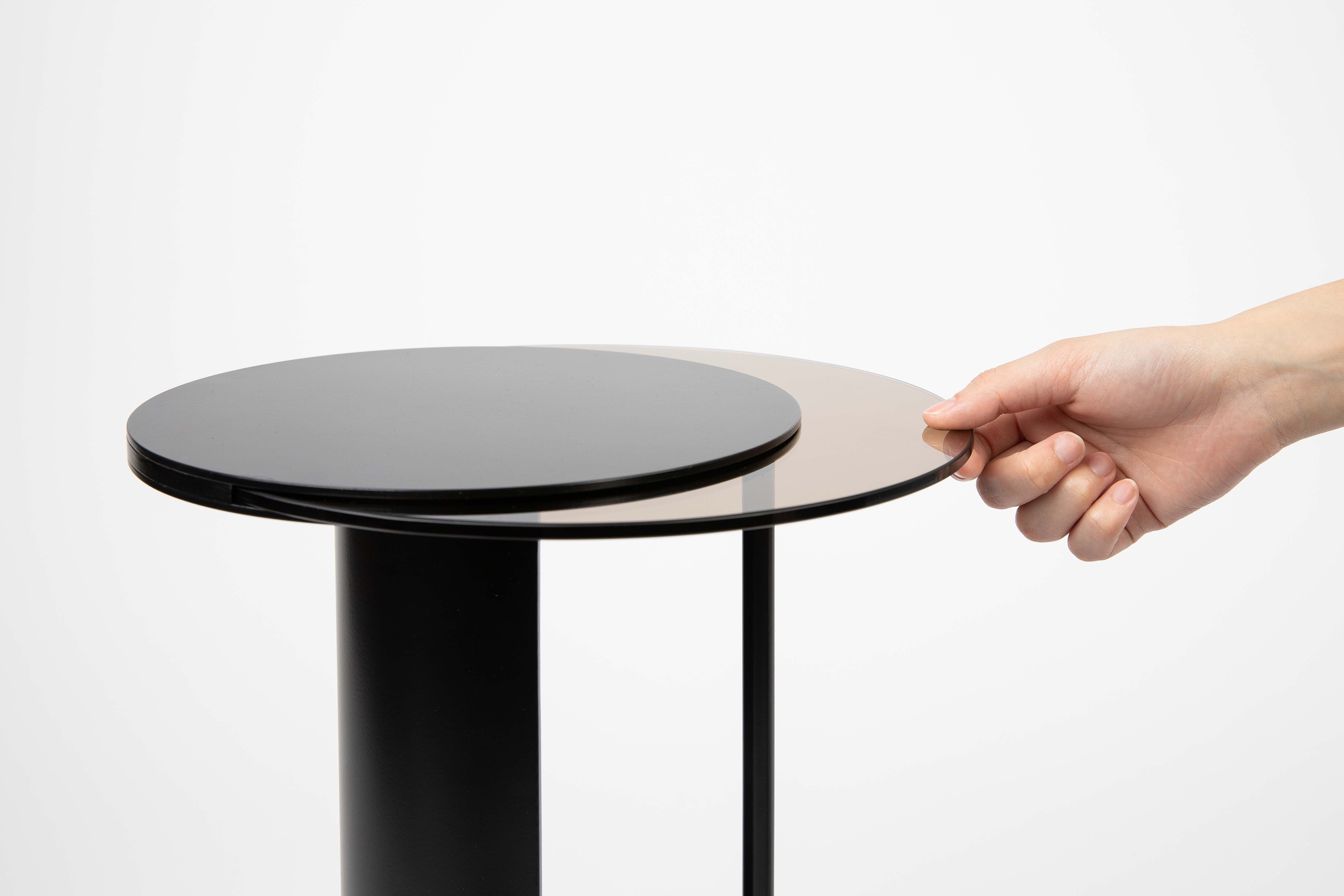 For Wander's tabletop, the adjustable bronze glass allows you to expand to the range you like. It simulates sunlight reflected during an eclipse. Asymmetrically shaped supports for the left and right sides of the table legs convey the conflict and contradiction between the current situation of the self and the external reality. The glass on the top can be seen through as if the inside ego wanders in between different states. Wander allows you to contemplate and enjoy a moment of peace.