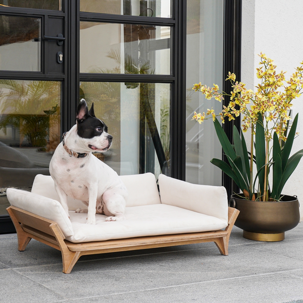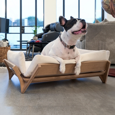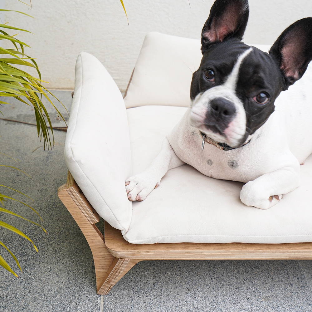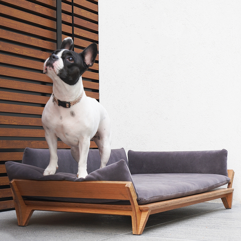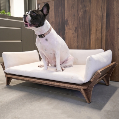 With 3 sides of the sofa to rest against, the dog is provided with support while relaxing in a wide variety of positions. The sofa’s height and the open angles of its sides allow the dog easy access as it approaches from any direction. The upholstery can be detached from the wooden base for easy cleaning.