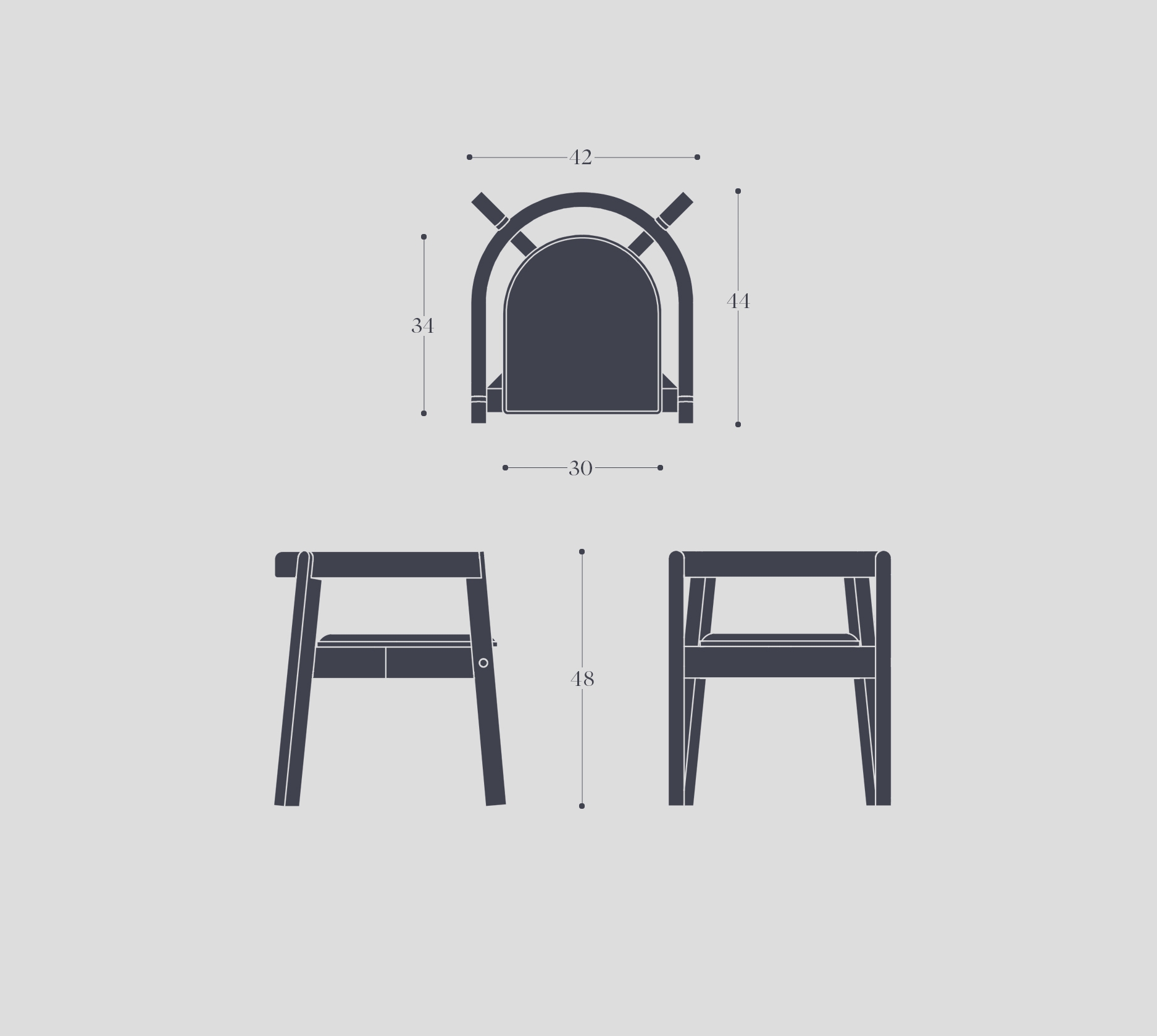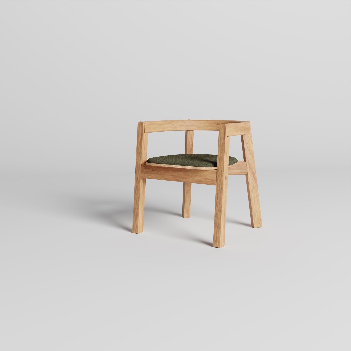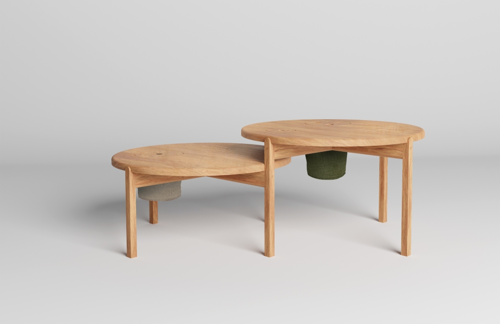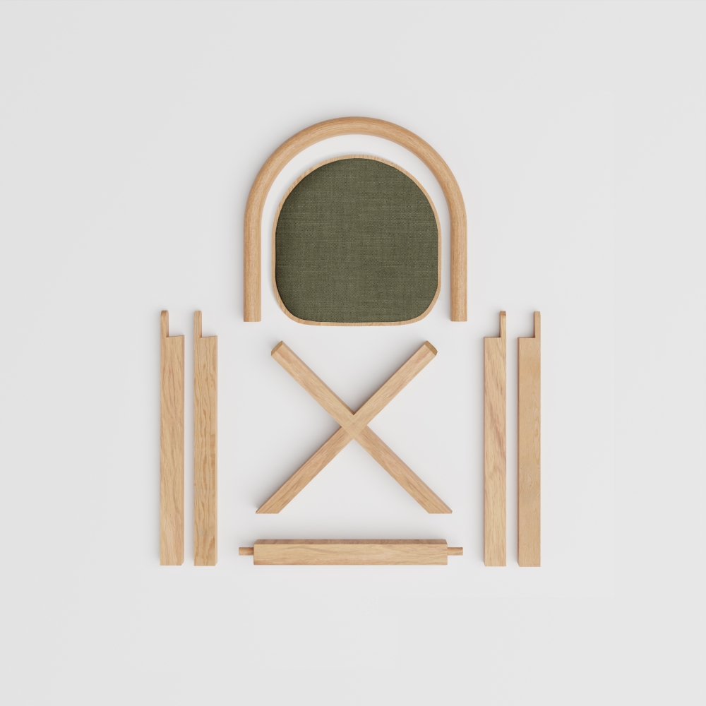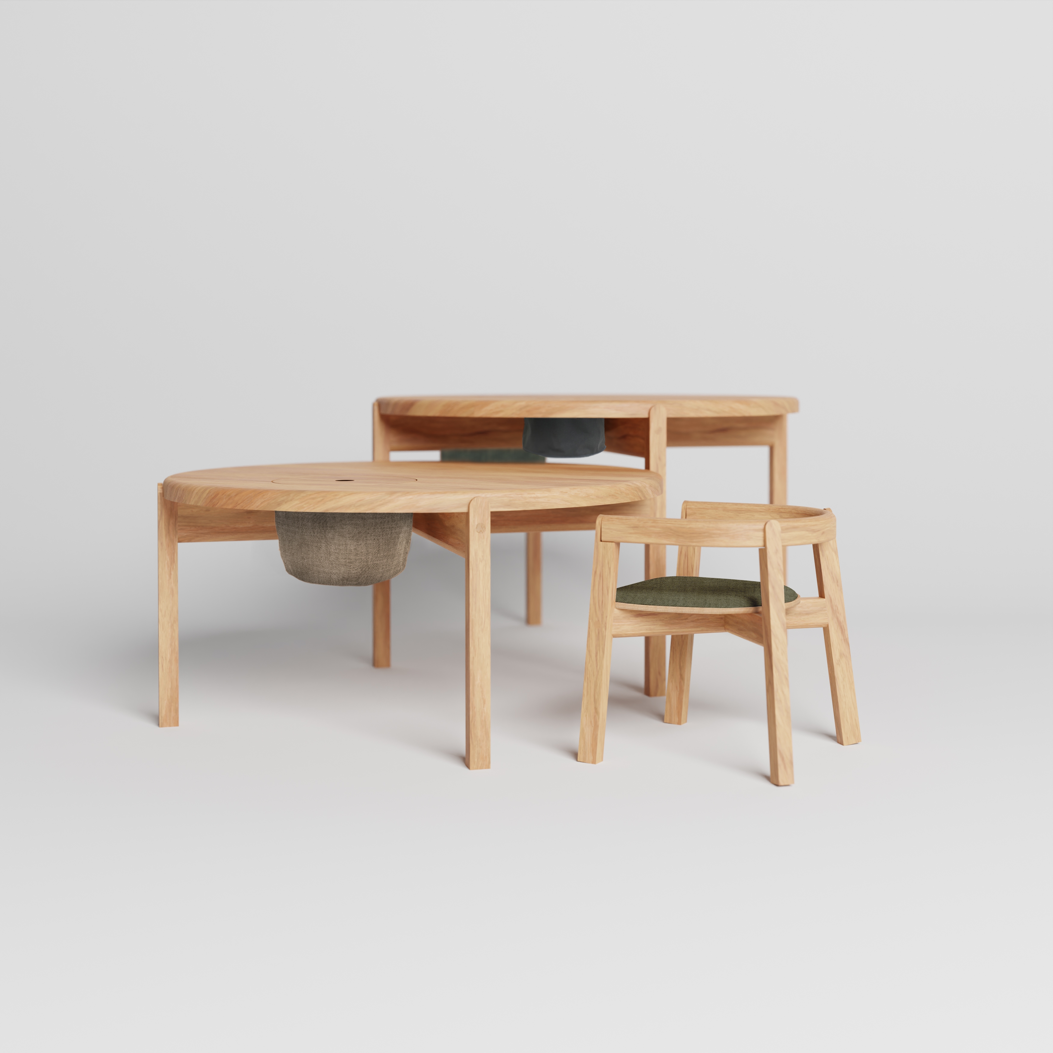 The form of the chair follows the design of the table. Its rounded backrest refers to the oval shape of the table, and the upholstered seat corresponds to fabric pouches. All material proposed in the project, both the chair and the table, are renewable and recyclable.