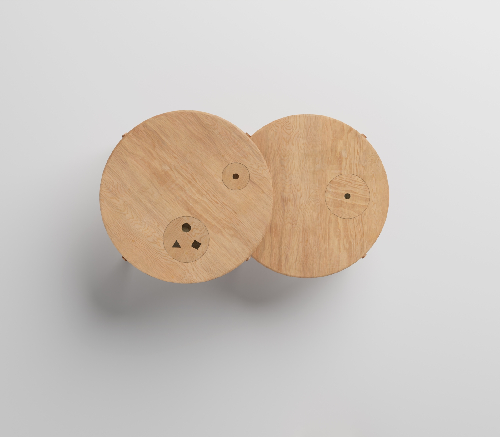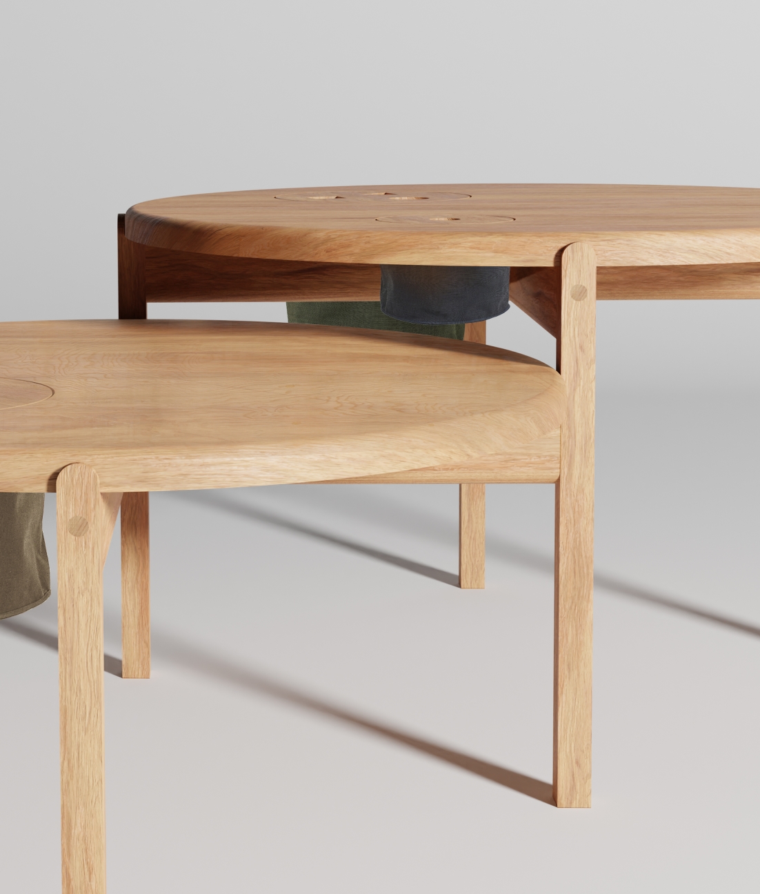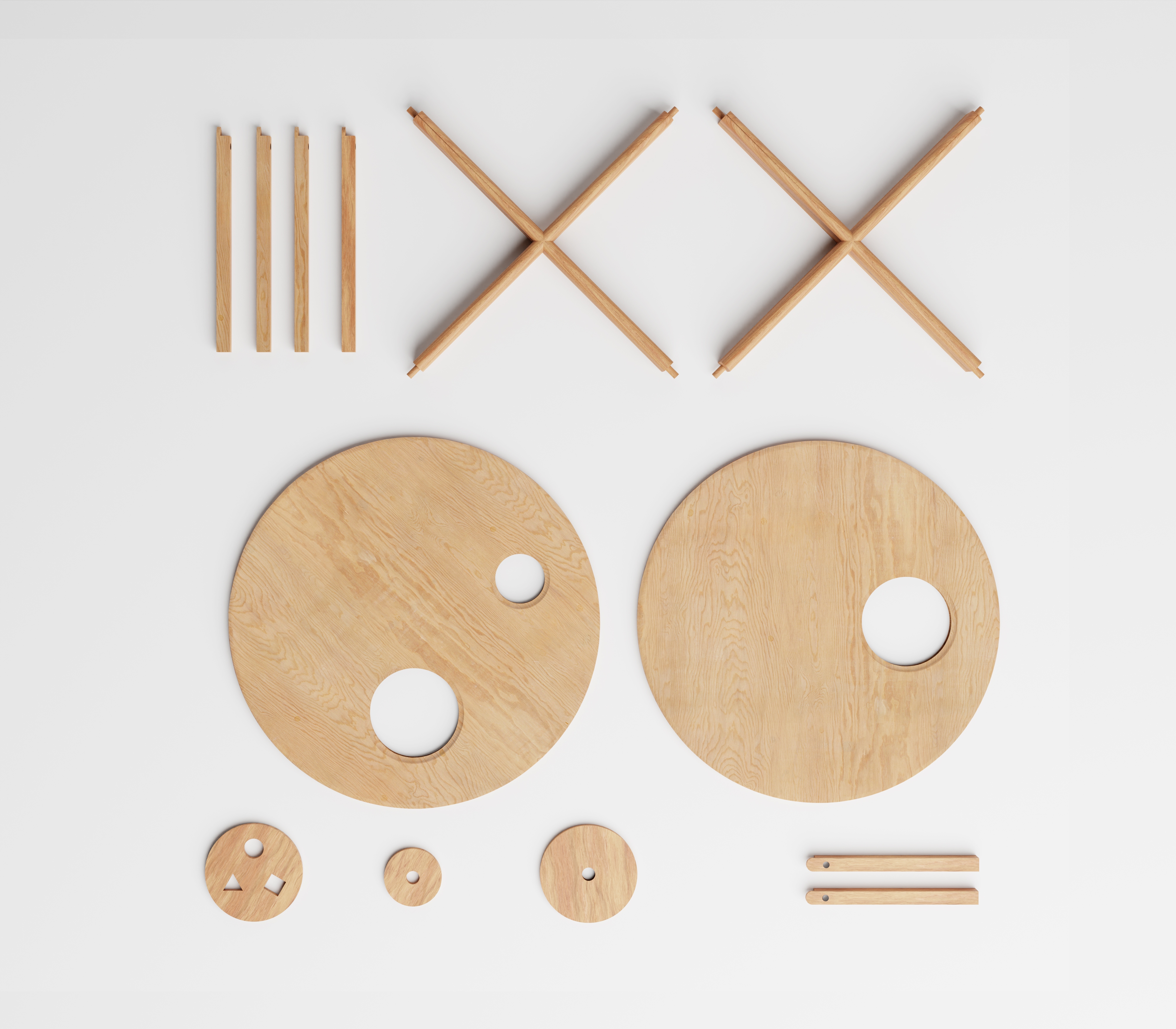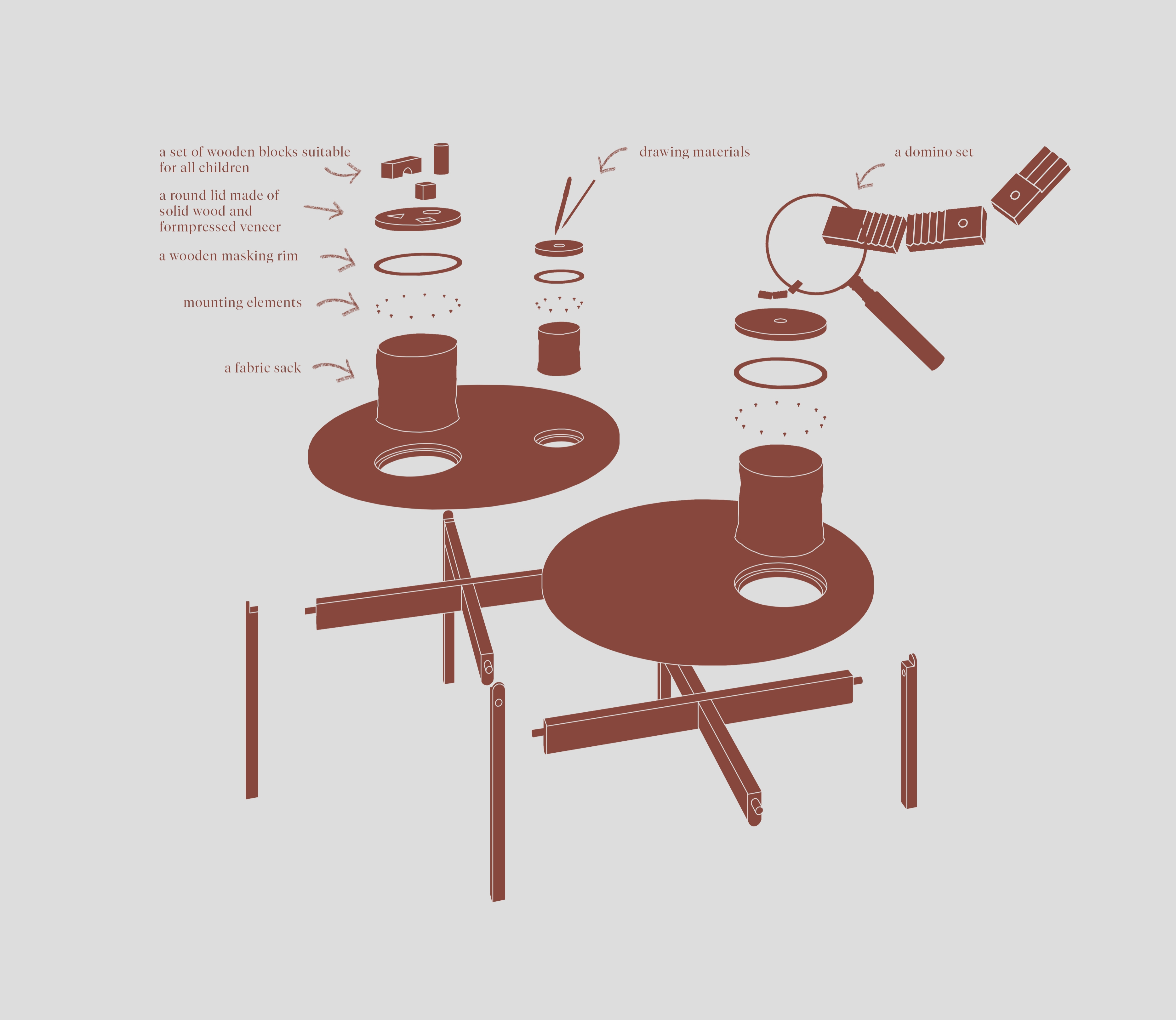 So that the play is possible, a special space for toys and drawing materials is needed. These items are supposed to be kept in colourful, fabric sacks, placed below the table, witch various colours allow for personalization. The dimensions of single elements let us combine them differently. If it is needed, the double table tops can be transformed into two single tables, just by adding two table legs. This also allows us to adapt the table to home conditions, private spaces and the needs of a specific user.