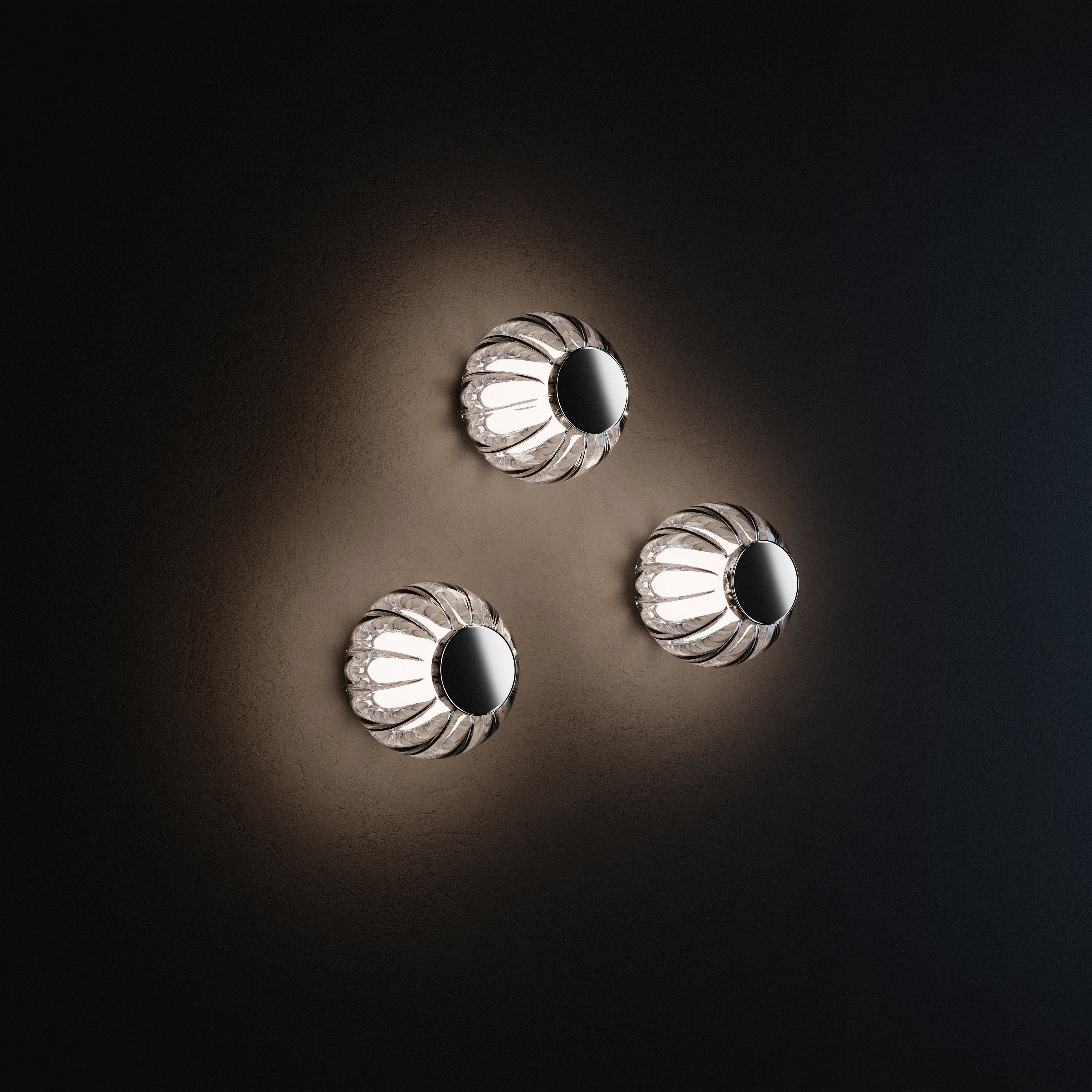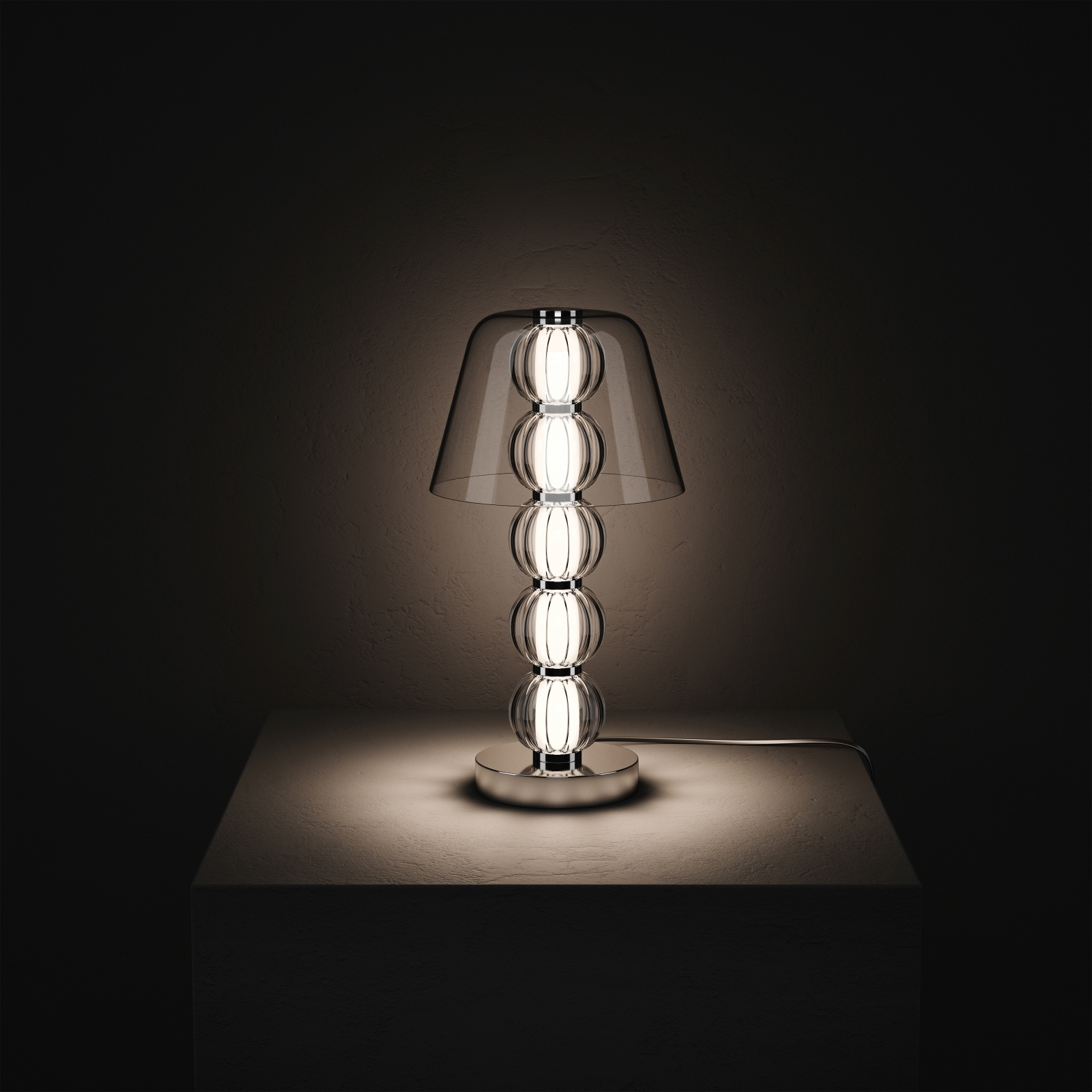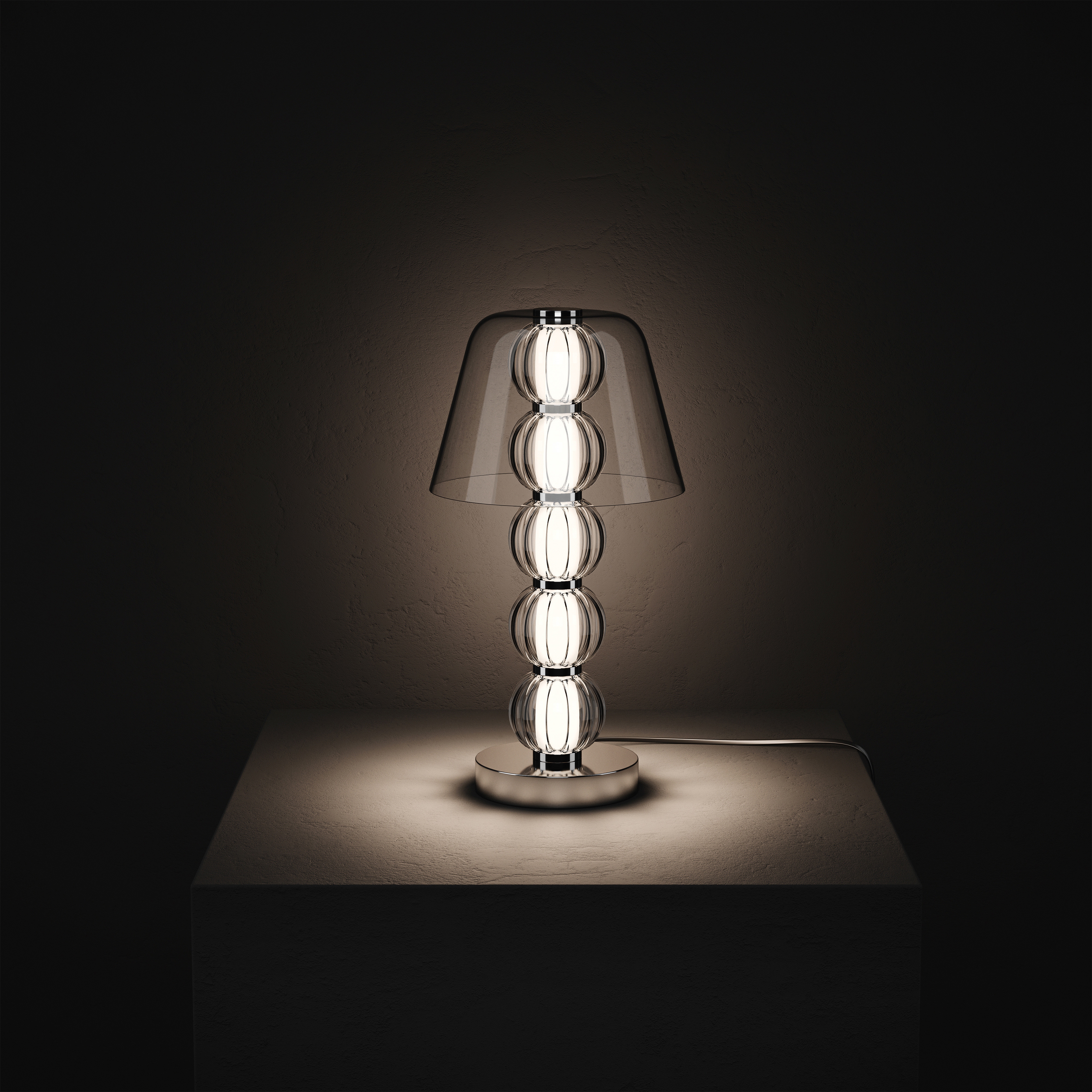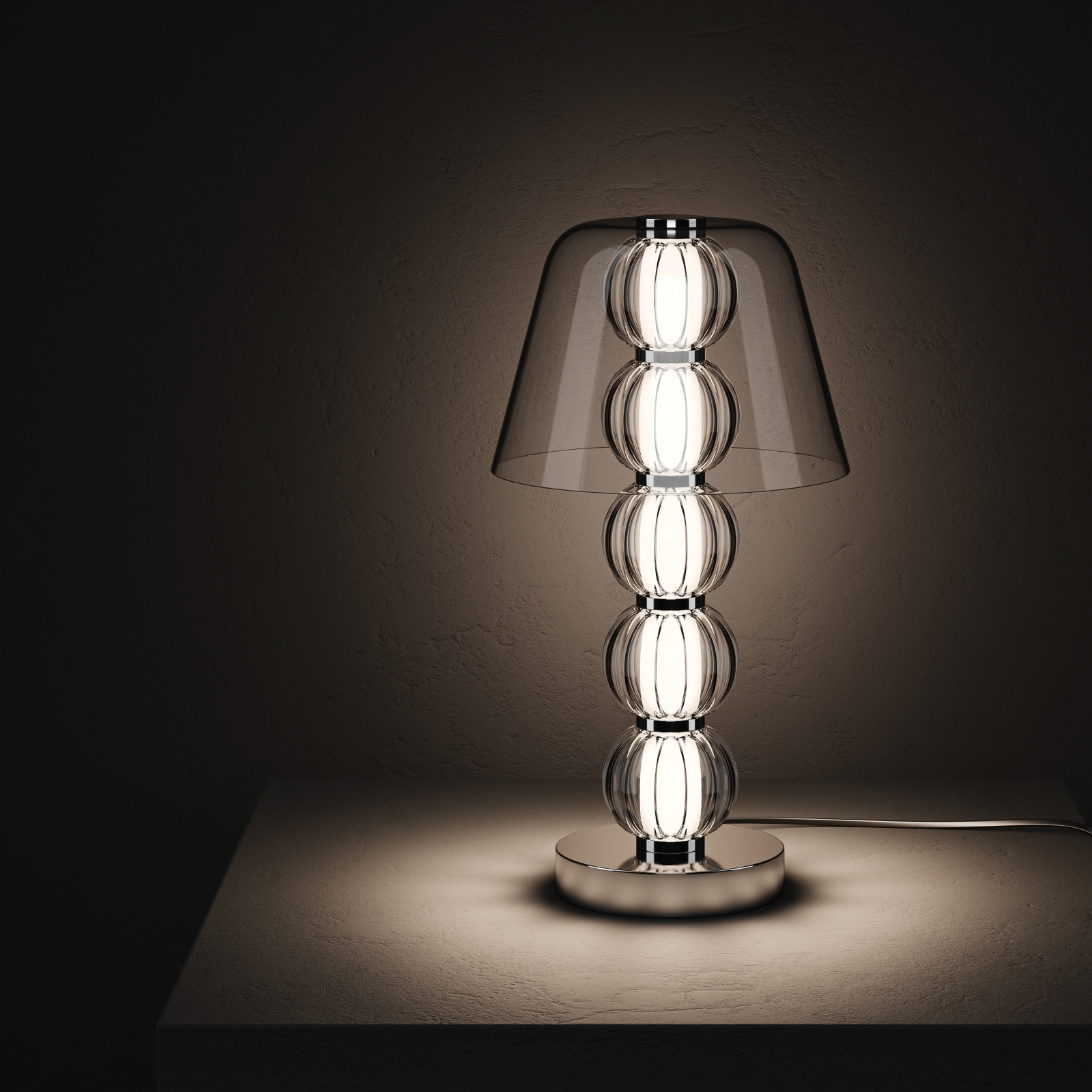 Mouth-blown glass, acrylic, metal, LED. Lighting diameters: 525, 740, 885 mm. Table lamp height: 450 mm.