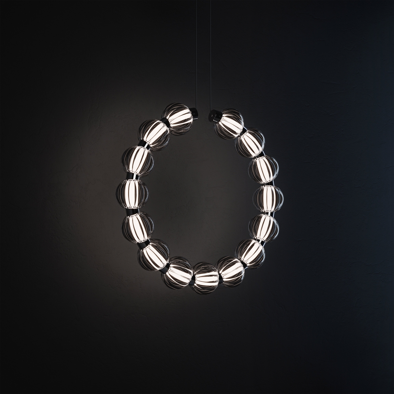 The “Amulet” lamp family is inspired by the basic magic of natural objects and materials. Sacral images of African josses and the most modern lighting technologies were combined to bring up one of the most ancient intuitive senses of domestic space enchantment that people experience since the pre-historic age. Handcrafted glass beads are strung on the chain base of modernly designed acrylic and LED elements to keep the soul light up in a modern living space.