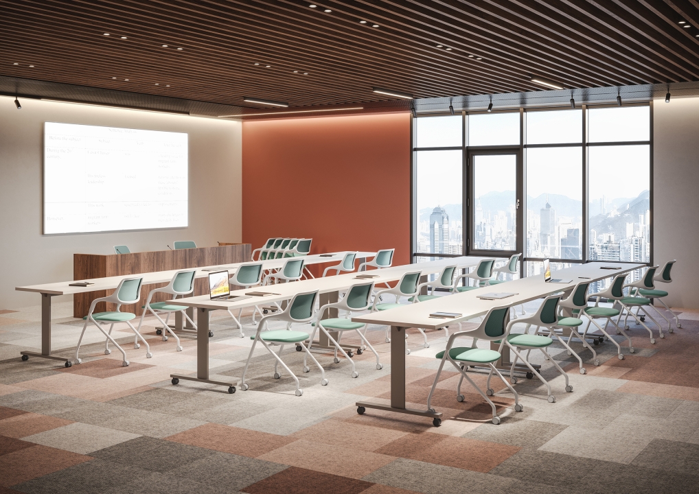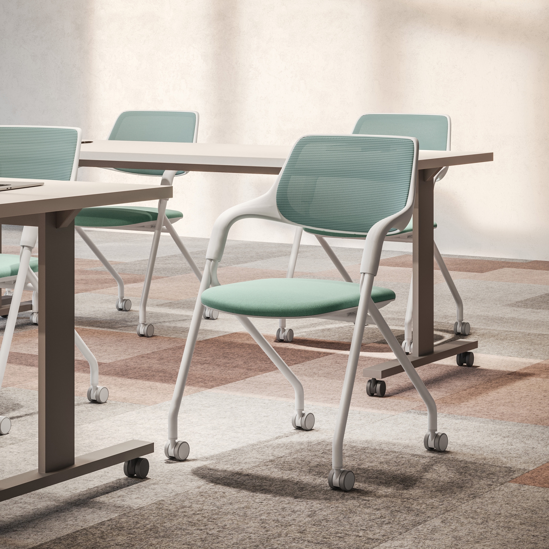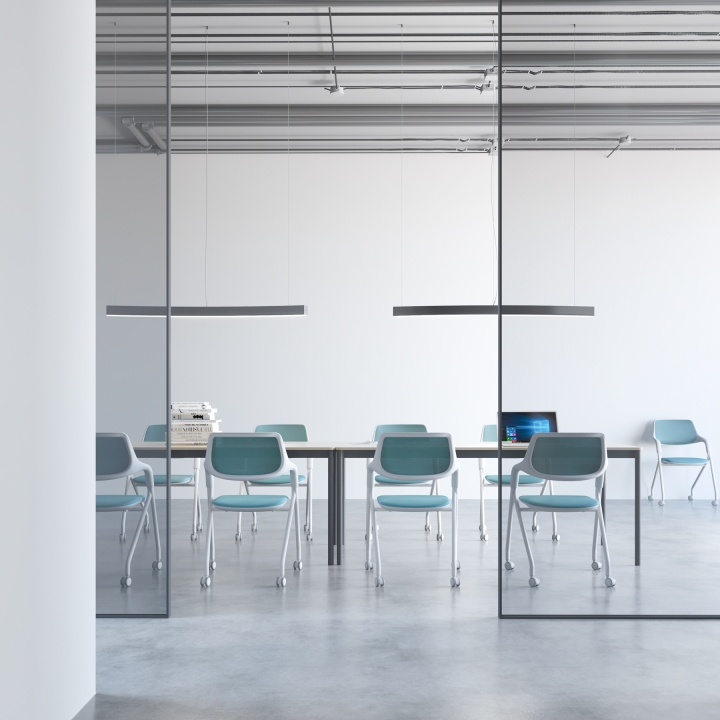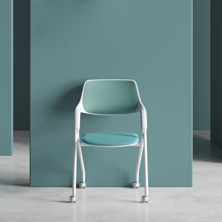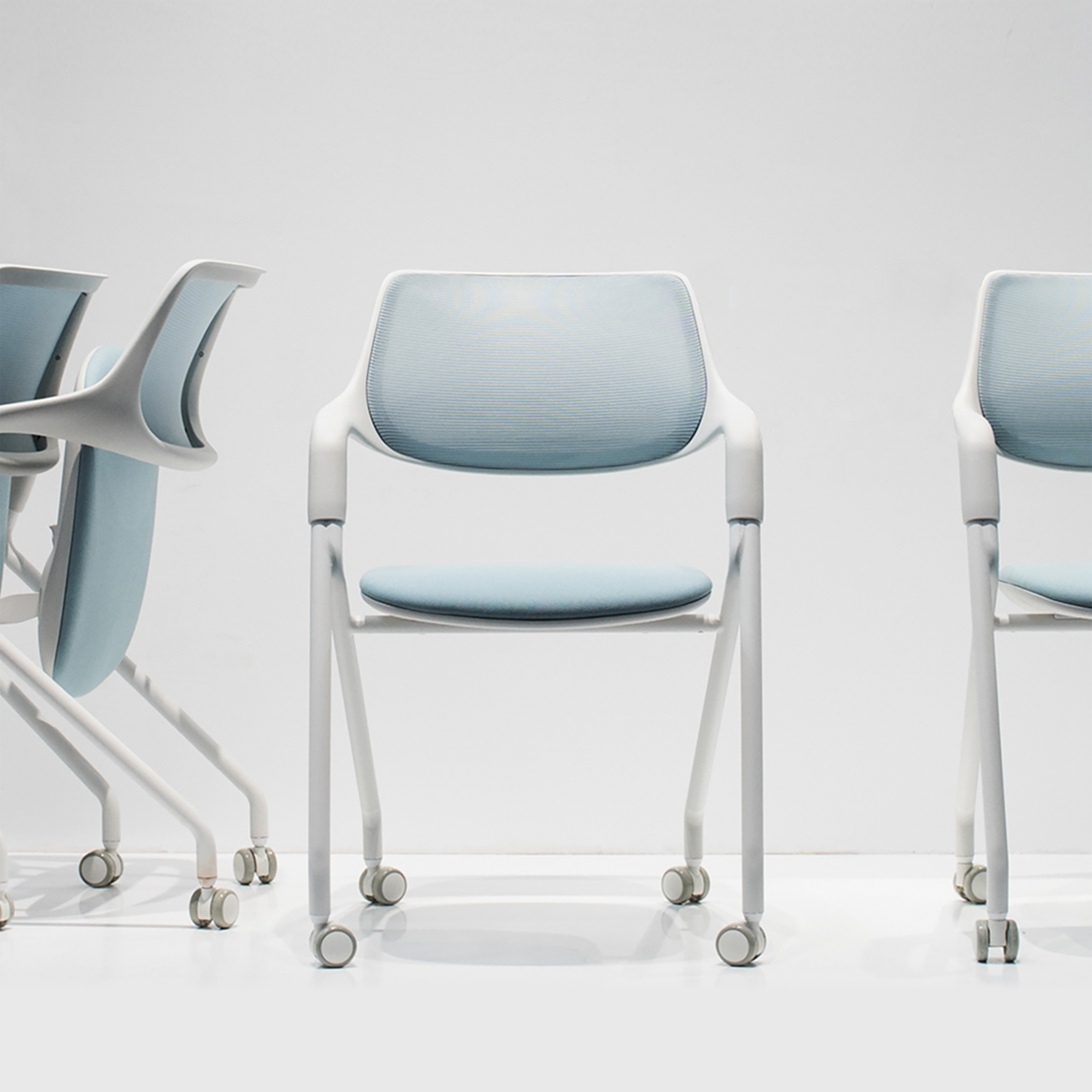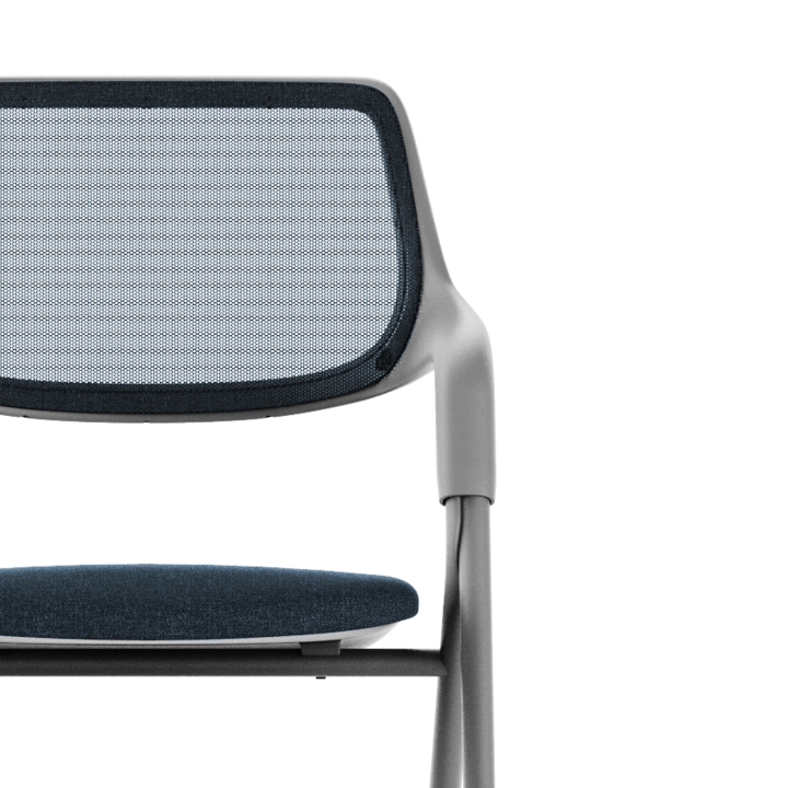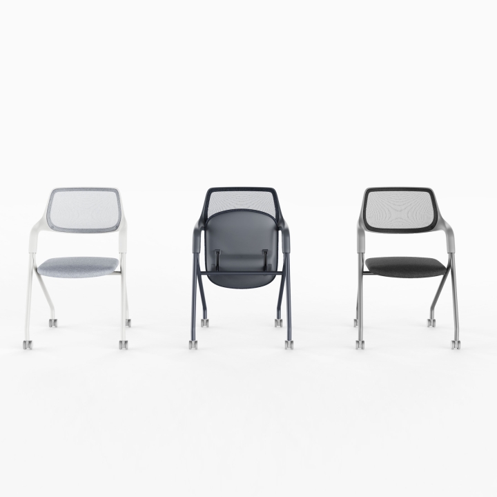 Vela is a Training Chair that responds effectively to user needs in modern training environments; as it guarantees great comfort thanks to the breathable backrest fitted with mesh, which also becomes a handle at the rear of the plastic frame of the backrest. At the same time it favors the functional arrangement in the spaces thanks to its shape, designed to allow maximum storage in rows by lifting the seat.