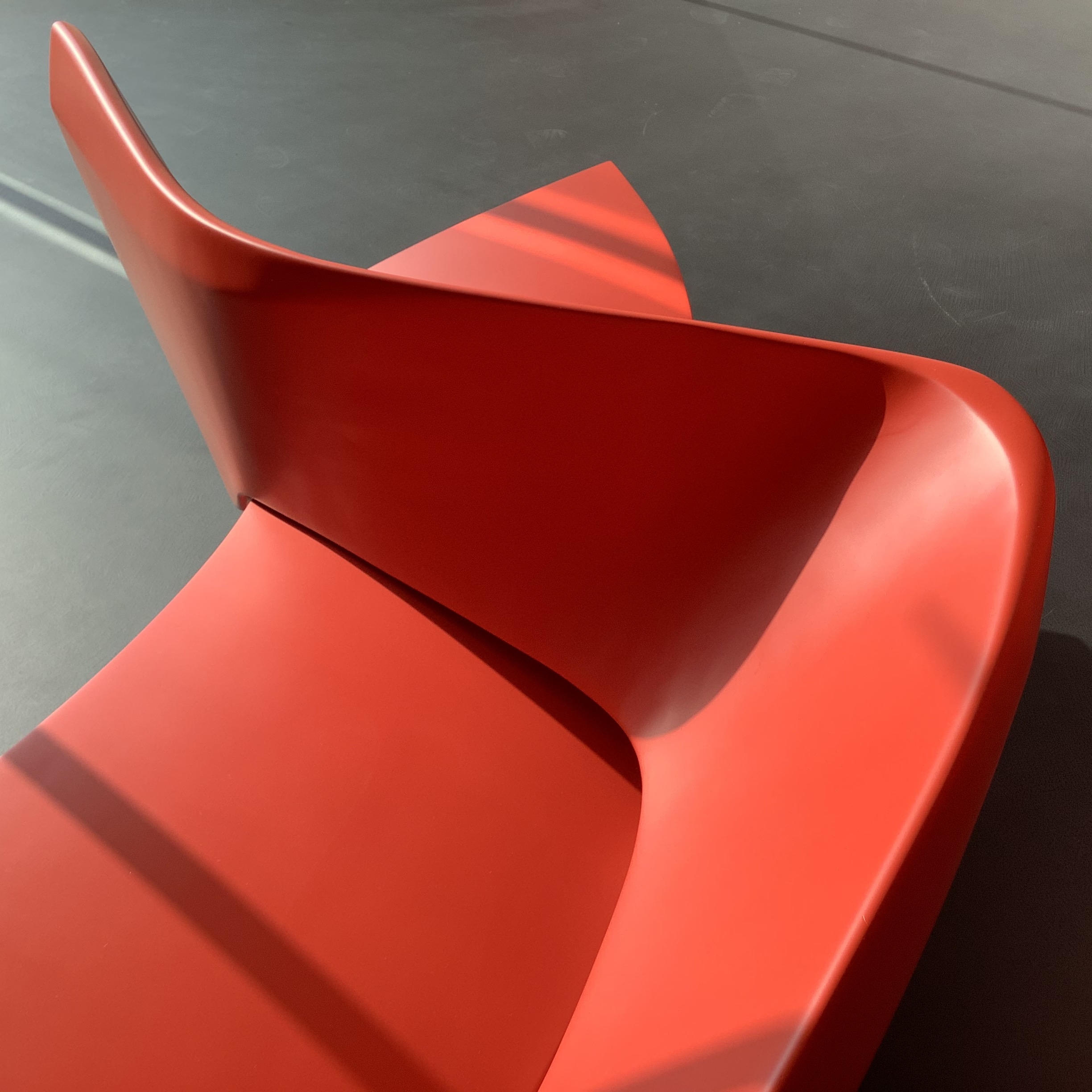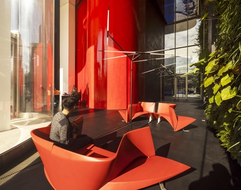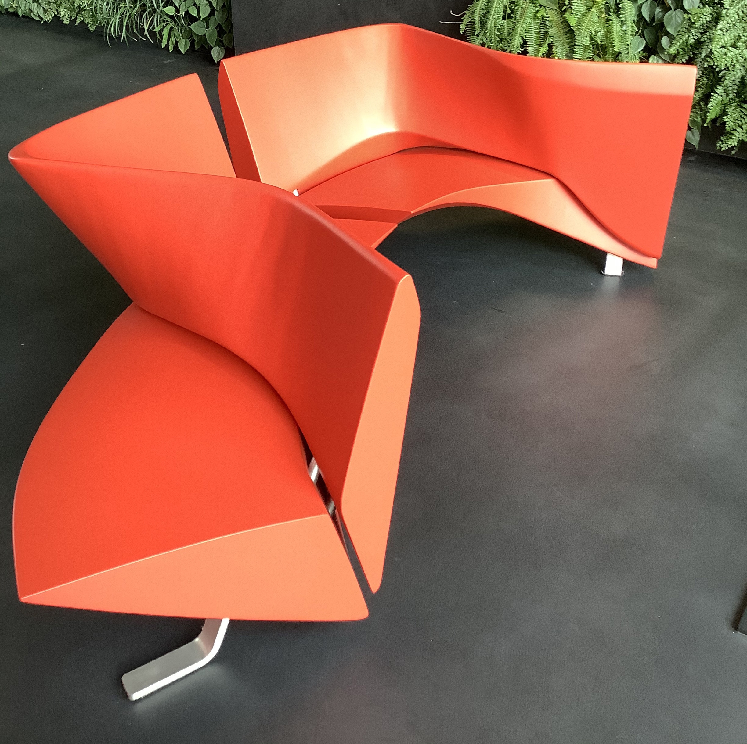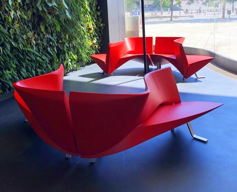 This red lacquered wood confident could organized a larger conversation by being connected by 2, 3 or 4. That, not only creates a conversation group but also dynamic sinuous waves in spaces as lobbies.