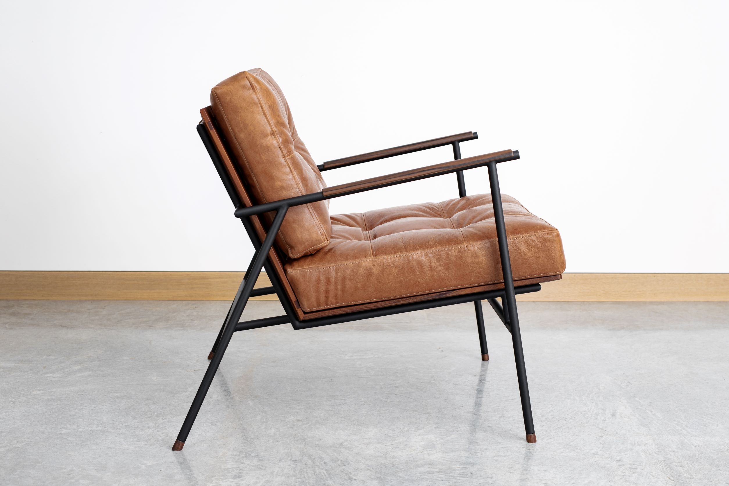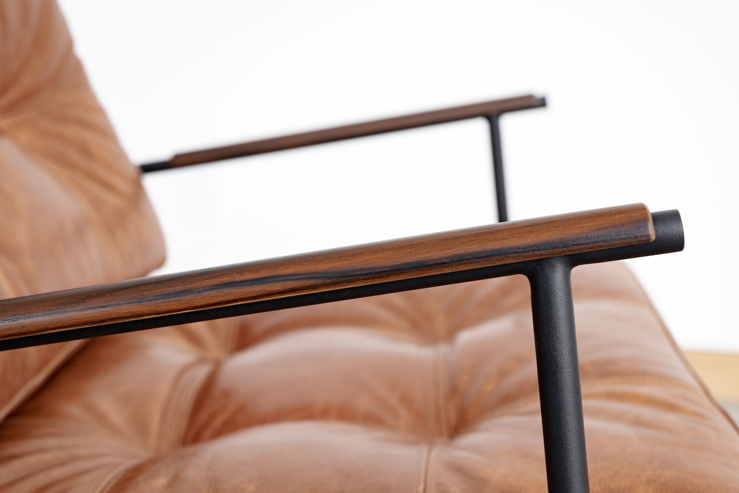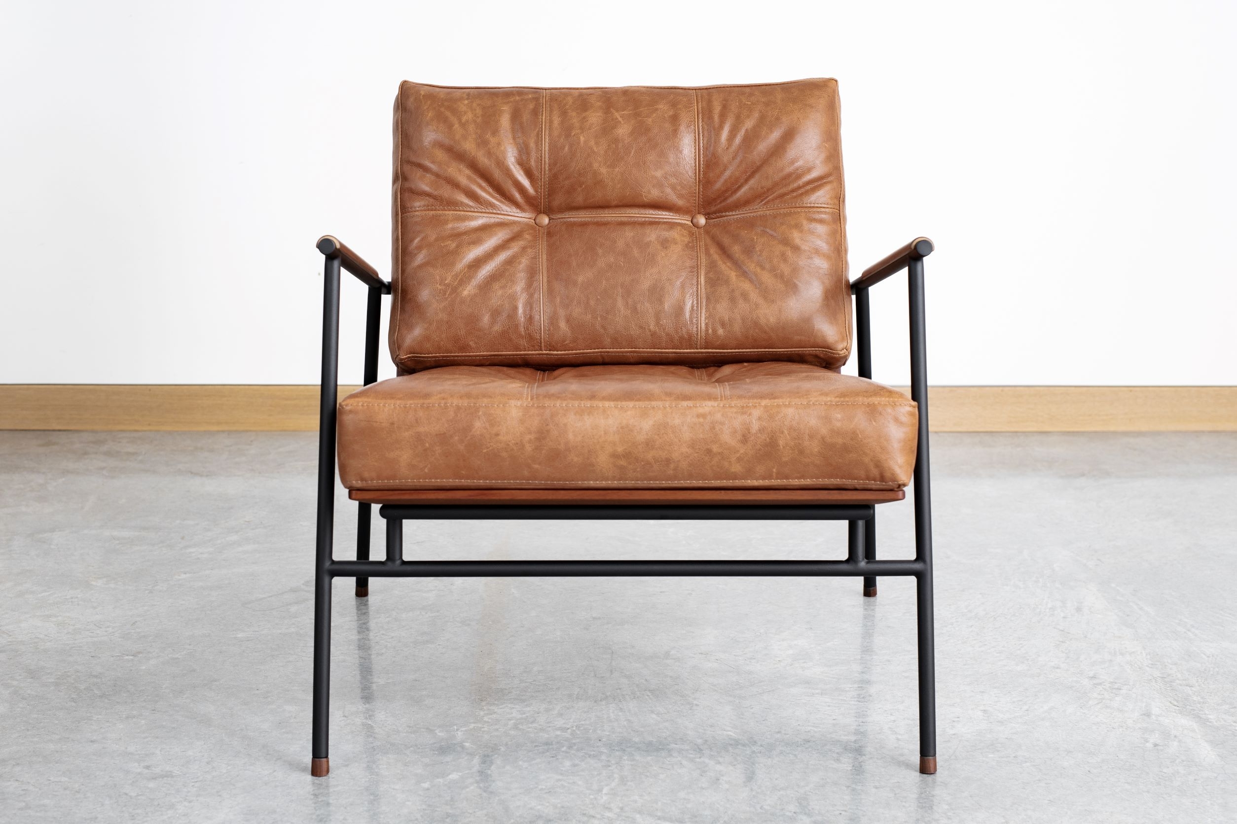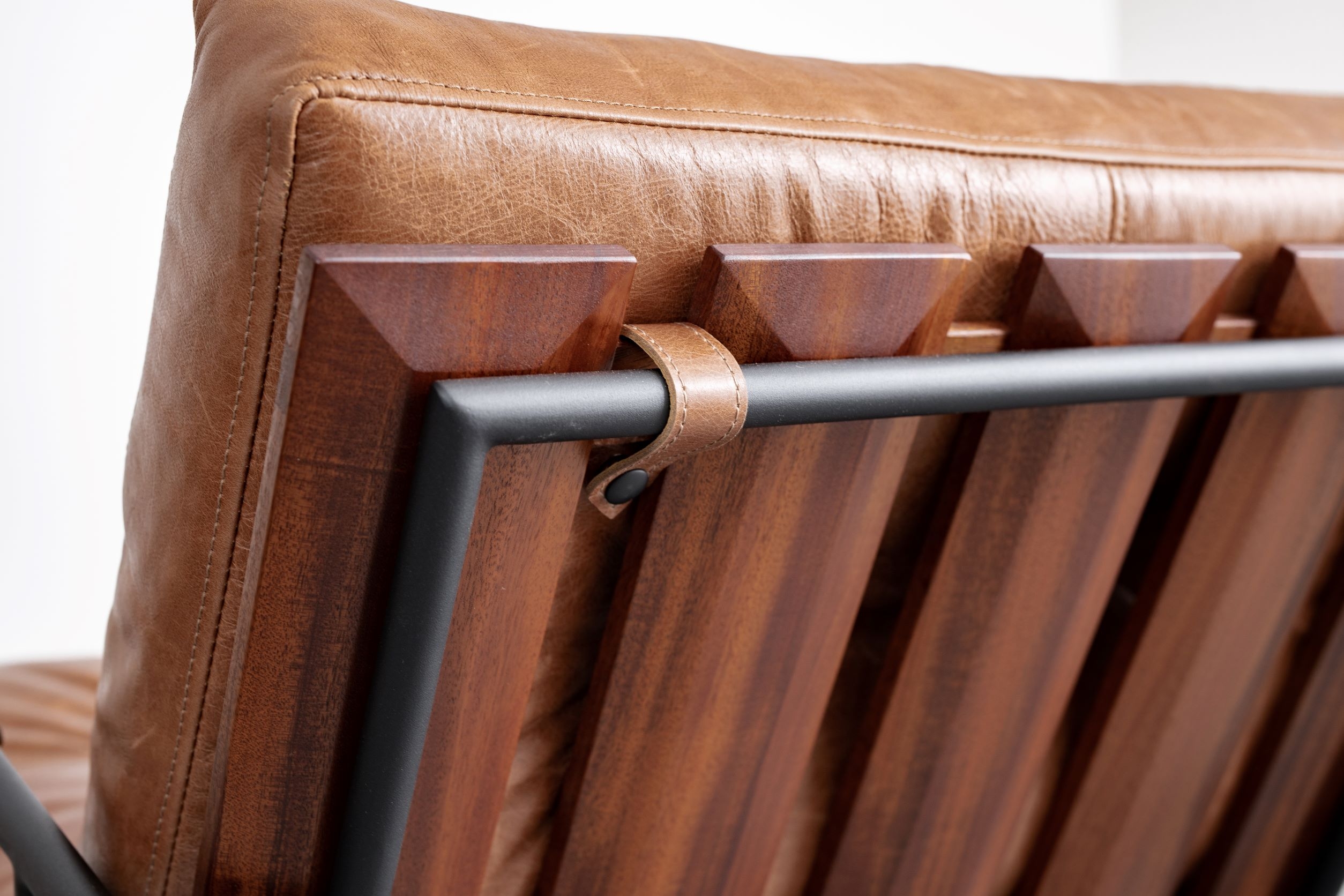 Subtle leather straps connect the cushion to the backrest and frame, showcasing the detailed workmanship from all angles. Lush upholstery with visible seams and tufting on the patinated leather are the finishing touches of the Smoke Chair for an elegant and refined style.