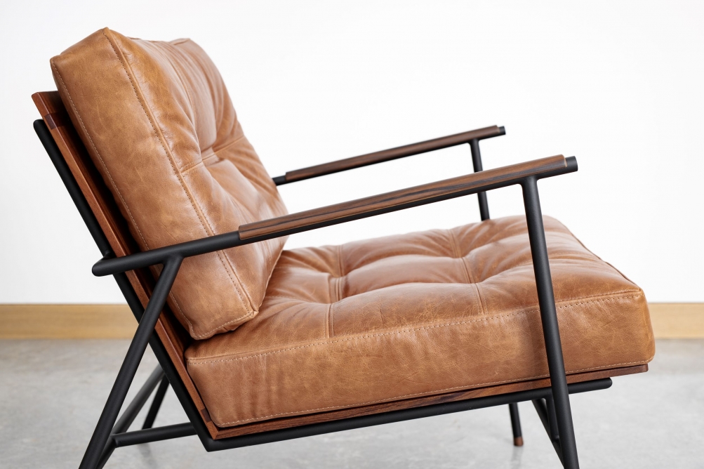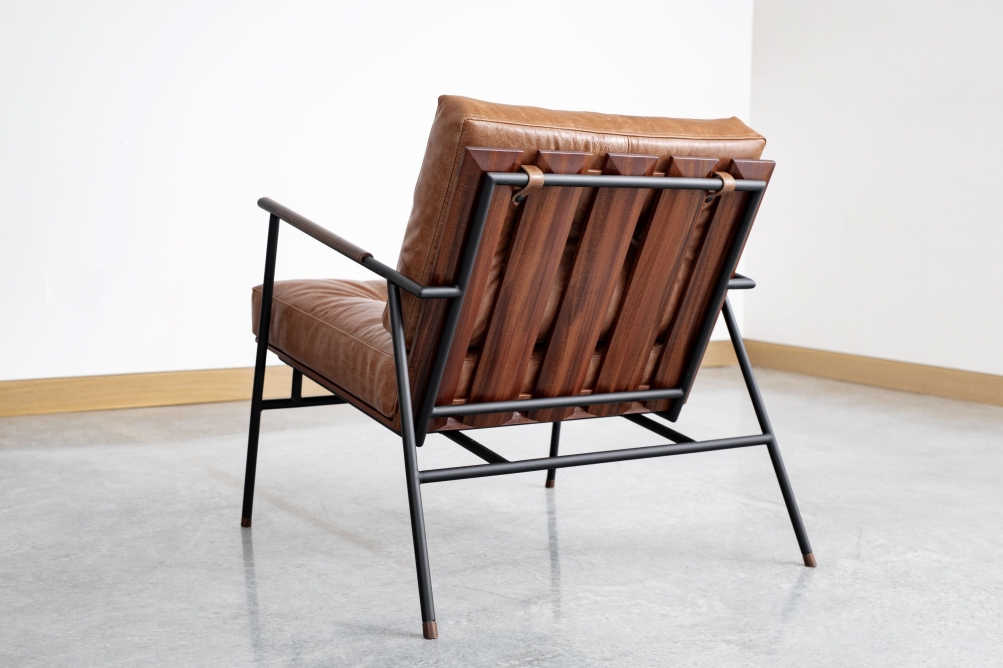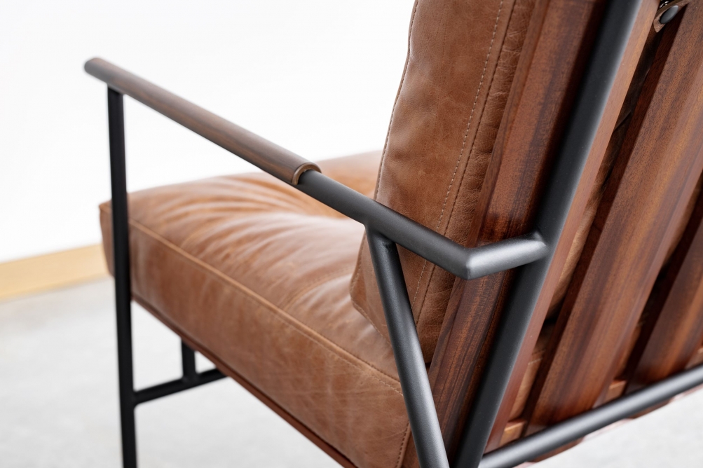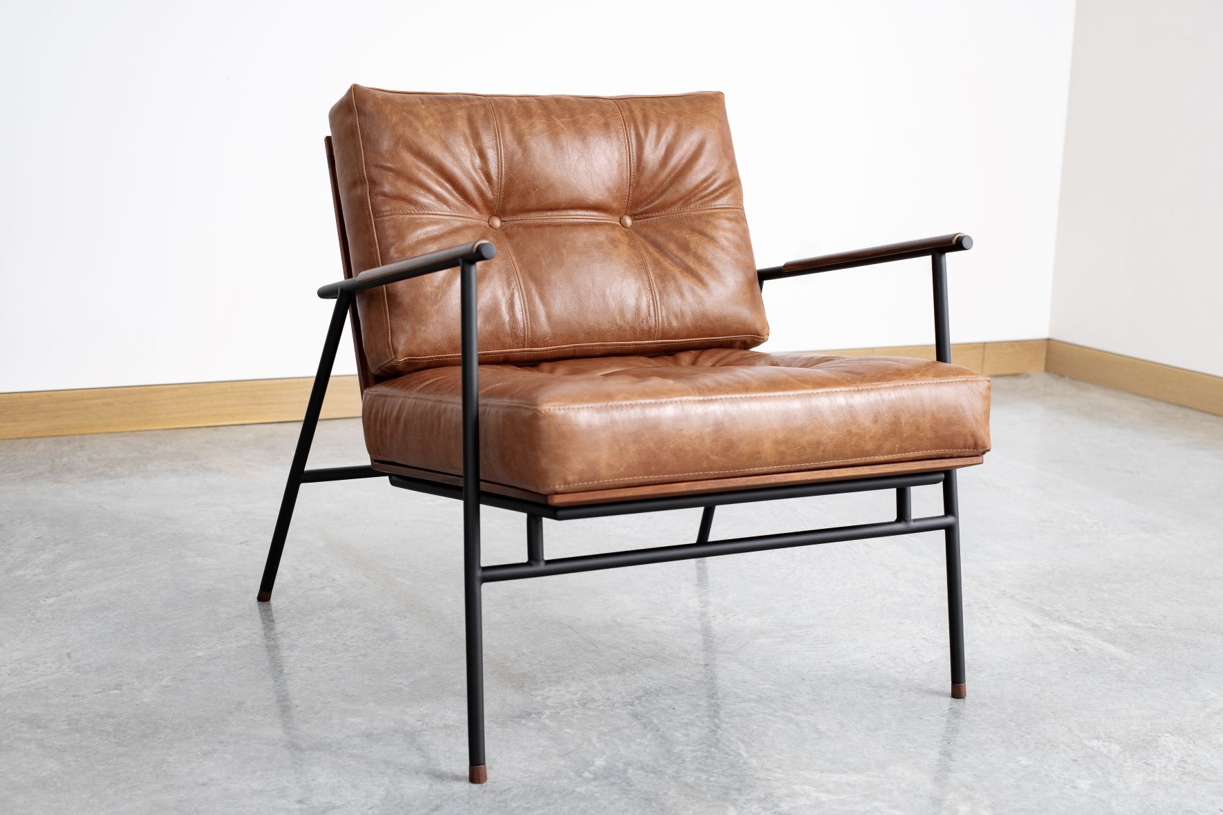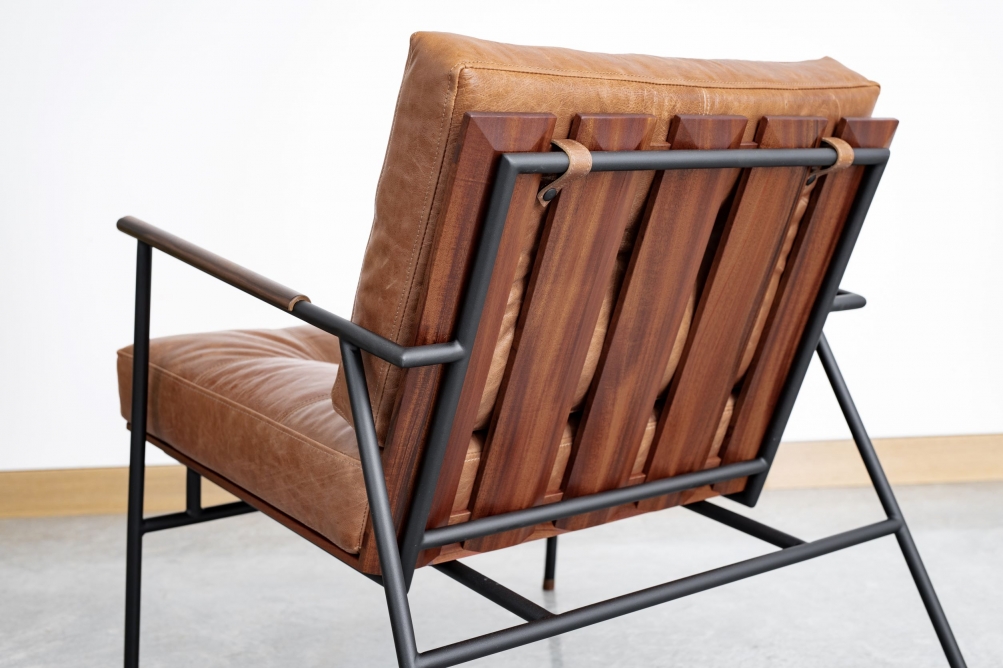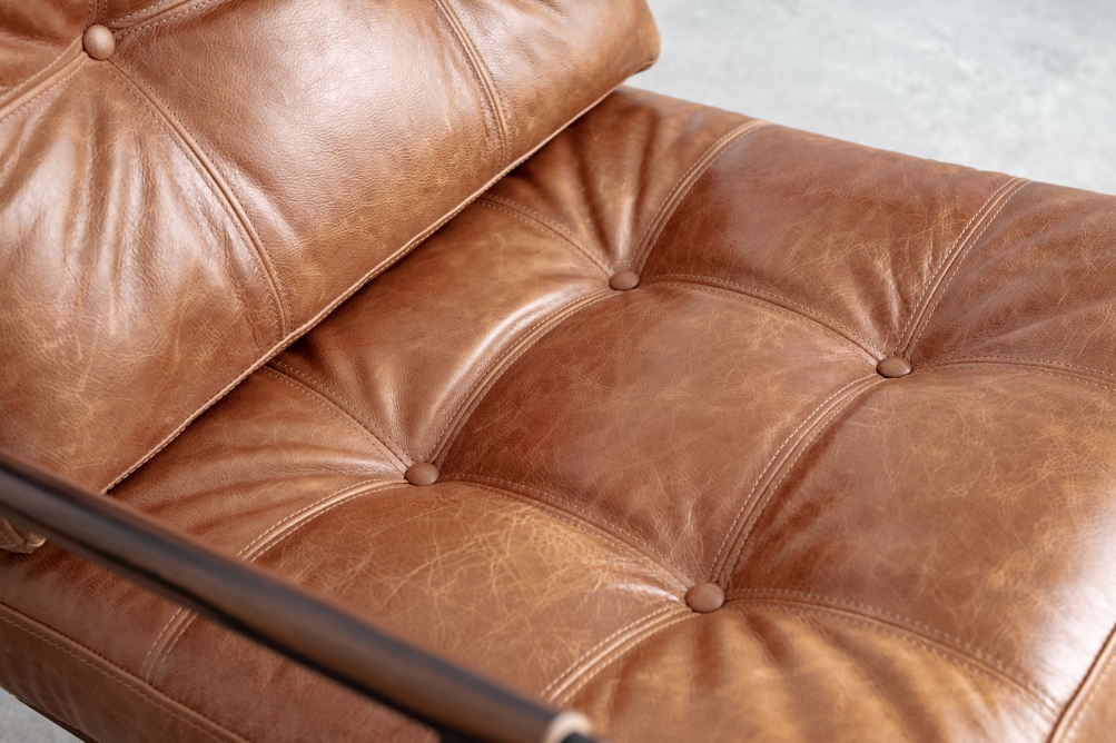 Subtle leather straps connect the cushion to the backrest and frame, showcasing the detailed workmanship from all angles. Lush upholstery with visible seams and tufting on the patinated leather are the finishing touches of the Smoke Chair for an elegant and refined style.