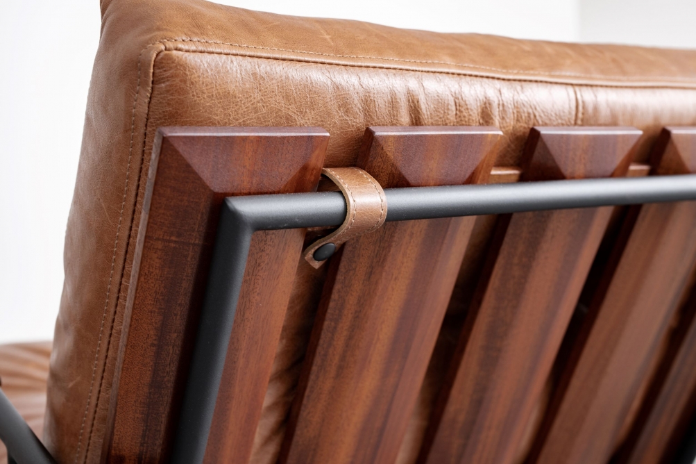 The cool rigidity of the metal complements the radiant warmth of the Honduran mahogany. Parallel wood panels on the backrest highlight the natural grain of the wood, contrasting rich light and dark hues and its moderate natural luster.