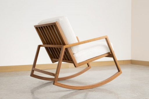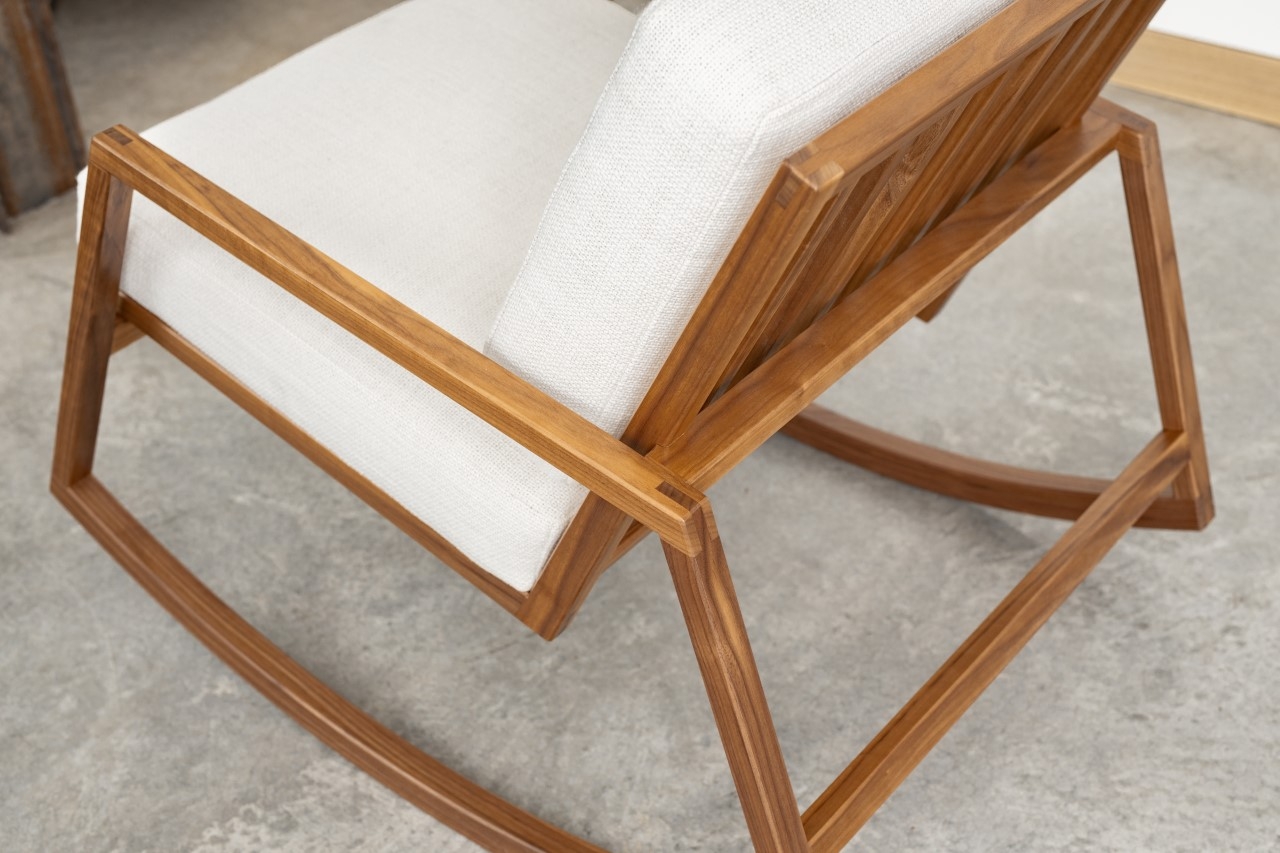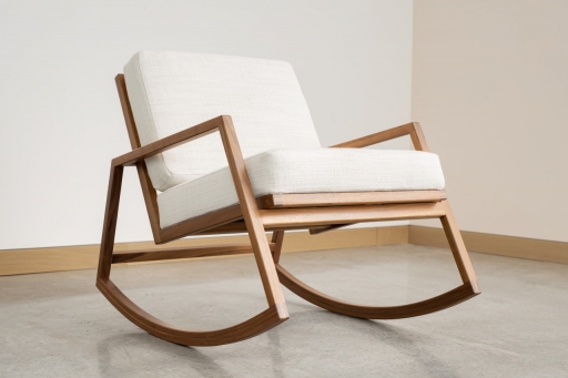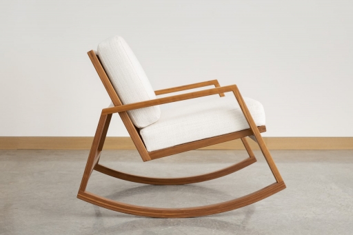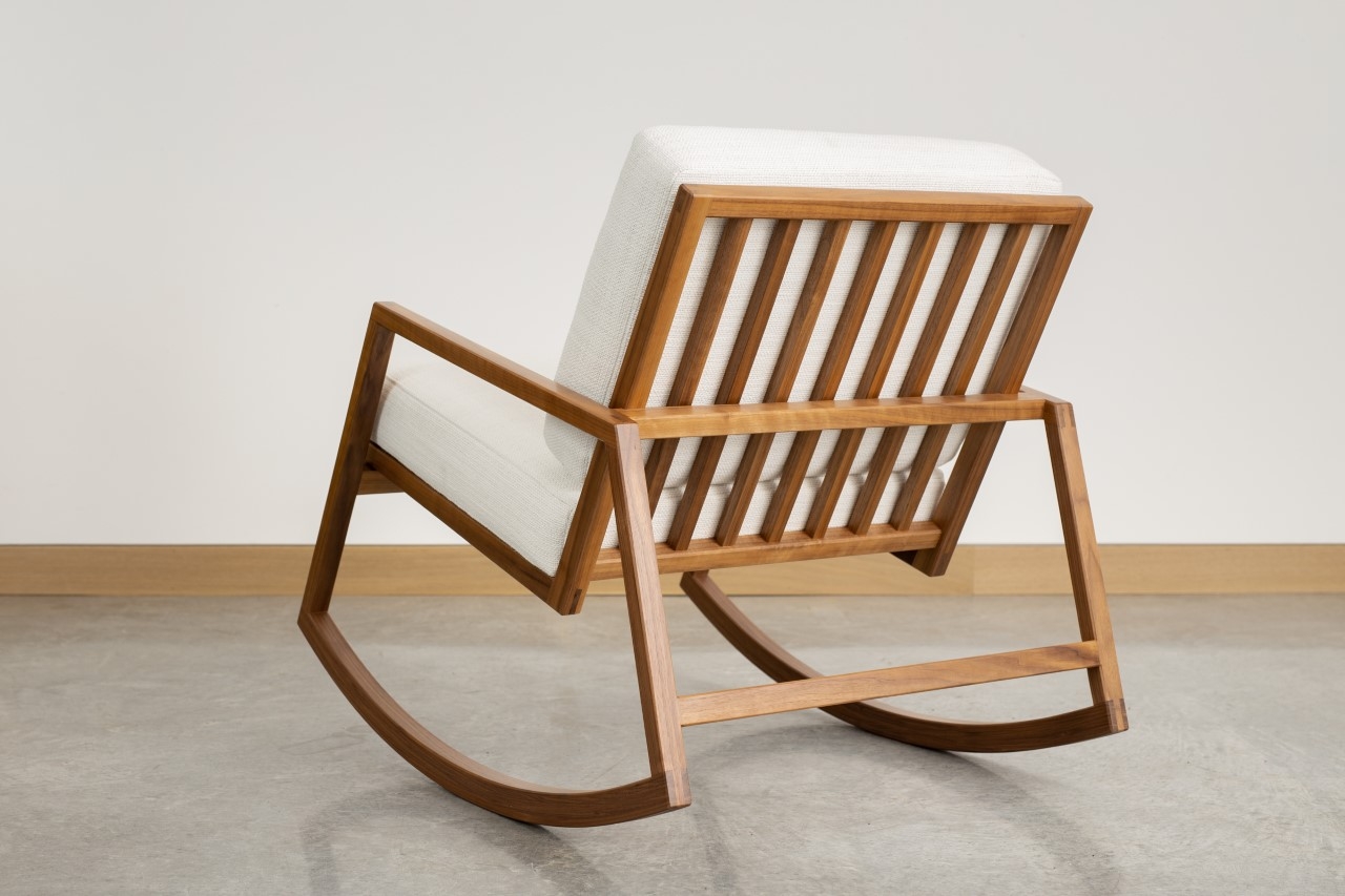 The clean lines and uncluttered form of the Lydia chair showcase the fine details and precision of its workmanship. Hand-cut exposed joinery highlights the contrasting colours and linear grain of the wood. Chosen for its nobility, rich and smooth colour and stability, the solid walnut structural is finished with a soothing natural oil sealer. The Lydia chair is at the same time delicate and solid, fluid, and precise. The warm subtle hue of the soft Italian fabric is complimented by a full-bodied texture that beckons to be touched. Since the times of its origin, the rocking chair has been a vehicle for reflection. With the upmost attention placed on a perfectly balanced rocker, the Lydia creates smooth and rhythmic flow enticing a state of relaxation, and comfort for which it was intended.