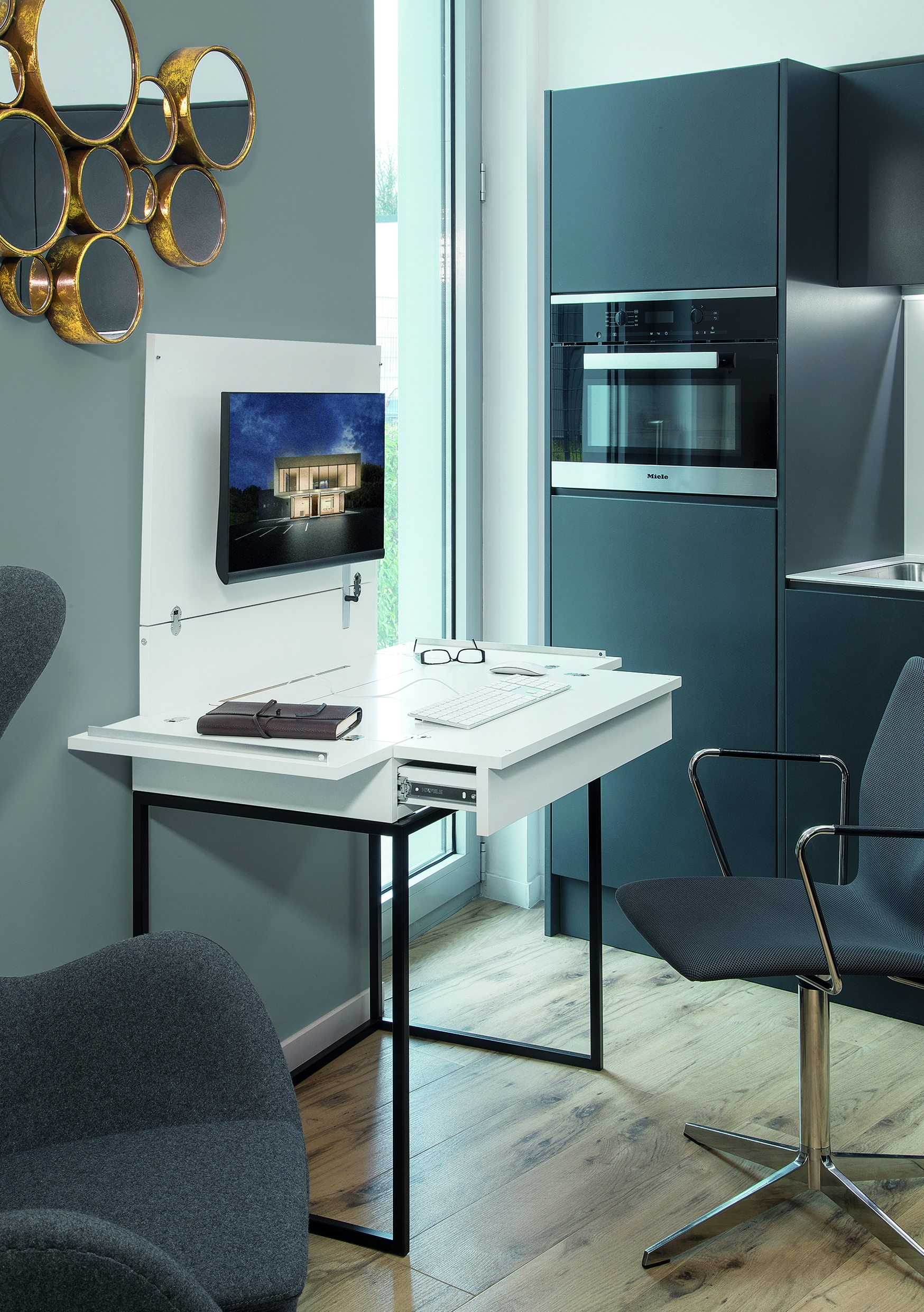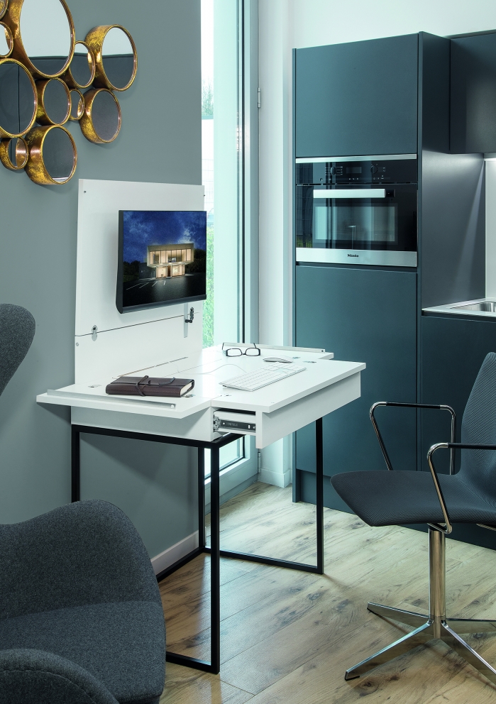 ALL IN ONE is a newly designed office furniture which is customized for daily use in your home office. As working from a private space can pose a challenge we need a functional working area however how much space our house, apartment or room can spare. The ONE offers a perfect solution: By folding open the side parts of this adaptable and versatile furniture it reveals its convenient working surface. The lid converts into the back side with a built-in monitor. After the work is done you can simply fold the ONE together: the workstation turns into a pleasant piece of furniture and allows you to fully enjoy your home as it should be: a living area. No sight of work until you fold up your ONE again and start the next day of work. ONE – the trend line for home office furniture.Made in Germany, Designed by Nico Ueberholz.
