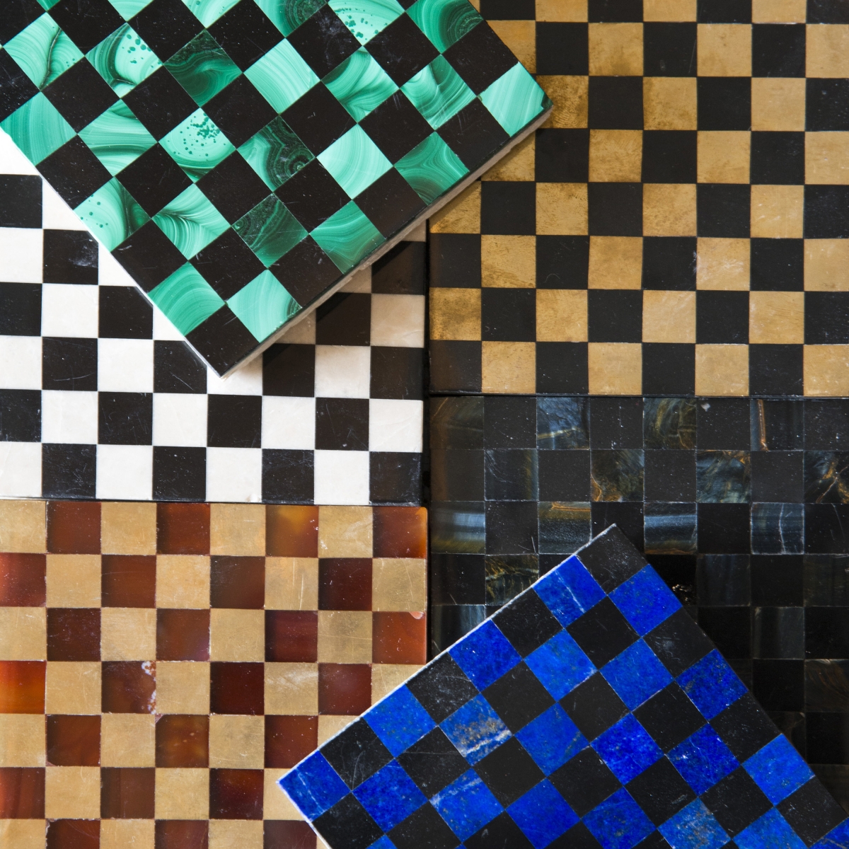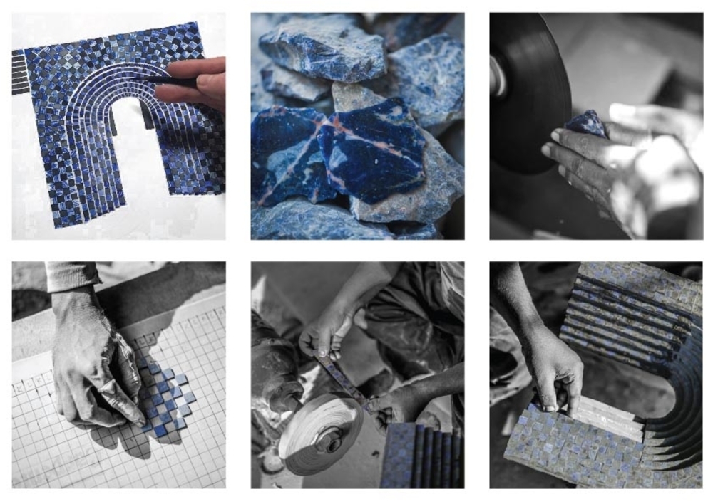 Use of contrasting stones lays emphasis on the opposites, the twoness that is the world. The semiprecious stones against the black marble bring in colour and texture, emphasising the contrast. The stones, intricately cut are inlaid with precision to form the geometric pattern. Each of the 22,600 stone pieces in the ’Sanctum’ coffee table is individually cut on an electric router, and it takes approximately 3840 manhours to complete the stone inlay work. The inlay craft, locally known as ‘Pacchikari’ was introduced by the Mughal emperor Shah Jahan in India, who brought skilled artisans from Persia to train the local craftsmen.