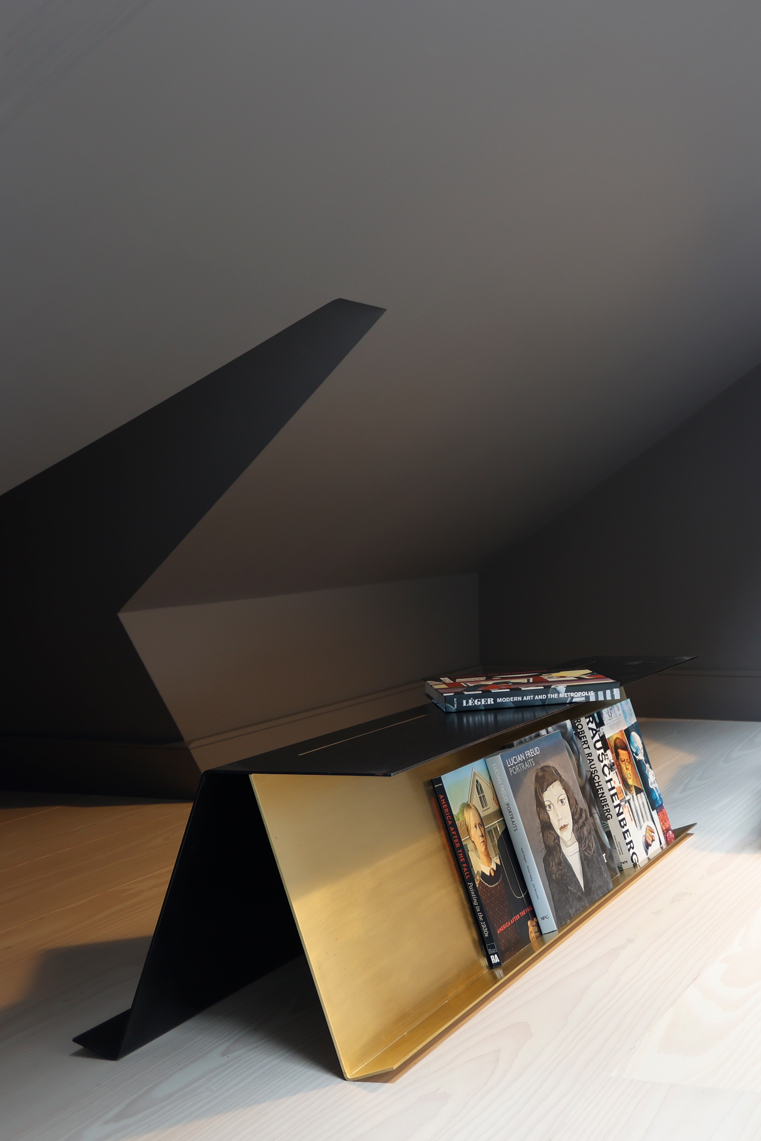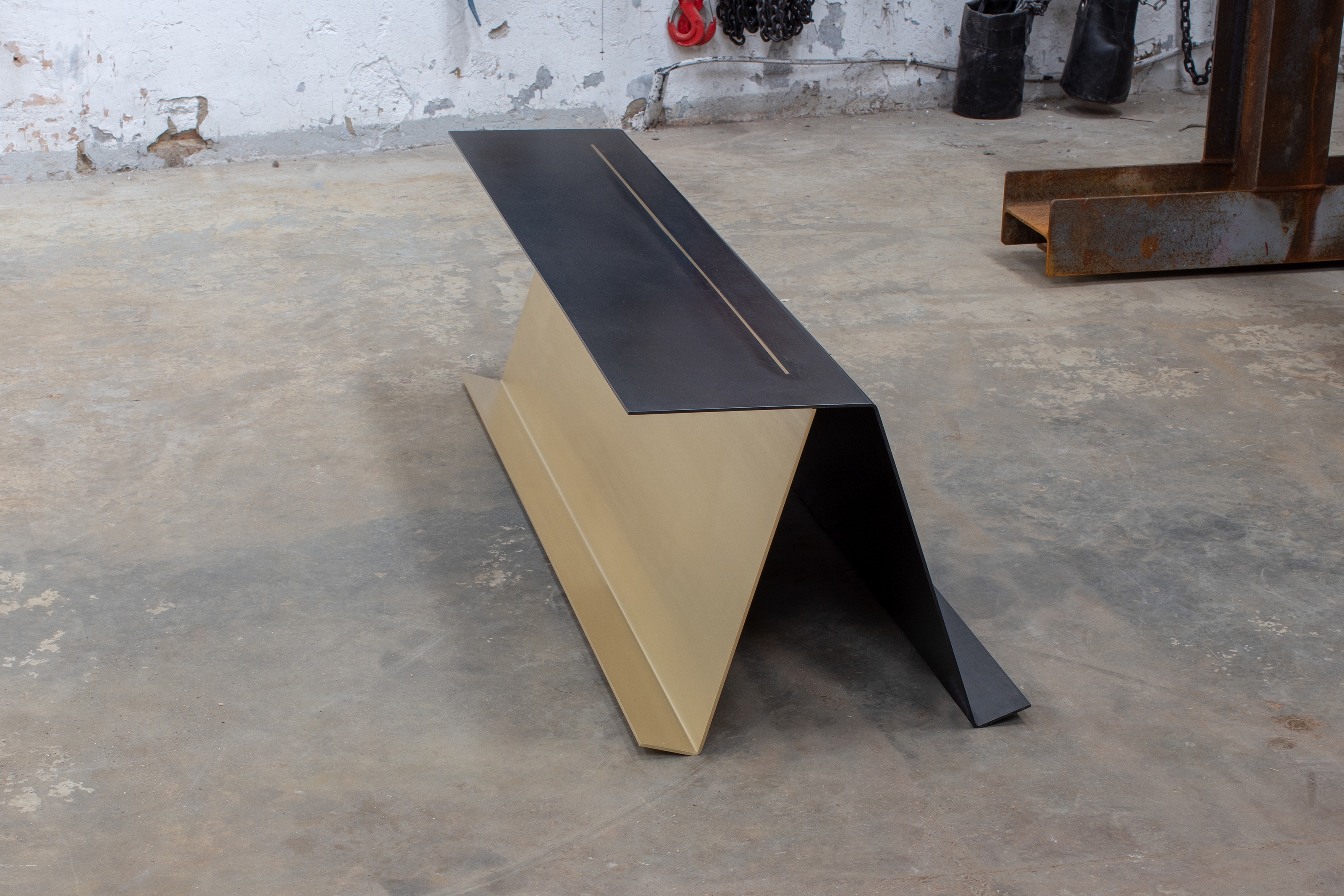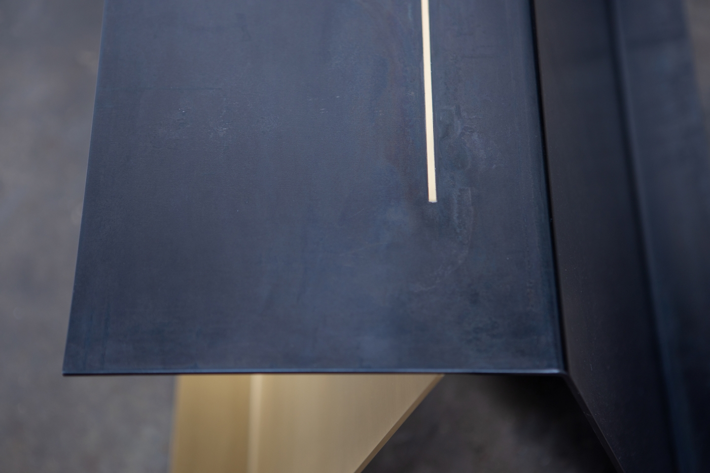 Books are vessels that hold our thoughts and ideas and this table aims to prop those up. Although refined, a book is, as any book-binder will attest, very clever in its simple construction. It has two elements: sewn pages and a cover. I wanted my reading book table to have the same simplicity - just two elements that show how it is constructed - the black steel as the cover and the brass as the sewn pages - the brass tab cutting into the black steel as if the text leans into and bites the book’s structural cover.