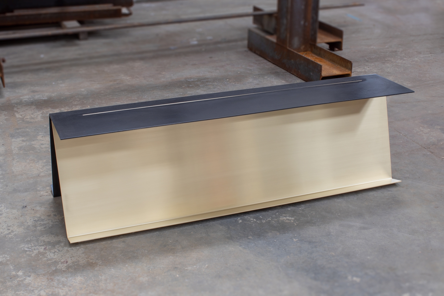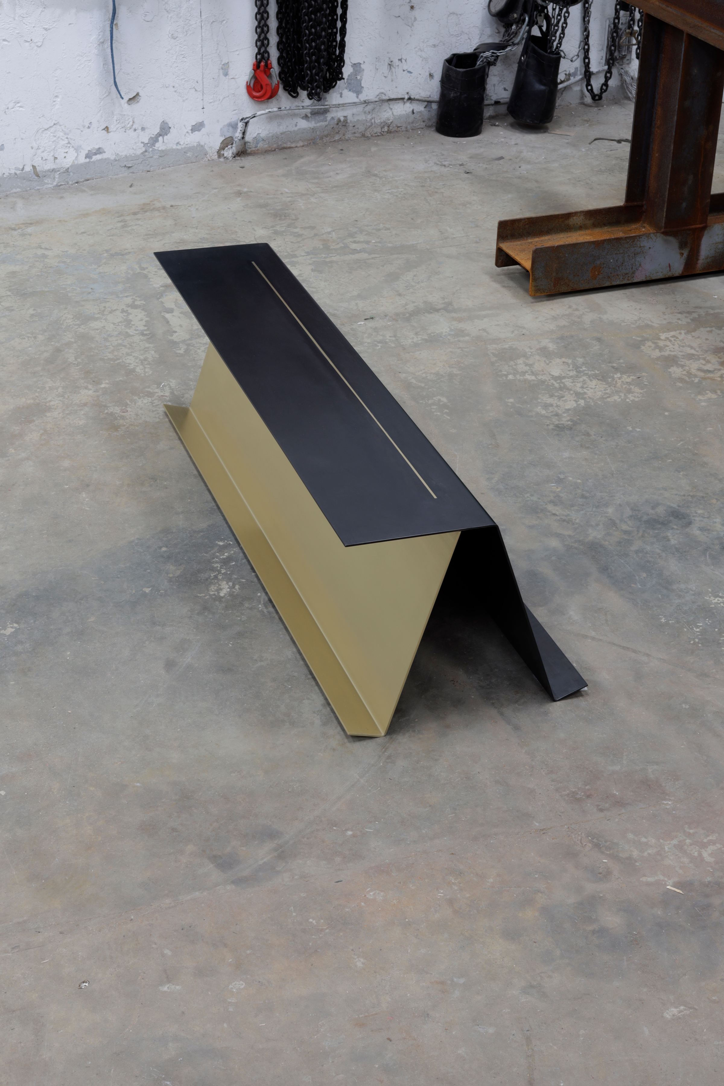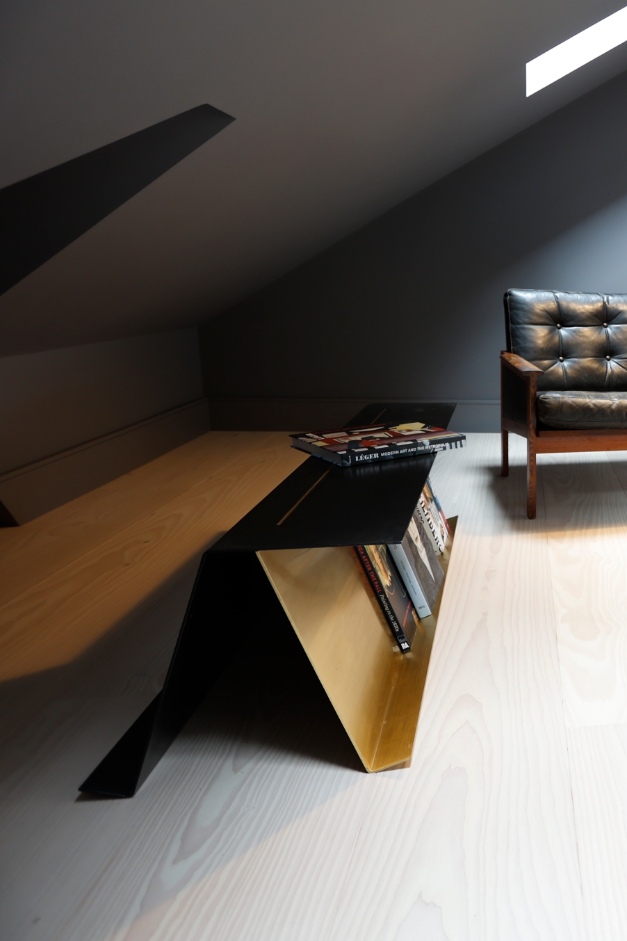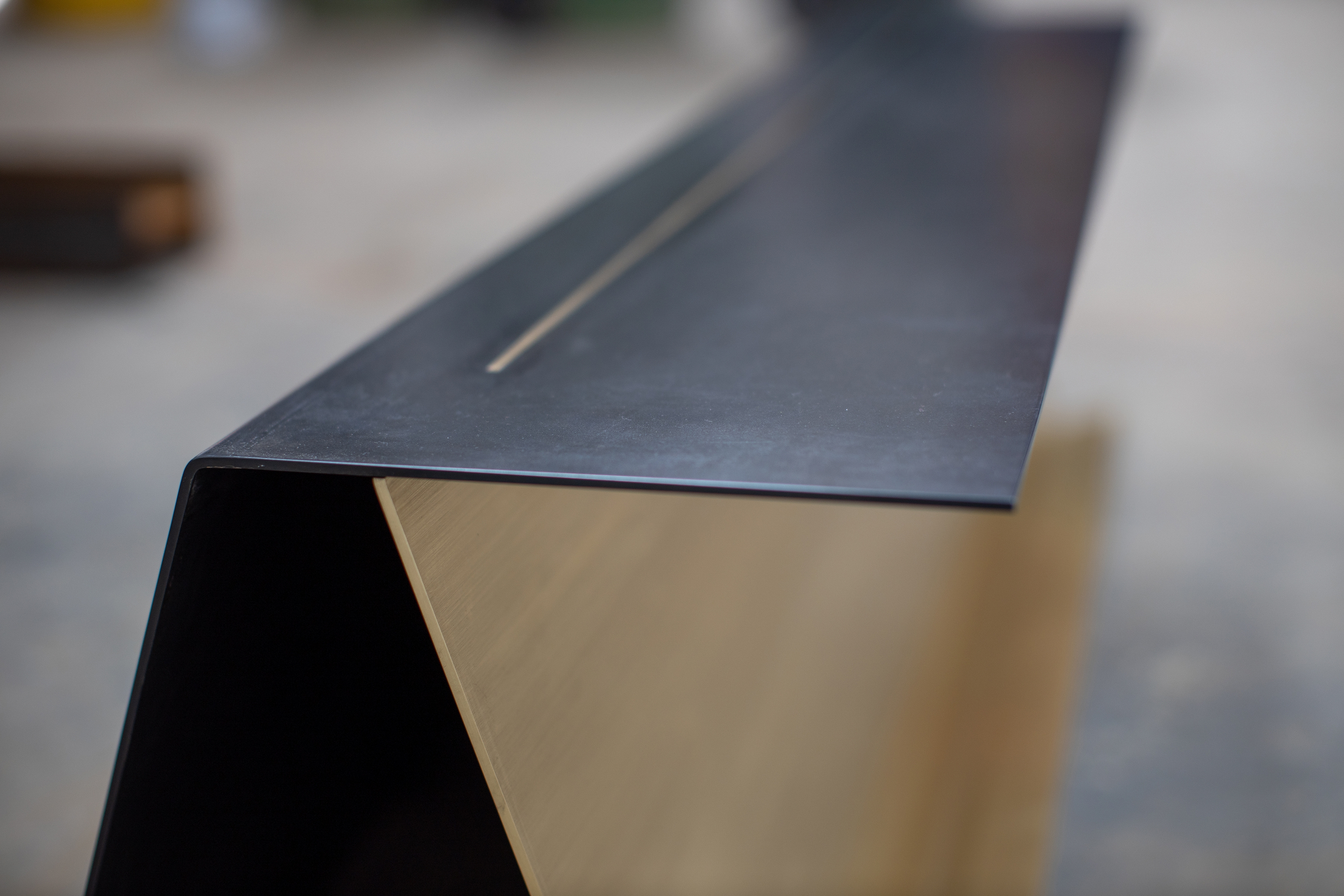 Books are vessels that hold our thoughts and ideas and this table aims to prop those up. Although refined, a book is, as any book-binder will attest, very clever in its simple construction. It has two elements: sewn pages and a cover. I wanted my reading book table to have the same simplicity - just two elements that show how it is constructed - the black steel as the cover and the brass as the sewn pages - the brass tab cutting into the black steel as if the text leans into and bites the book’s structural cover.