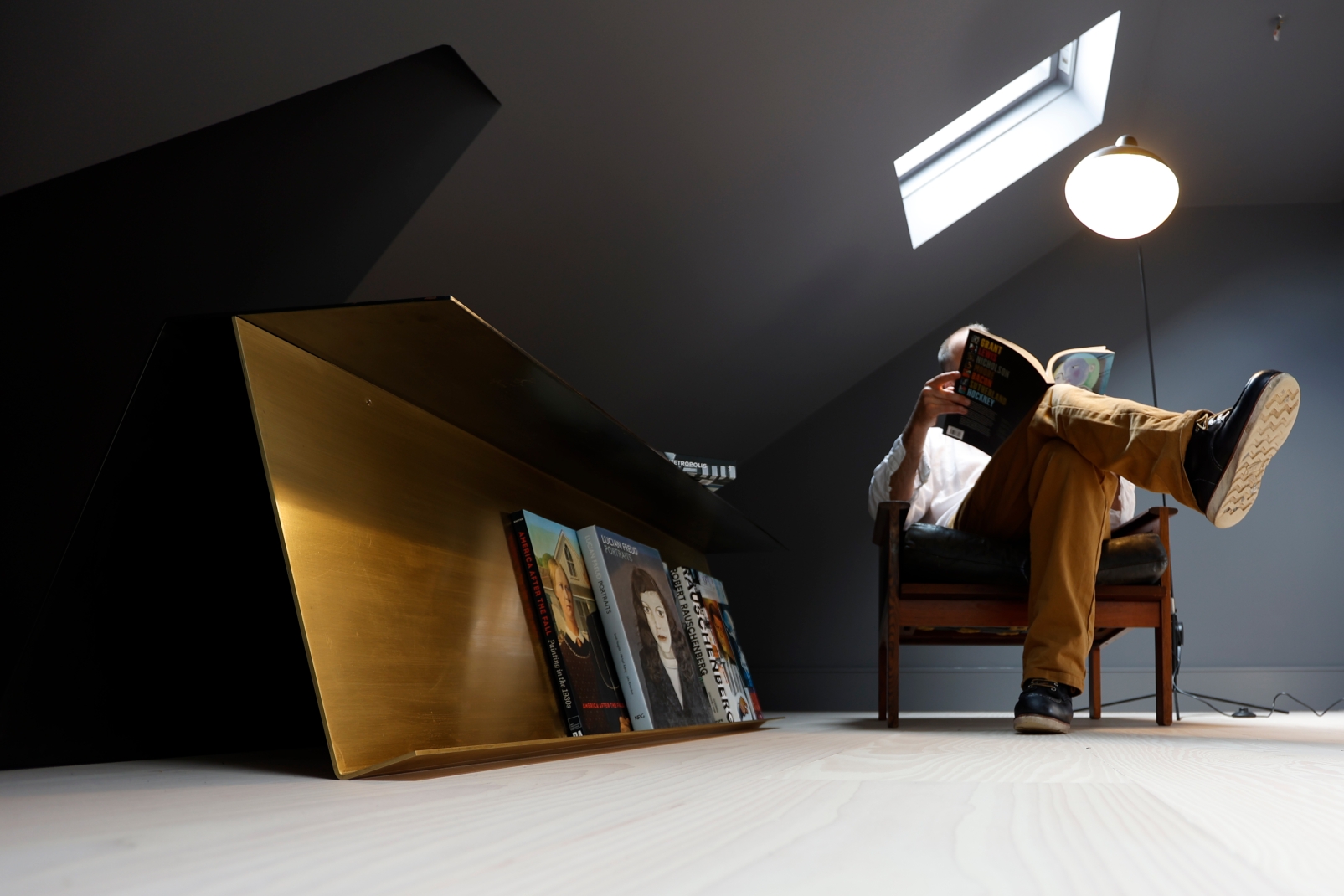 Originally designed to sit between a reading chair and a raked loft ceiling, its sloped sides followed suit and so required little upturned feet to hold the books in place. Whilst reminding me of the shape of my own outstretched legs and angled feet whilst reading, the form alludes strongly to a lectern - an object with obvious associations of literary importance.
