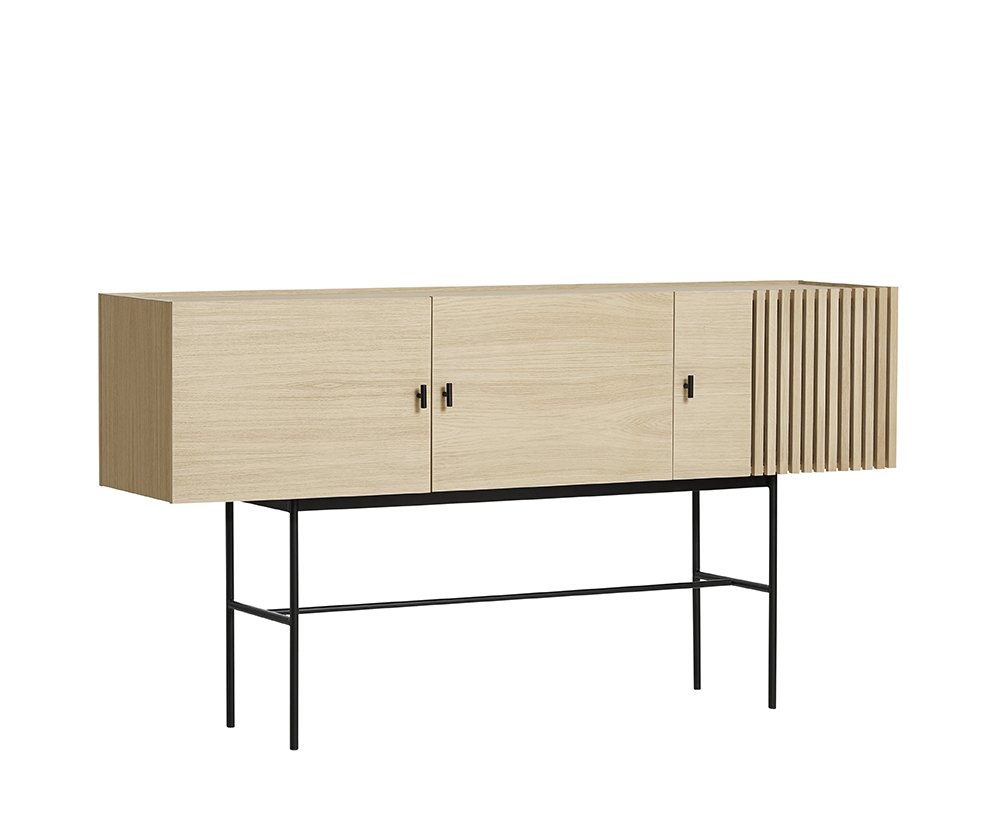The sleek legs lift the sideboards from the ground creating an elegant contrast between the solid wooden cabinet on top and the thin metal construction underneath. Functional storage space inside and soft closing doors makes the cabinet both functional and beautiful.