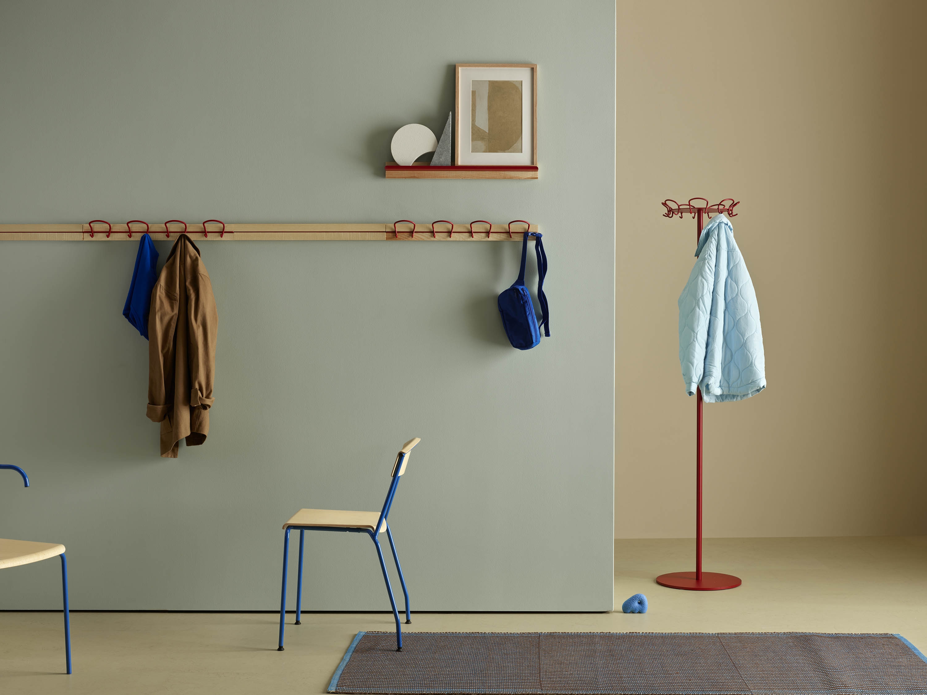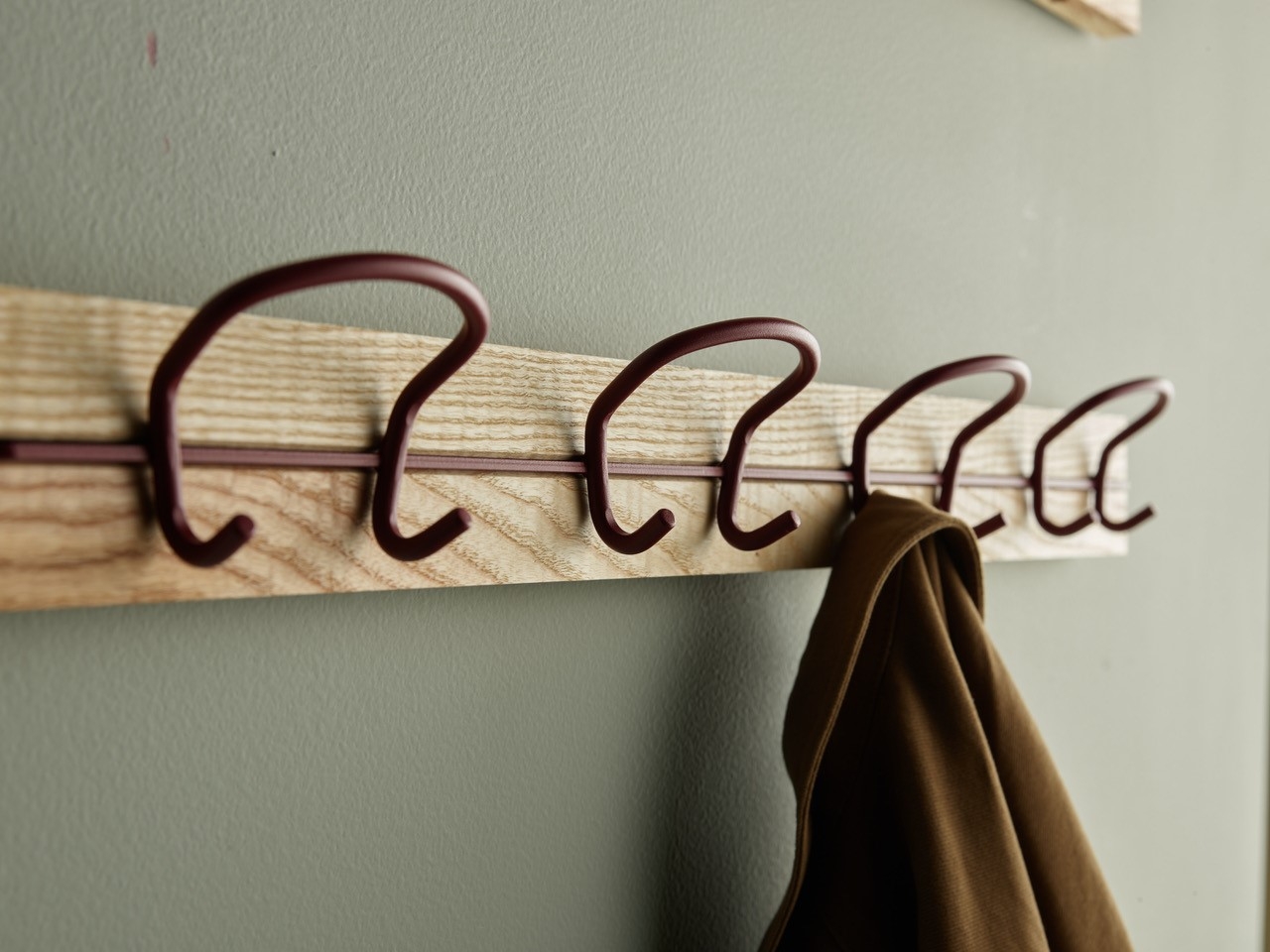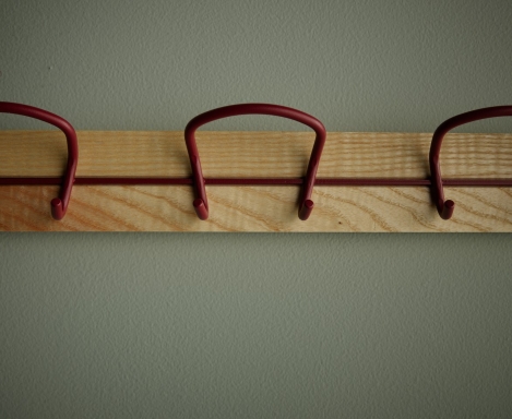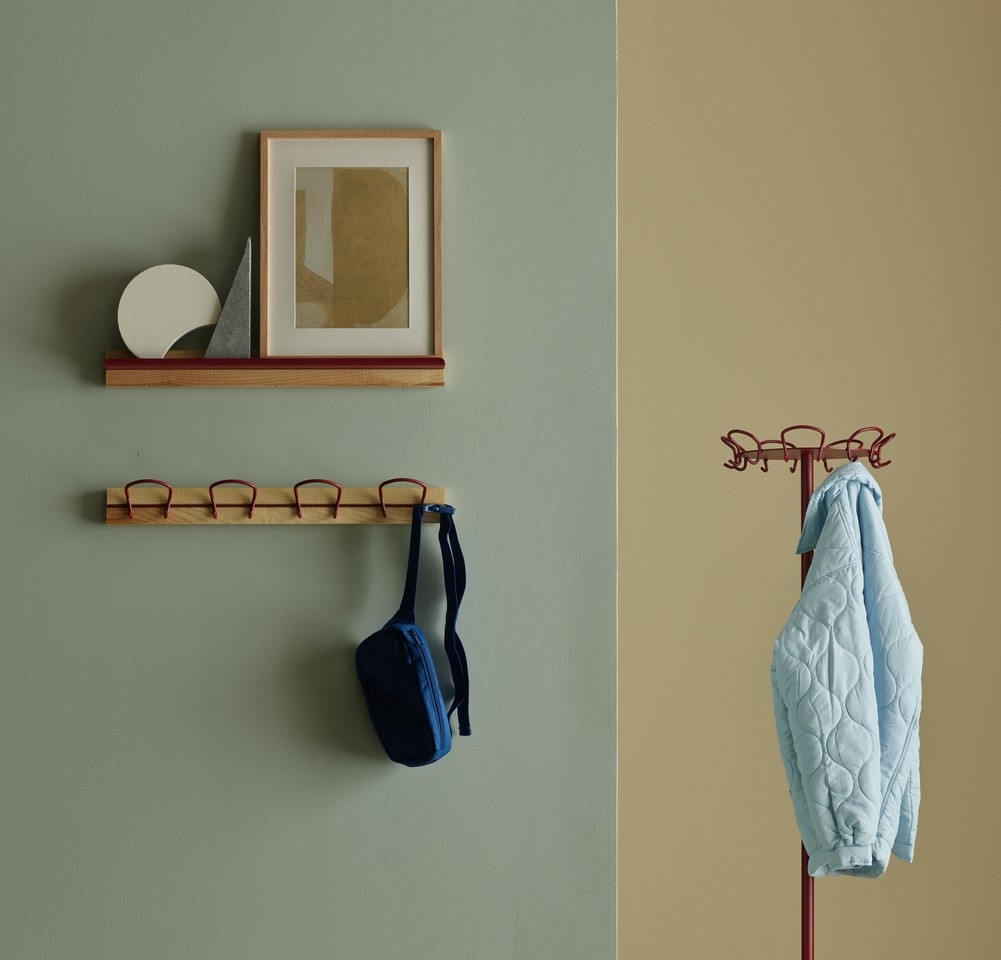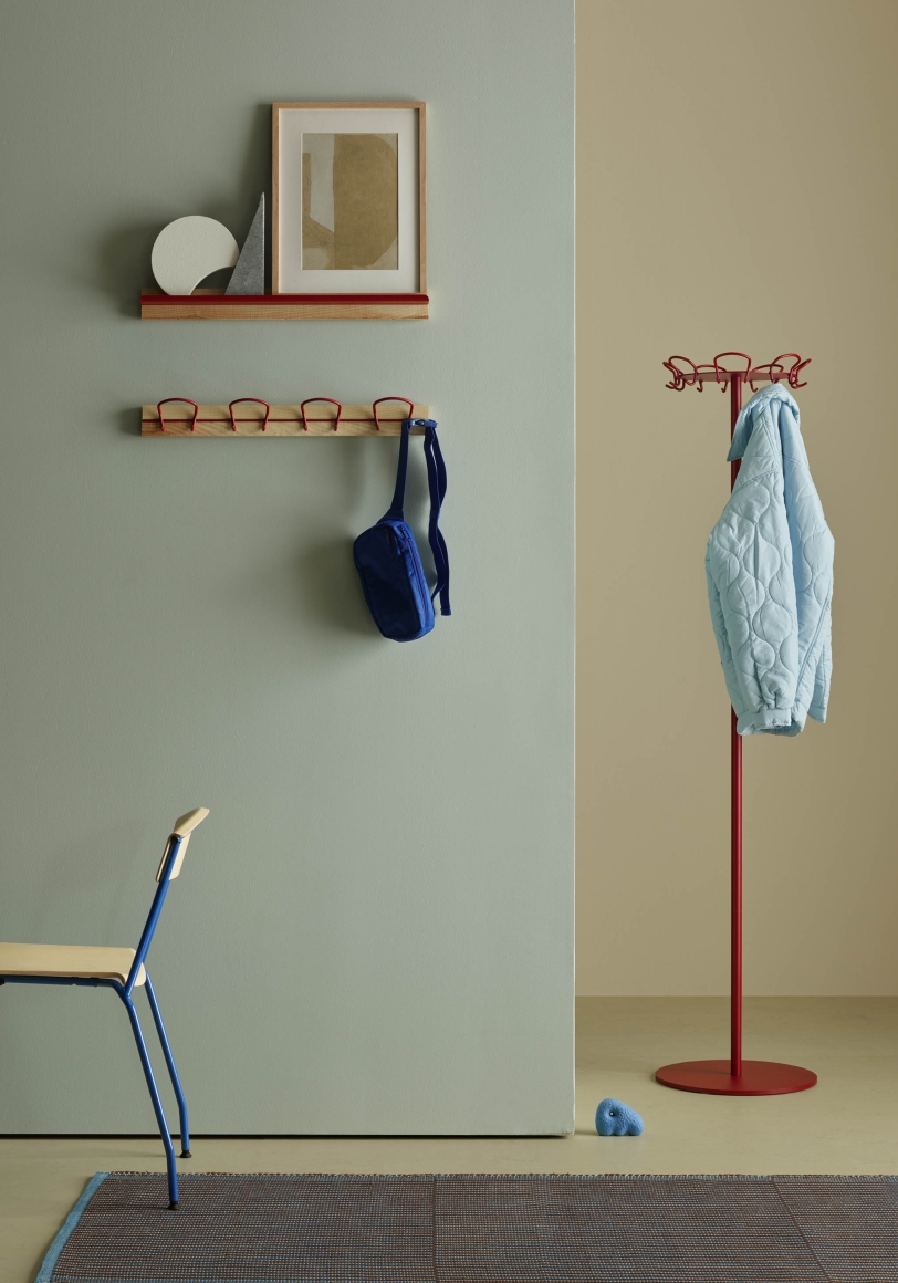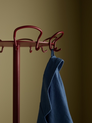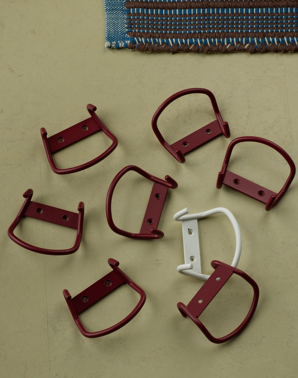 Wire is a series of hooks represented as a coatstand, hookrail and as a single wallmounted hook. The double ended hook is made of a continuos bent wire, equally practical and decorative.