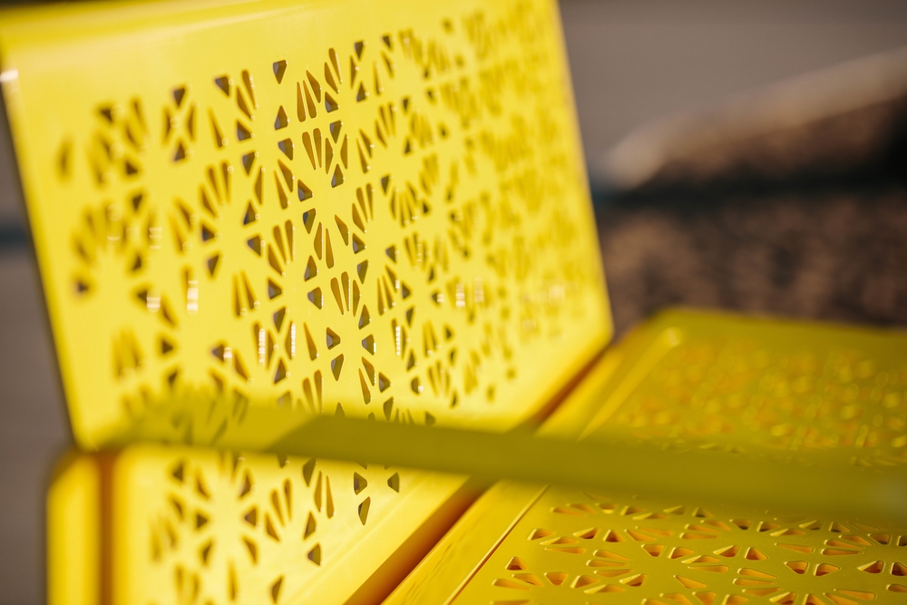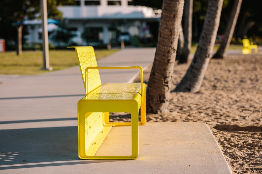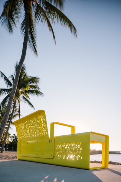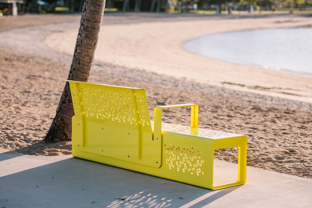 Given the environmental conditions in Northern Queensland and the proximity of the site to the ocean, the general principle was to select aluminium as the main material palette which was robust enough to weather these severe conditions. The use of a heavily perforated pattern was applied to minimise the surface area exposed to the sun while also allowing maximum airflow. The pattern took inspiration from the unique coral forms found in the area. The other key consideration was for the design to allow for the surface material set within the furniture frames to be substituted for either aluminium, timber or plastics. This offered the opportunity for