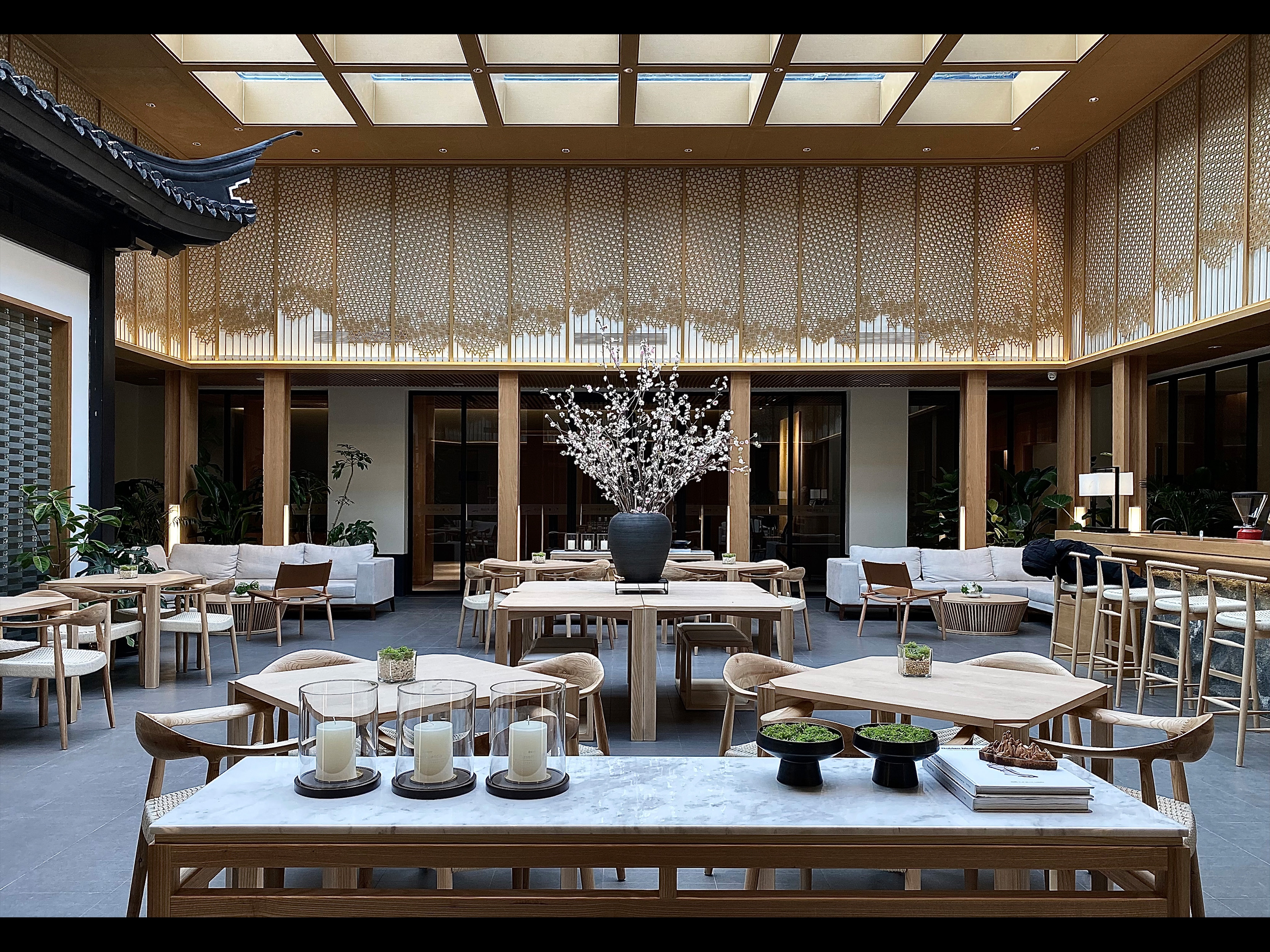 Cold and long winter, spring dry sand in Zhangjiakou. Designers closed the courtyard, winter warm, spring moisture, glass roof introduced natural lighting to reduce energy consumption, while reducing the impact of sand on the hotel operation.