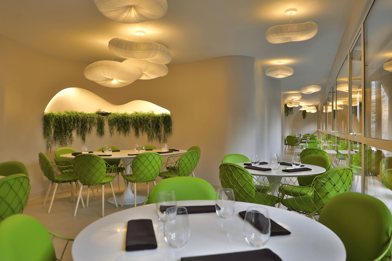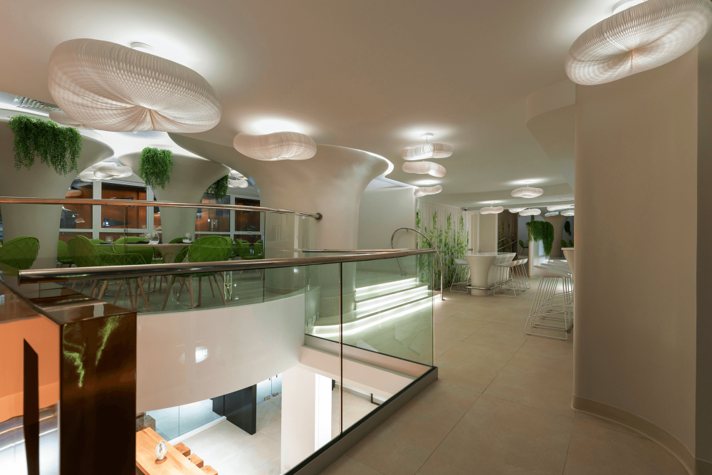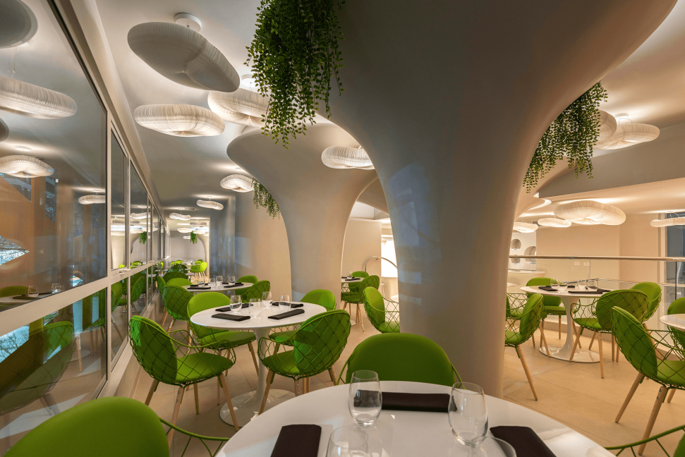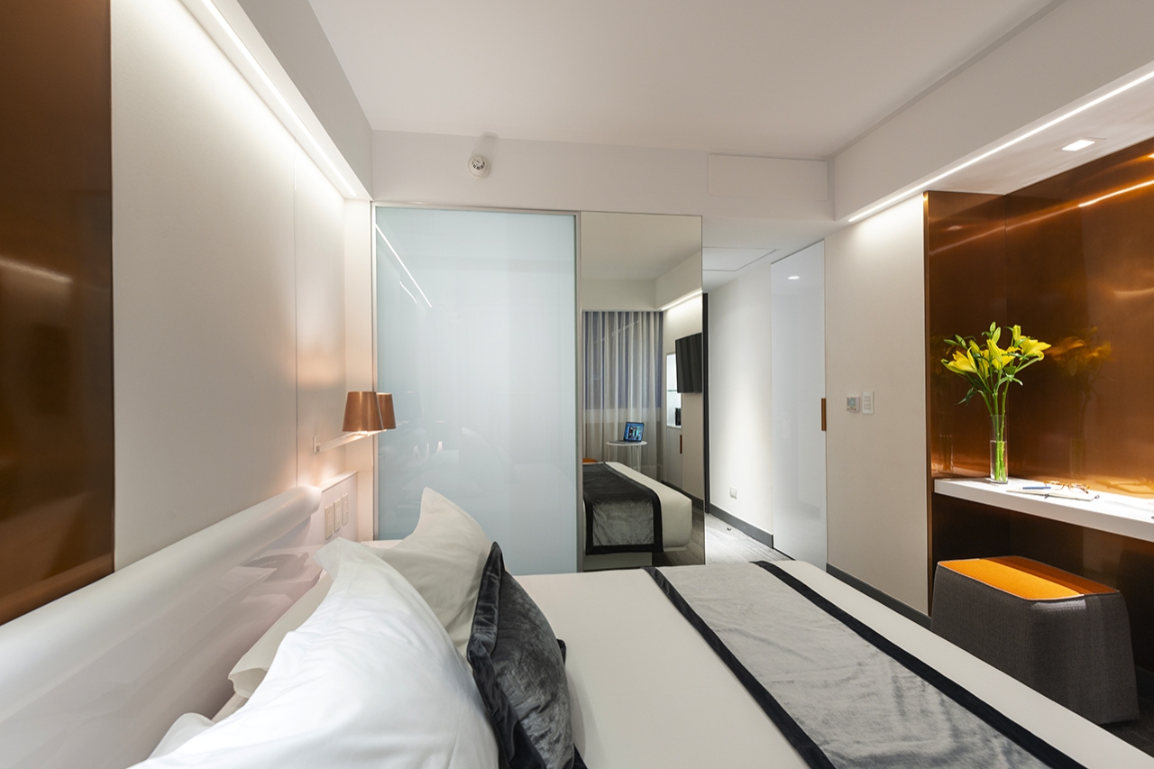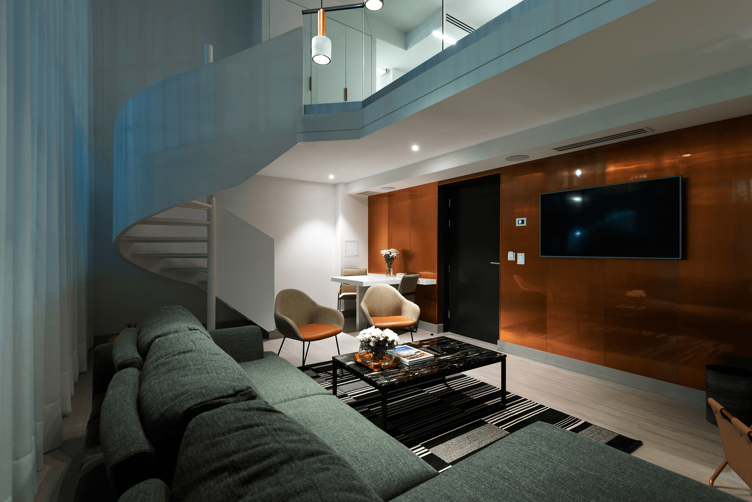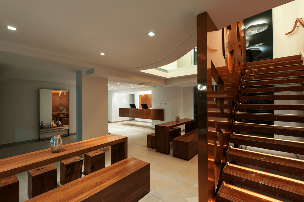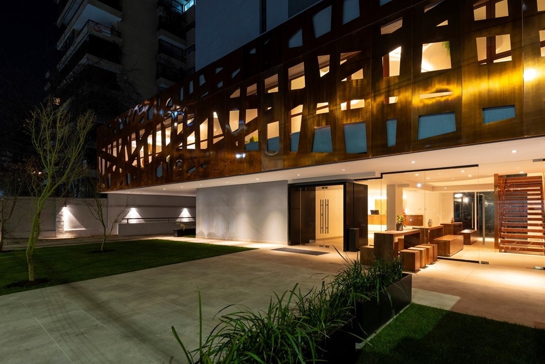The El Director Boutique Hotel sits in the urban part of Santiago, Chile. A design that stays true to the prominent resources local to Chile, copper balances the delicate complexity of embrace and reflection throughout its property. With copper as Chile's finest mineral, its unique color gave powerful inspiration to the design's texture. The combination of airy space, neutral tone porcelain tiles, and copper allow light to bounce off reflective surfaces, emitting a warm glow for a glamorous and affluent atmosphere, and sets the tone of exclusivity and modernity. Within, Olam Restaurant reveals an artistic organic design promoting its unique Scandinavian cuisine.
