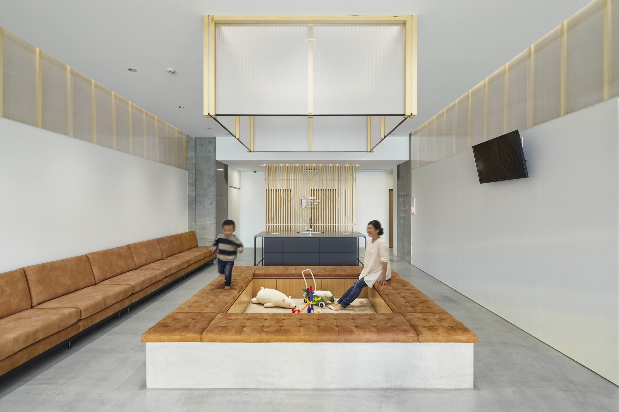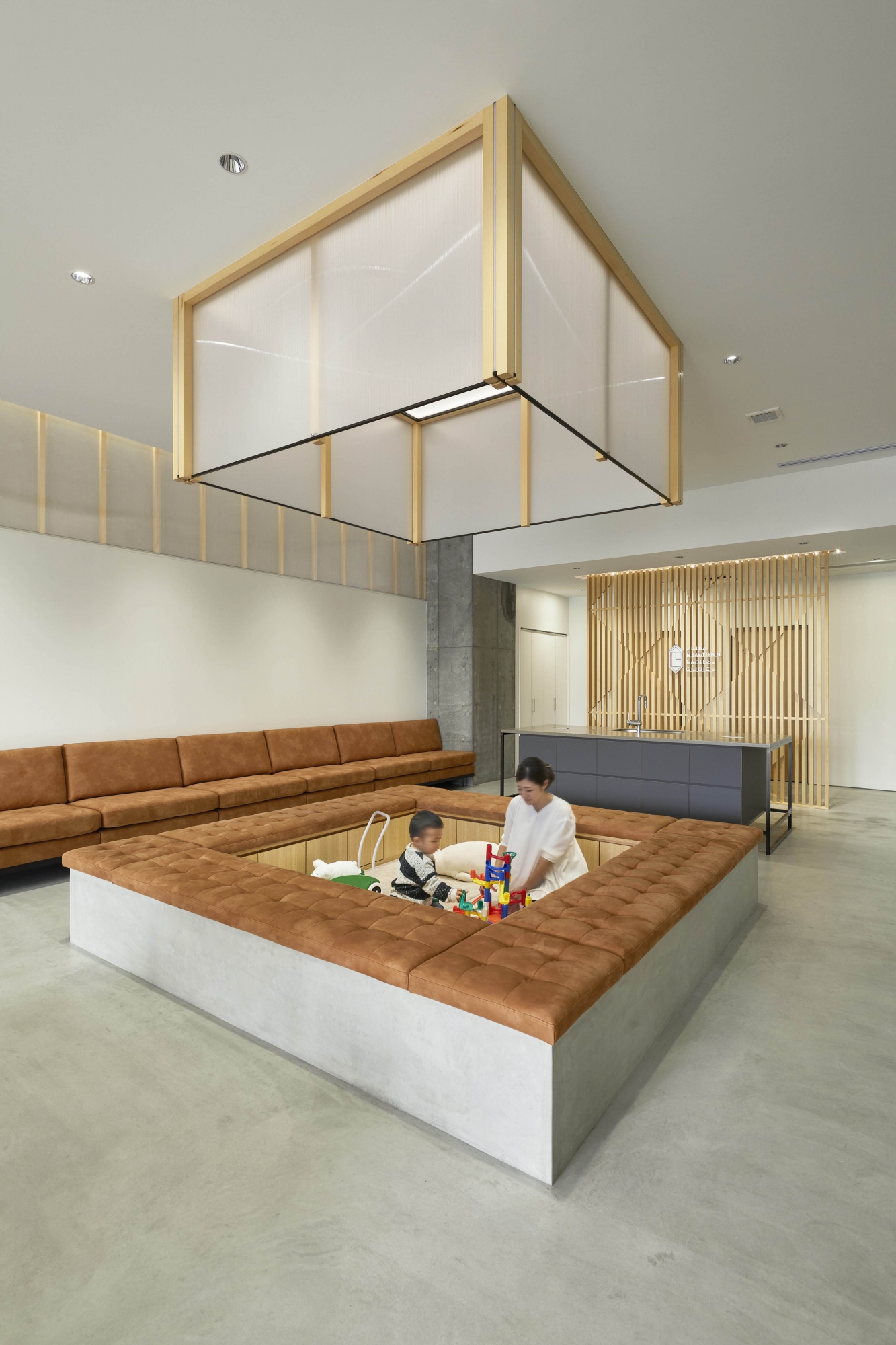 As a feature of space, In addition to the nursing room, a counter like island kitchen is set up so that you can make milk for baby in the waiting room. The kids area, which is at the center of the space, is a symbol of space and they can watch children from anywhere. A relaxing space like a living room also functions as a place for interaction between visitors.