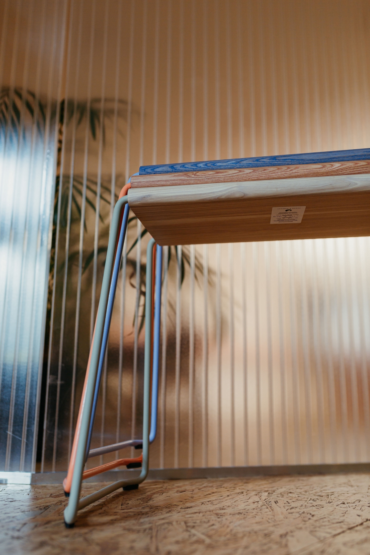 Elegant products, aesthetic colours, harmonious furniture that occupy their space with restraint and self-confidence. Clear lines made of steel and colored surfaces made of regional wood create lightness and space to breathe. The raw material wood comes from nearby forests, which give the company its name. The wood processing takes place in our wood workshop. Our surface oil consists of linseed oil and carnauba wax, vegetable products that are considered to be very quickly renewable. We mix our colors ourselves. 99.9% of the raw material steel is obtained from steel that has already been used. This is bent in our metal workshop and powder-coated for a particularly long service life. As a result, the steel parts are protected against the weather, are extremely hard-wearing and can be used outdoors. All products without armrests are stackable.
