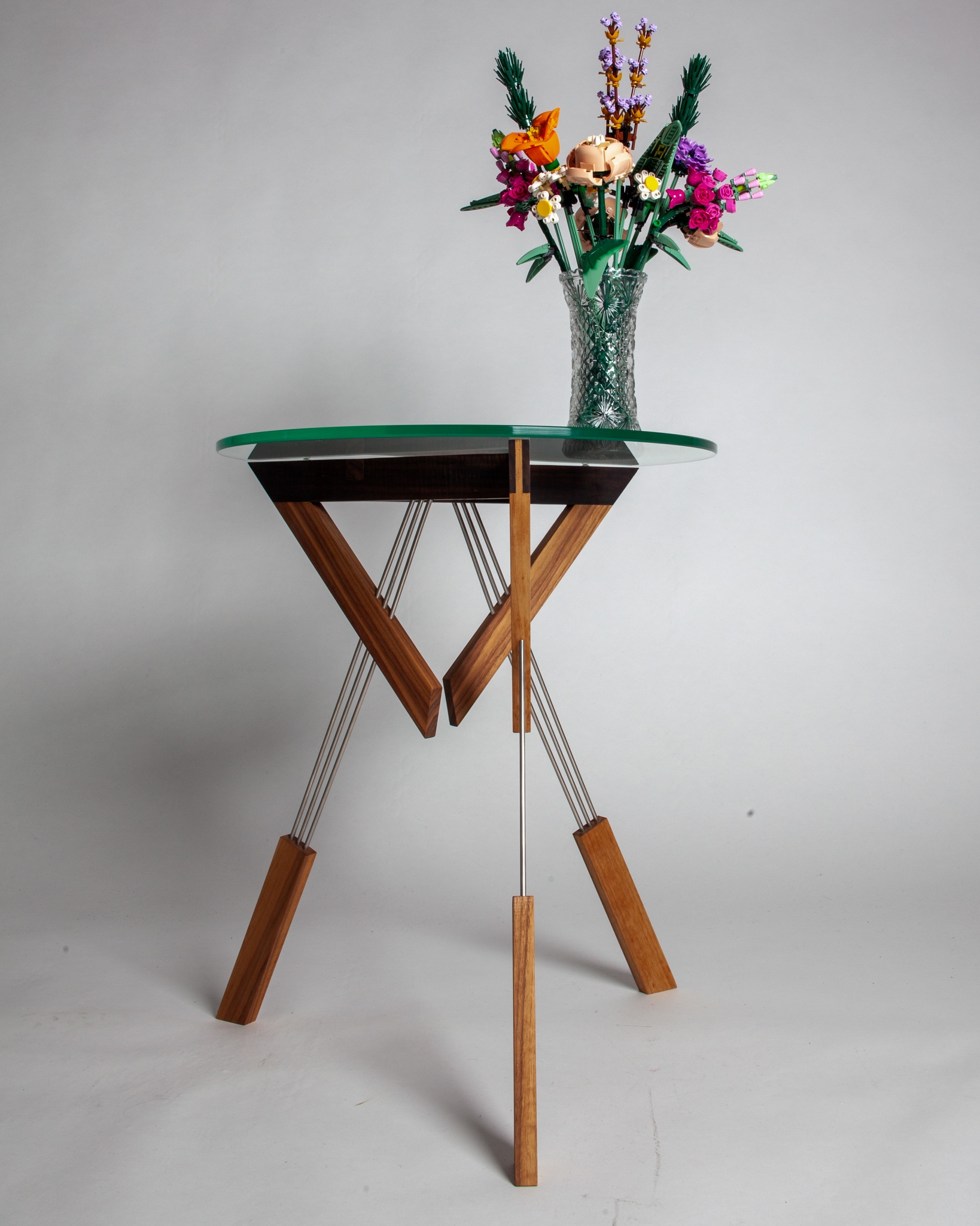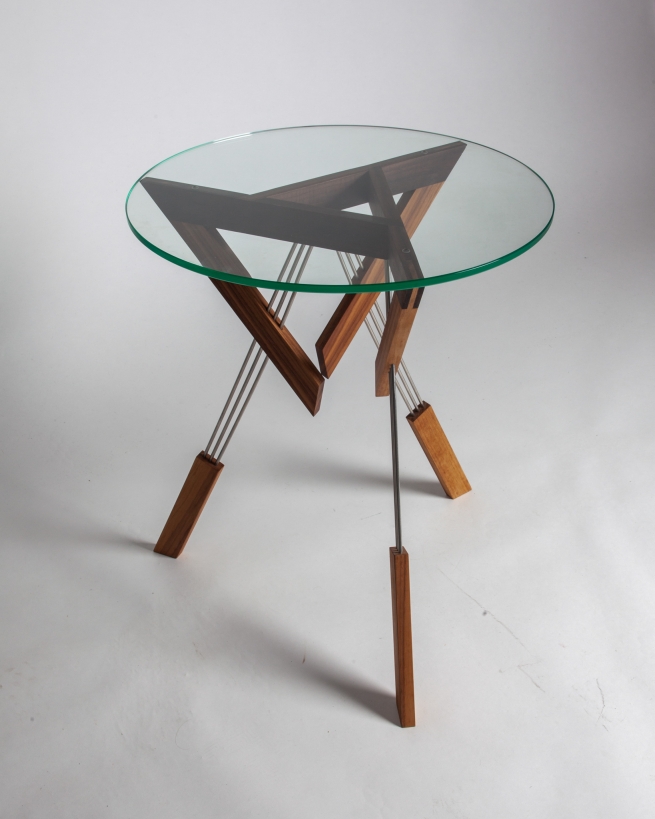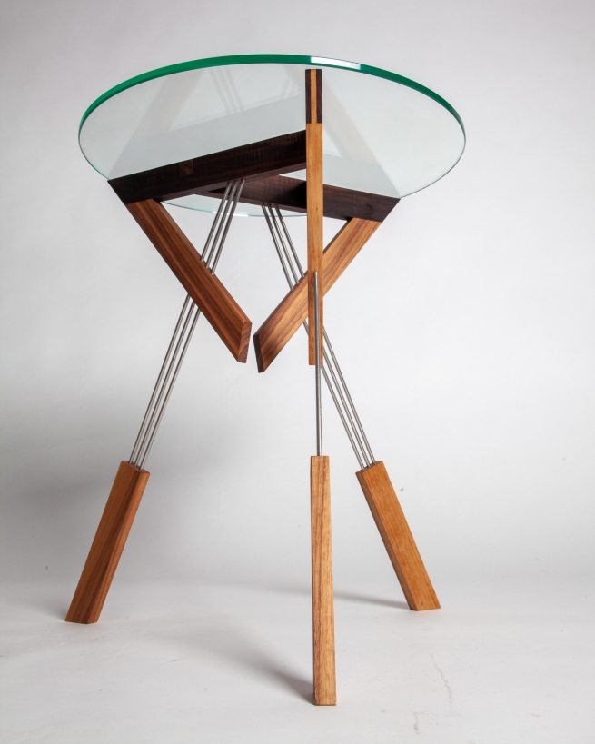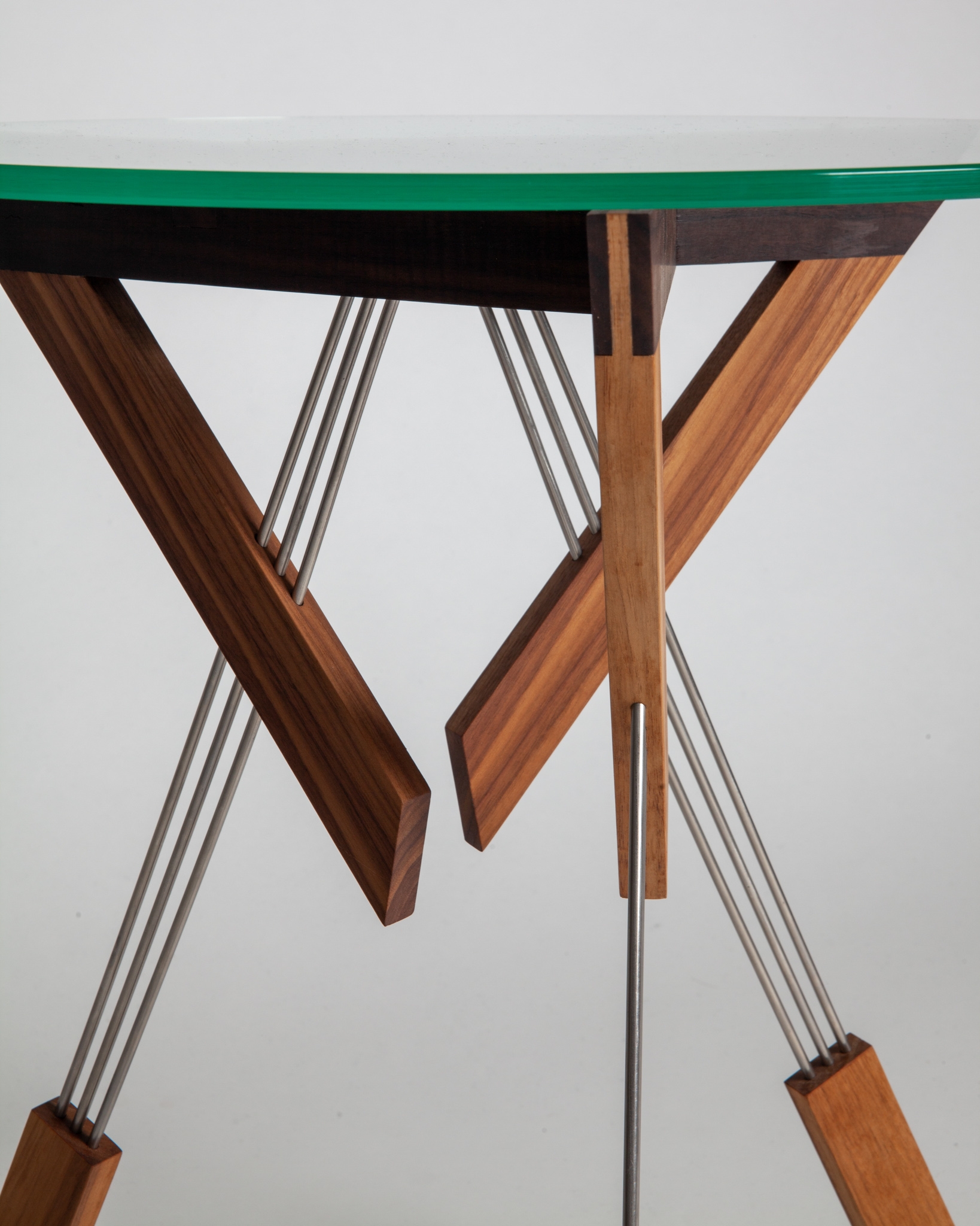 With this project I tried to rethink the classic coffee table design. The mix between wood and stainless steel blends in naturally with the room and creates an abstractly floating surface. Contradicting lines give the design its edgy look. The glas on top invites a look on the frame and because its transparency doesn't occupy as much visual room.