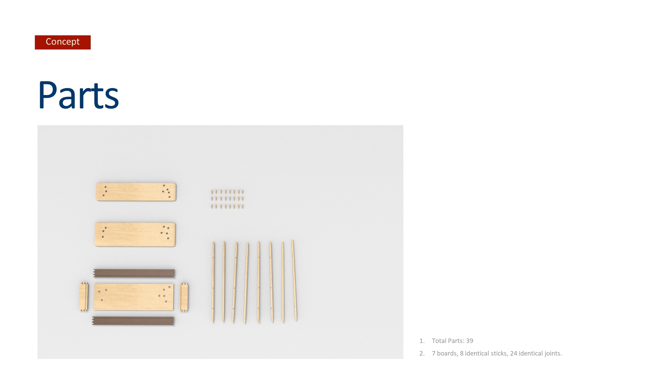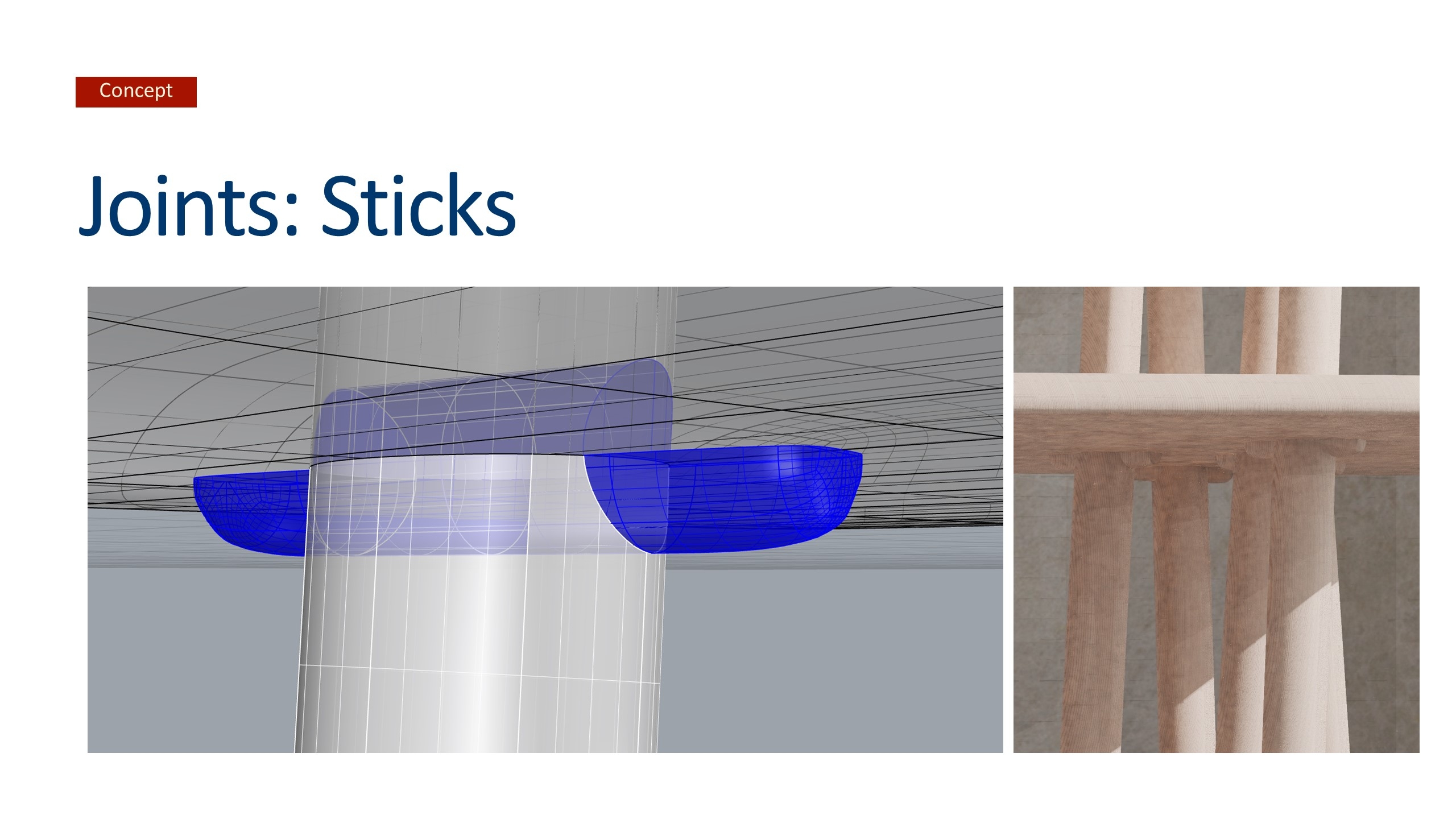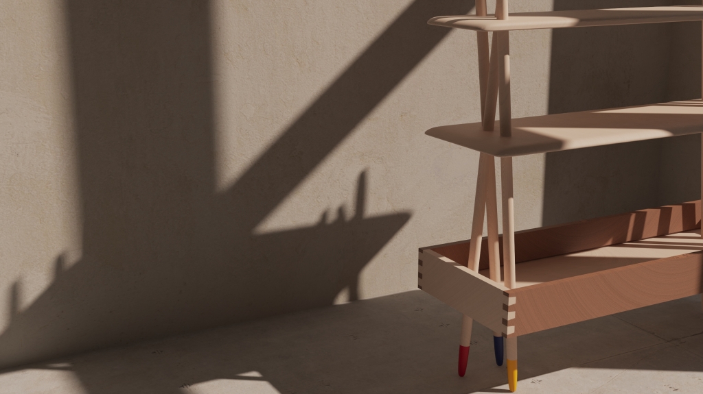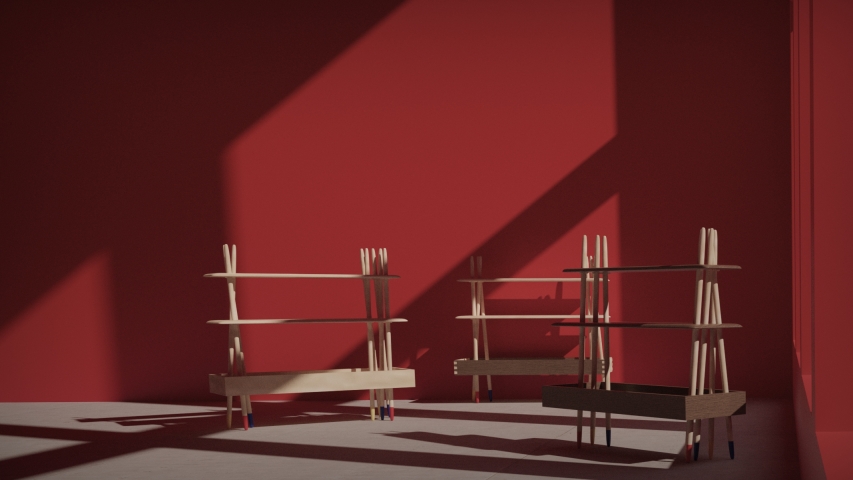 The shelf is inspired by the Mikado game or the pick-up stick game. I appreciate the randomness of the sticks, the colorful strips on the sticks, the process of choosing the right stick to pick up and move it without touching the others. So, I want to duplicate the process and visuals.