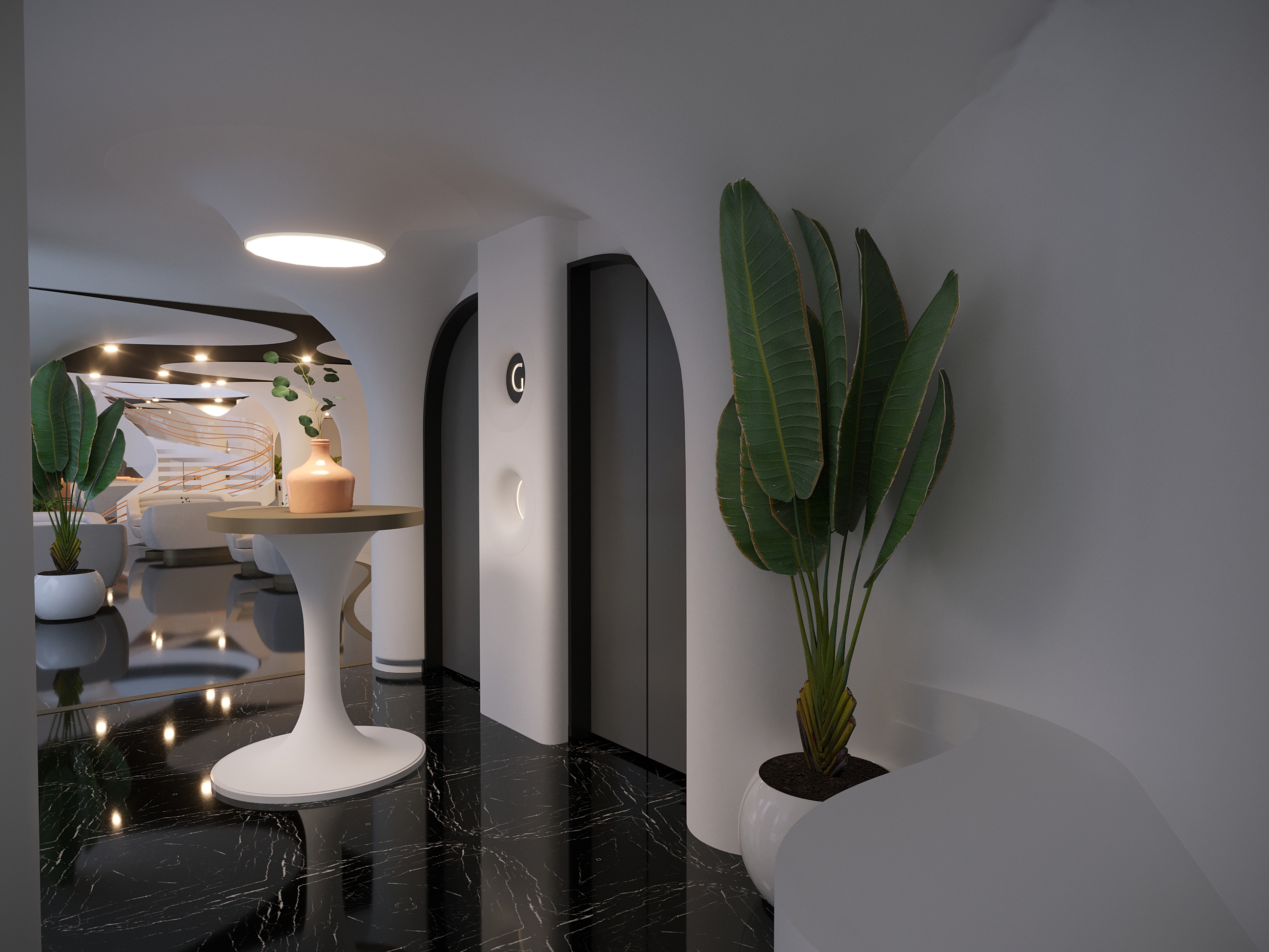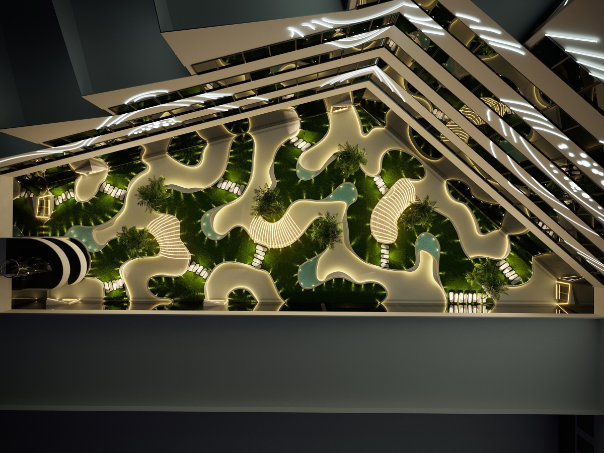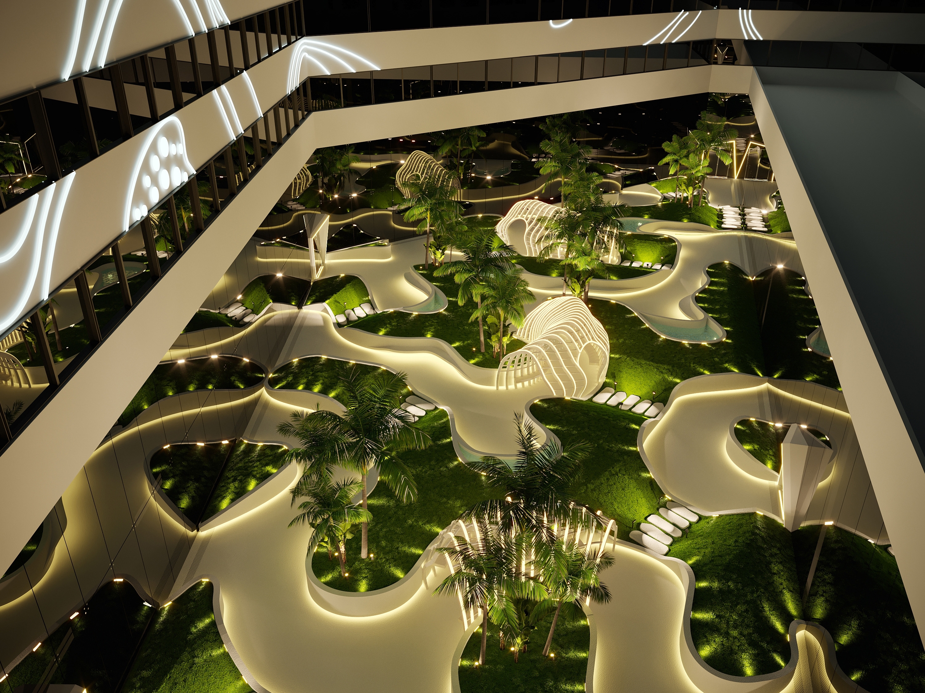 The design of the Mercury hotel garden comes from the world under the sea like corals and fishes, which are the first things that appear in your eyes while your fit touches the Persian gulf water on the beach around Kish Island. The goal is to bring a sense of sea calm into the hotel. At night, the lighting of the coral garden reminds the experience of walking on the beach with the view of bioluminescence creatures that can be found in the sea line of the Persian Gulf.
