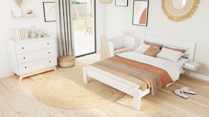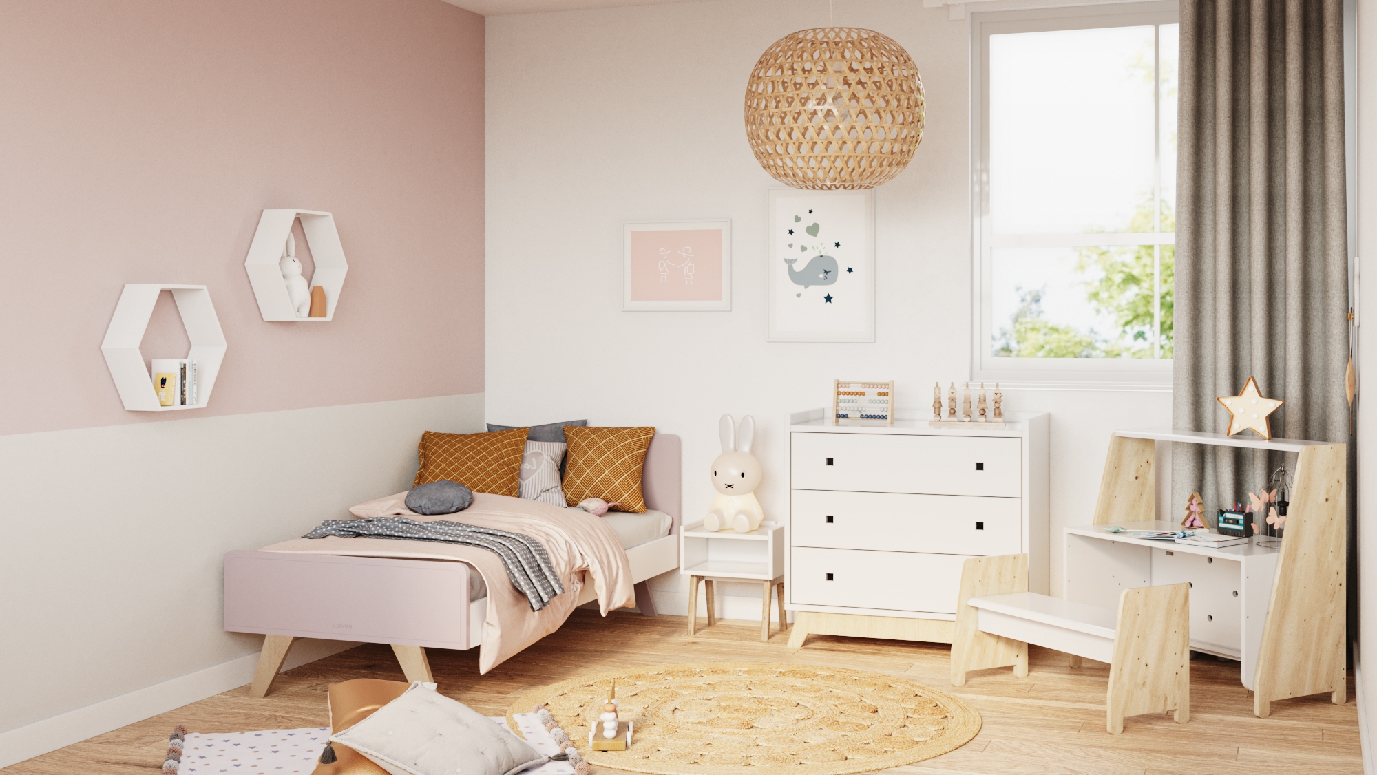 Our Asymetry collection enables to develop the autonomy and motor skills of the child from an early age by offering scalable furniture adapted to the height of the child. This collection is composed of a wardrobe, a shelf, a desk with a bench, a co-sleeper and a learning tower. The child can easily access to his belongings, choose by himself and make his own decisions independently.