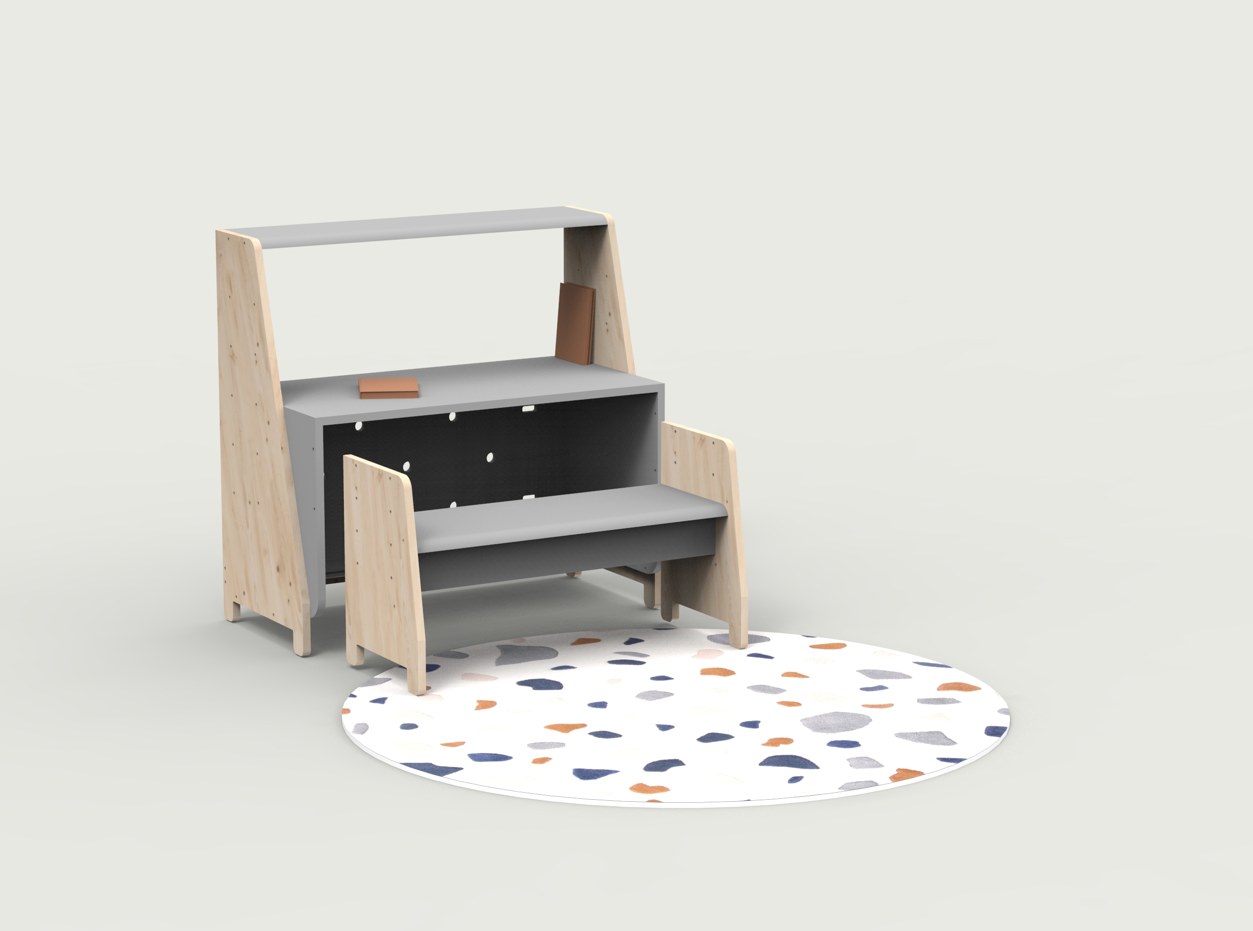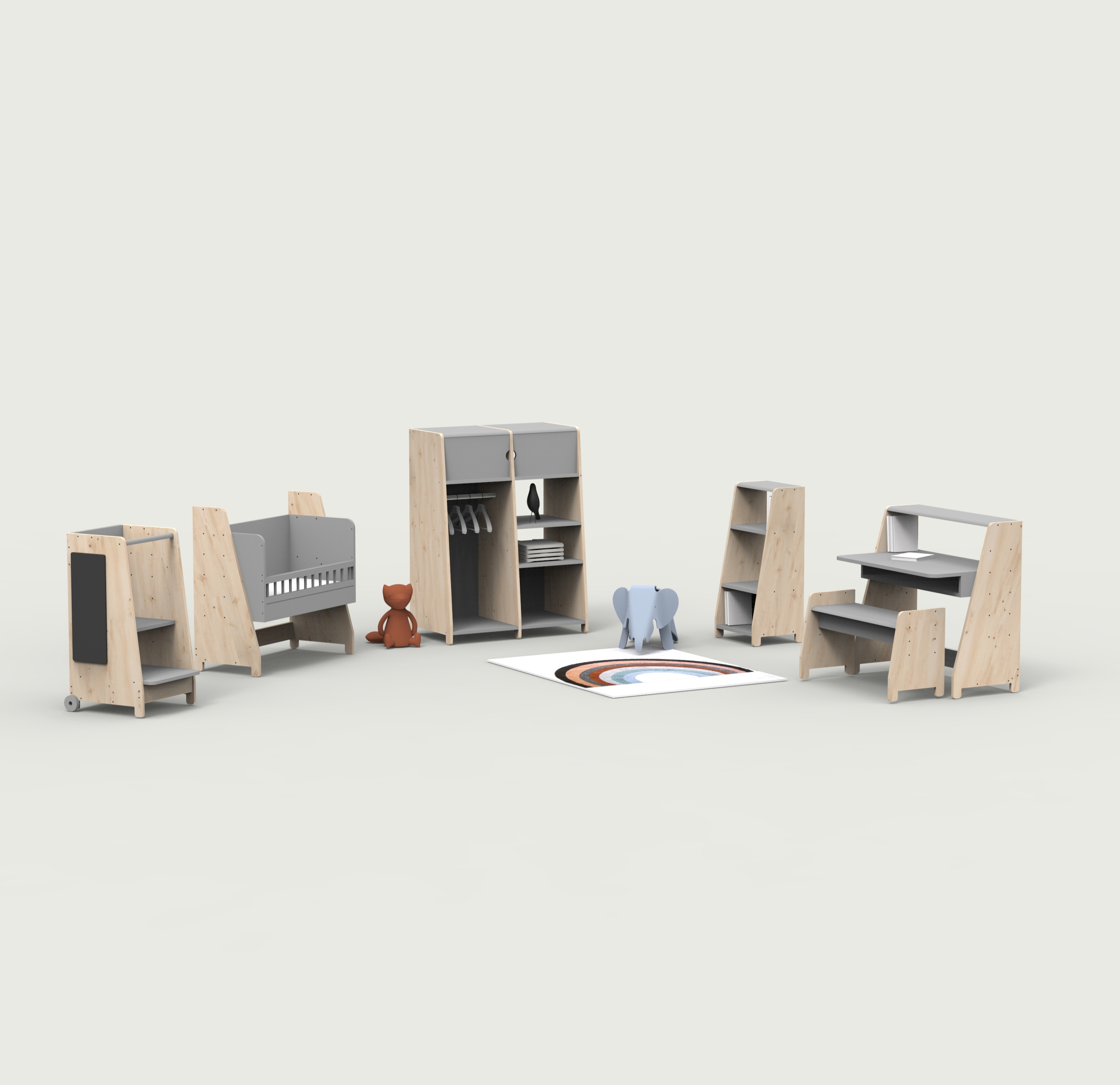 Two of our Asymetry products evolve and change functions : the co-sleeper evolves in a bench or a small desk and our learning tower evolve in a shelf and can be used in the kid's bedroom.